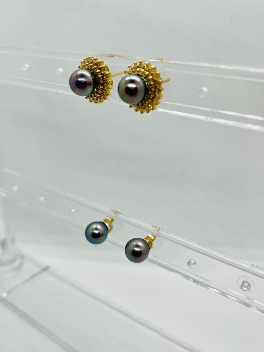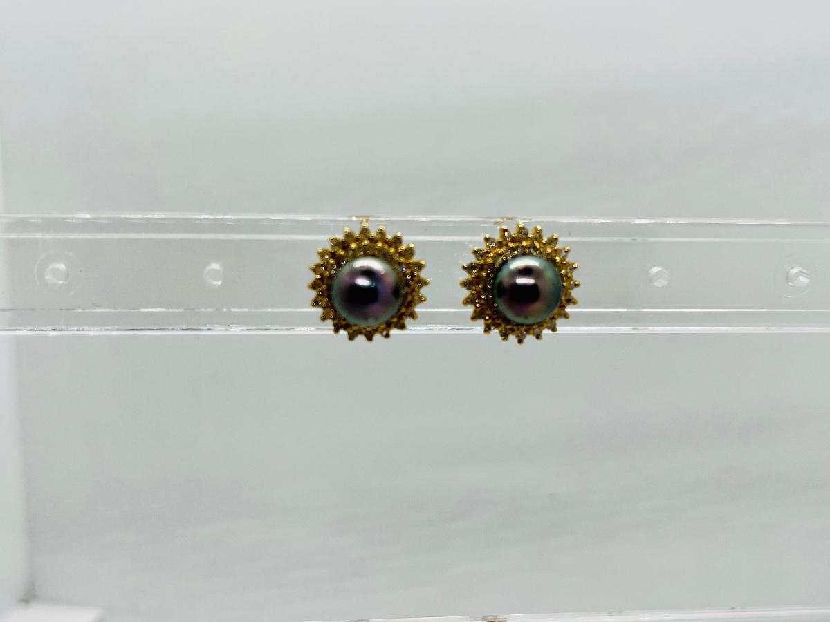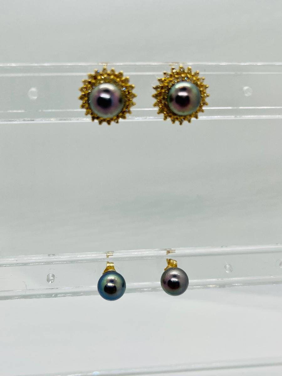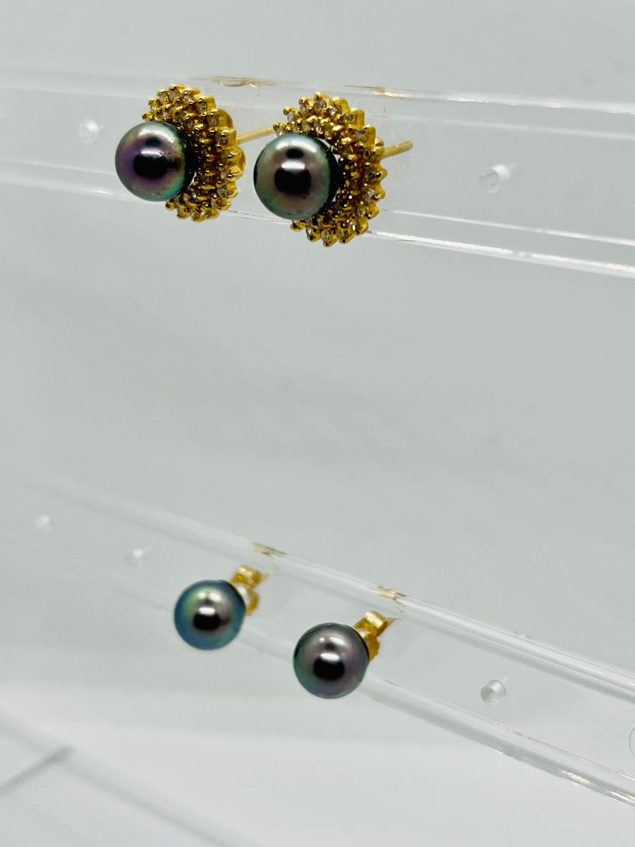 Lot 91: 14k cultured pearl earrings, one pair surrounded with a halo of Diamond chips