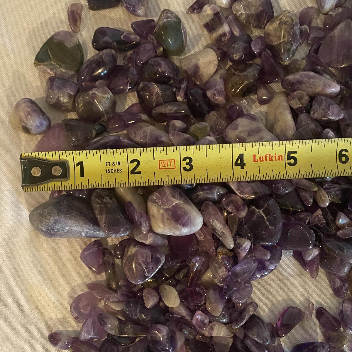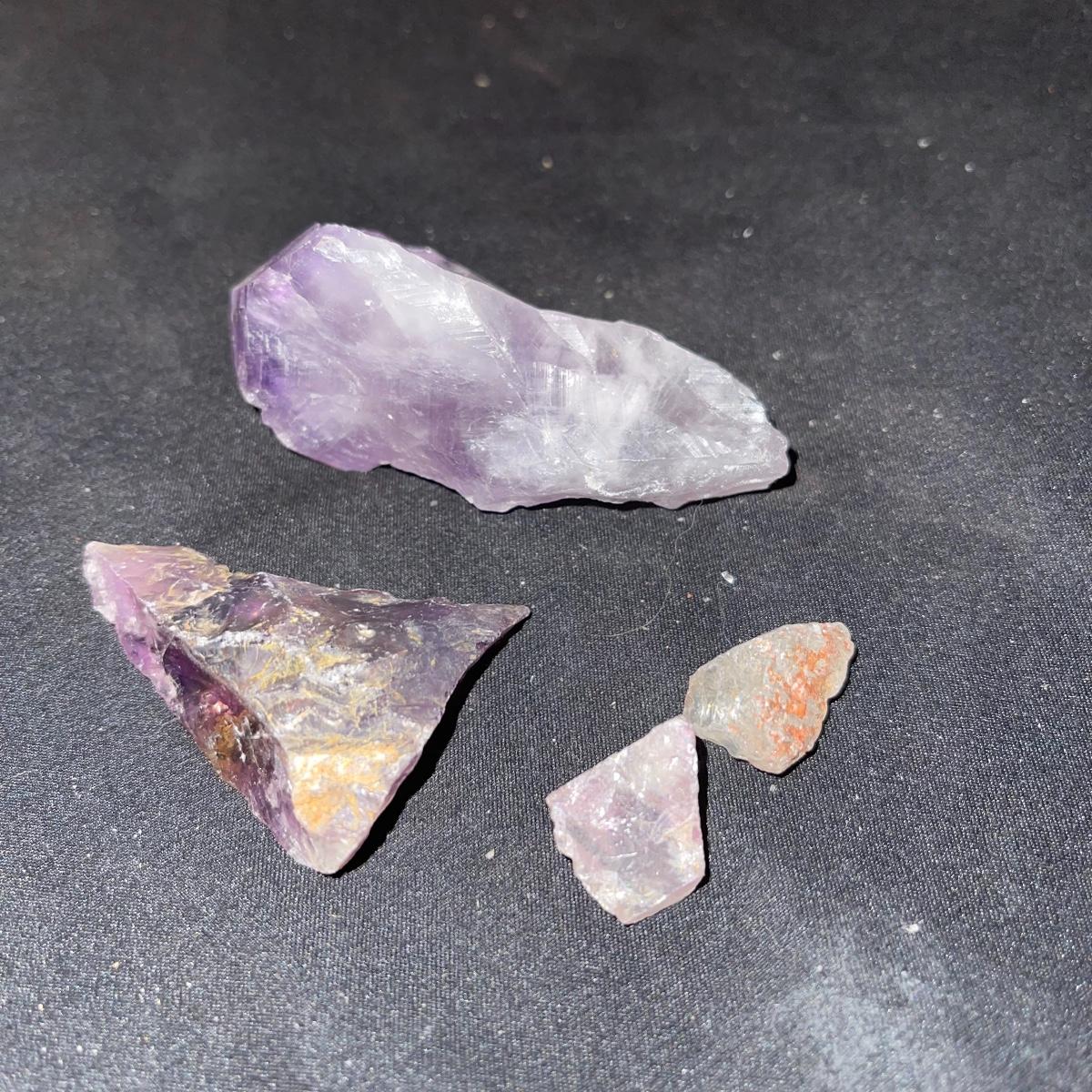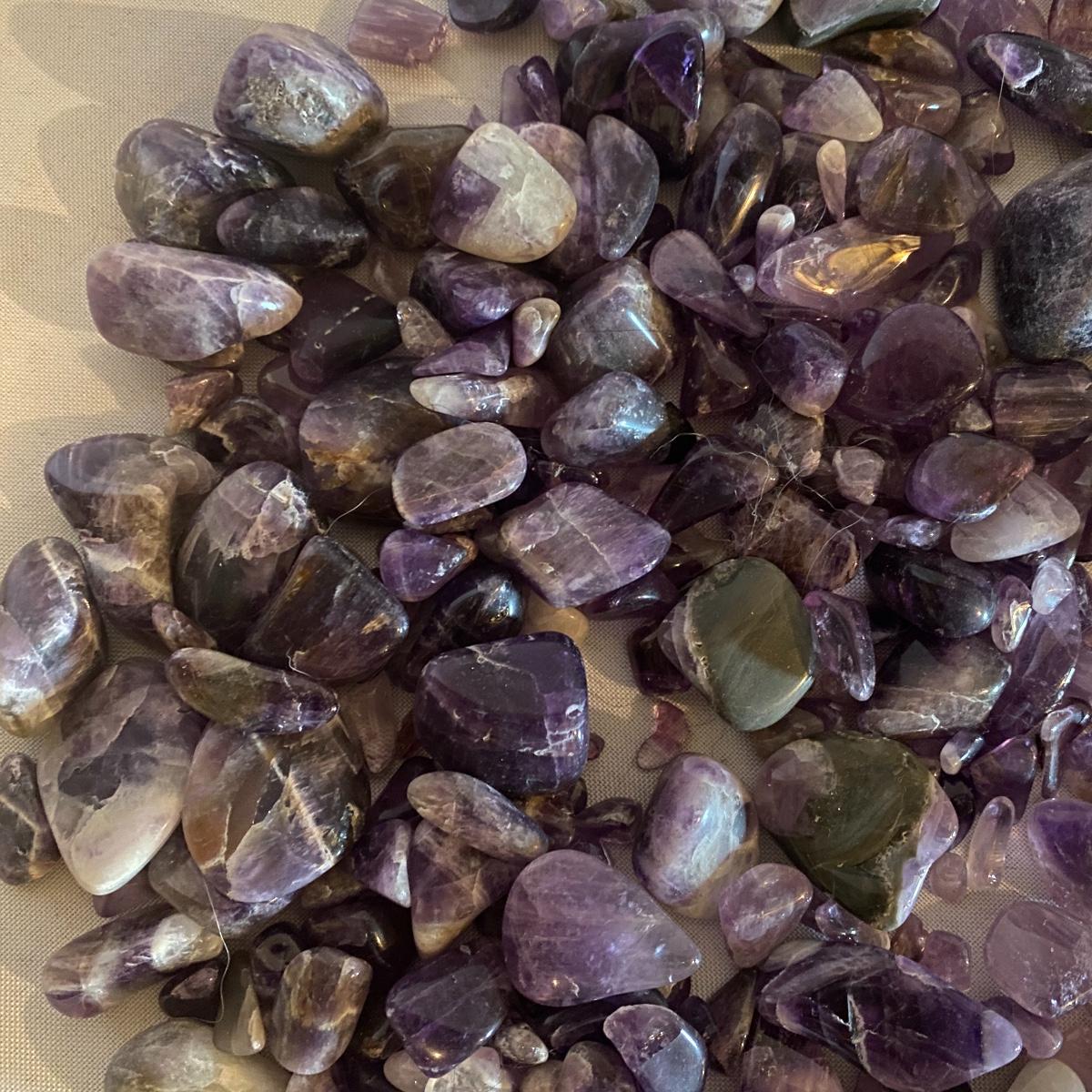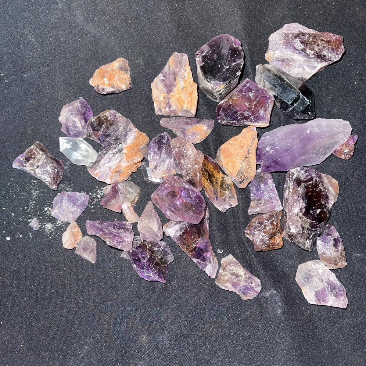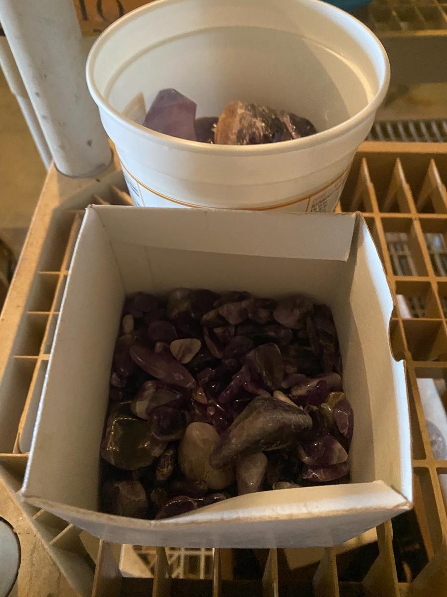 In this amethyst collection, the largest stone measures 2” x 2.25” x 1”. Many shades of purple and gray are the colors of these amethyst. There are a few that are more pink than purple and one that is black. Box of polished amethyst too.