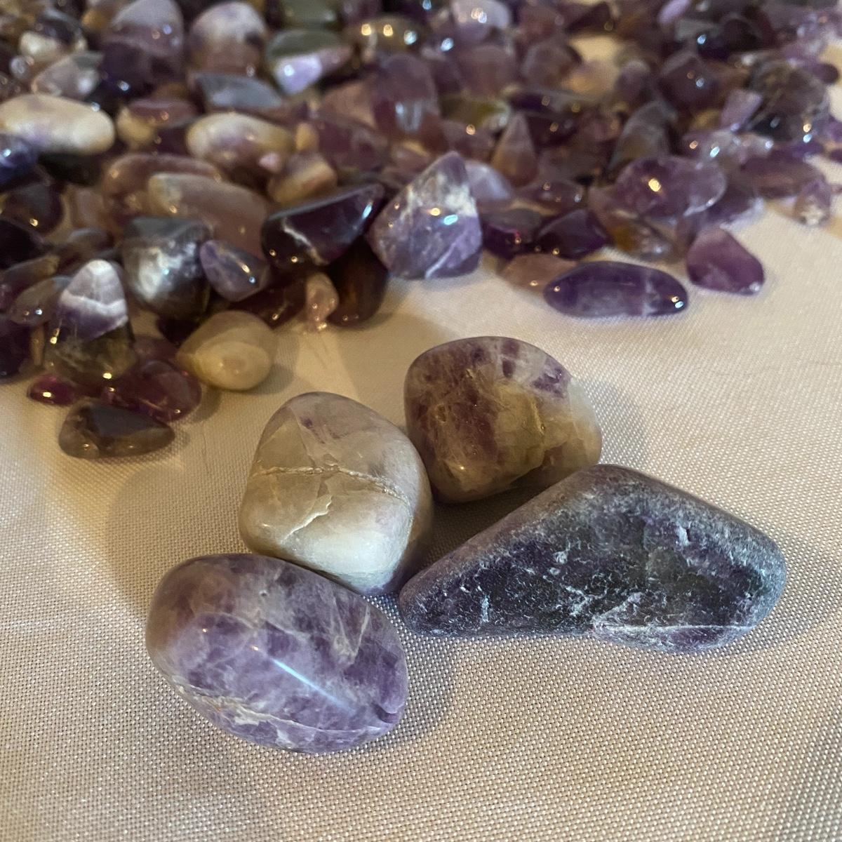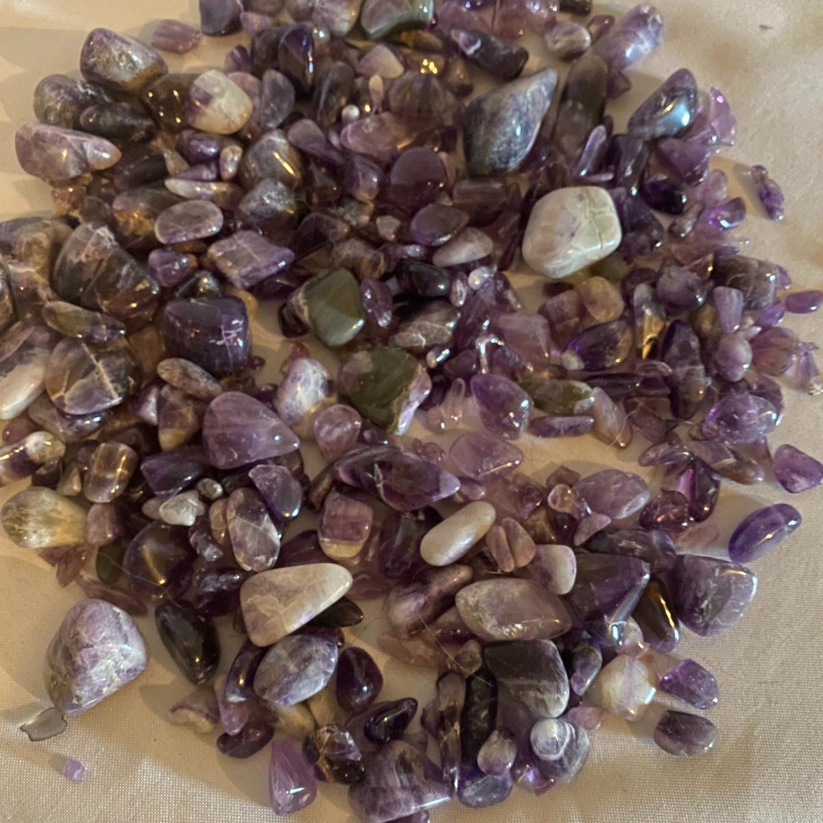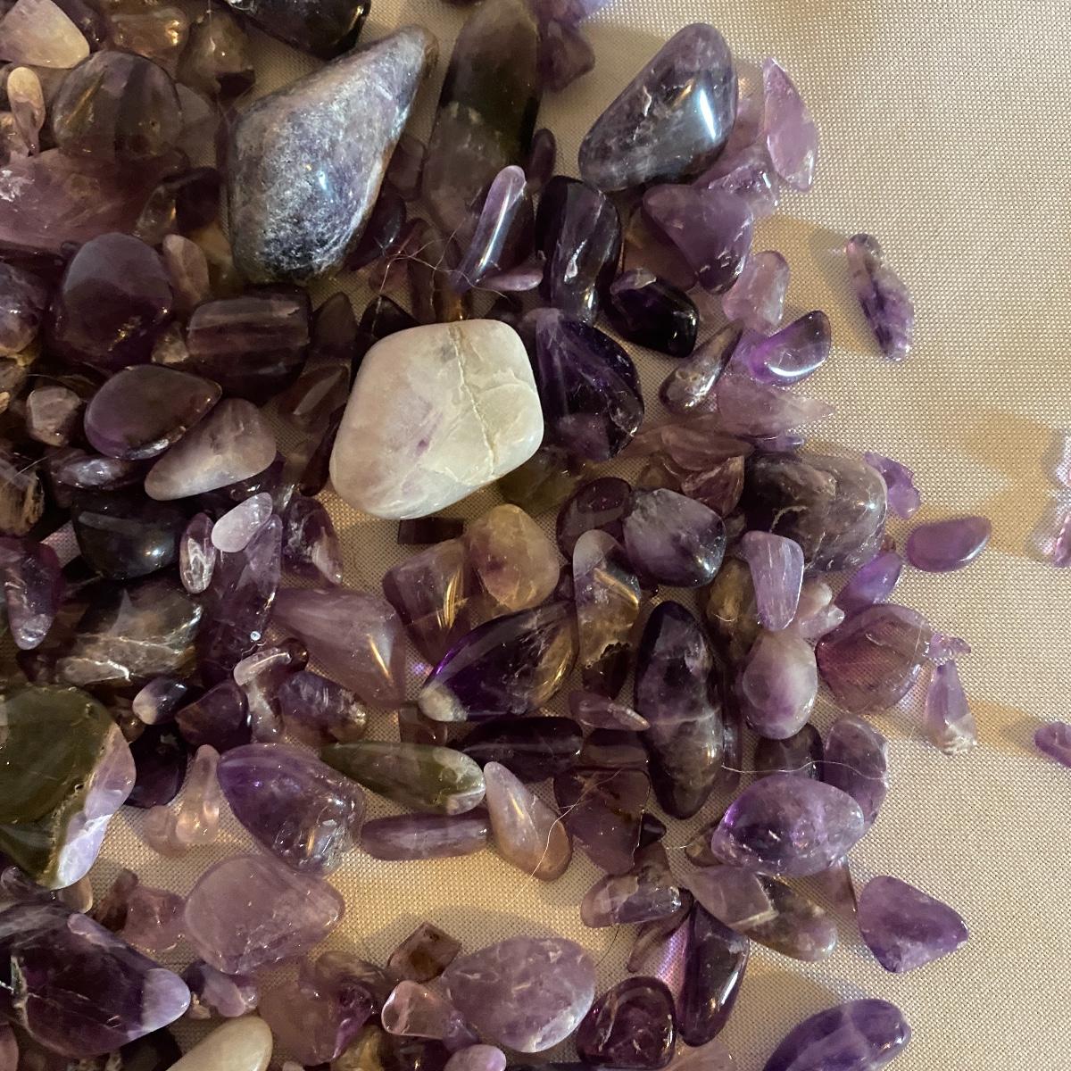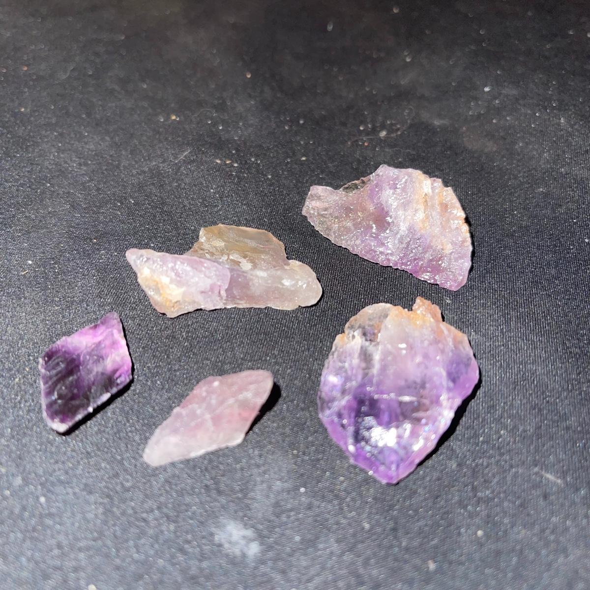 In this amethyst collection, the largest stone measures 2” x 2.25” x 1”. Many shades of purple and gray are the colors of these amethyst. There are a few that are more pink than purple and one that is black. Box of polished amethyst too.