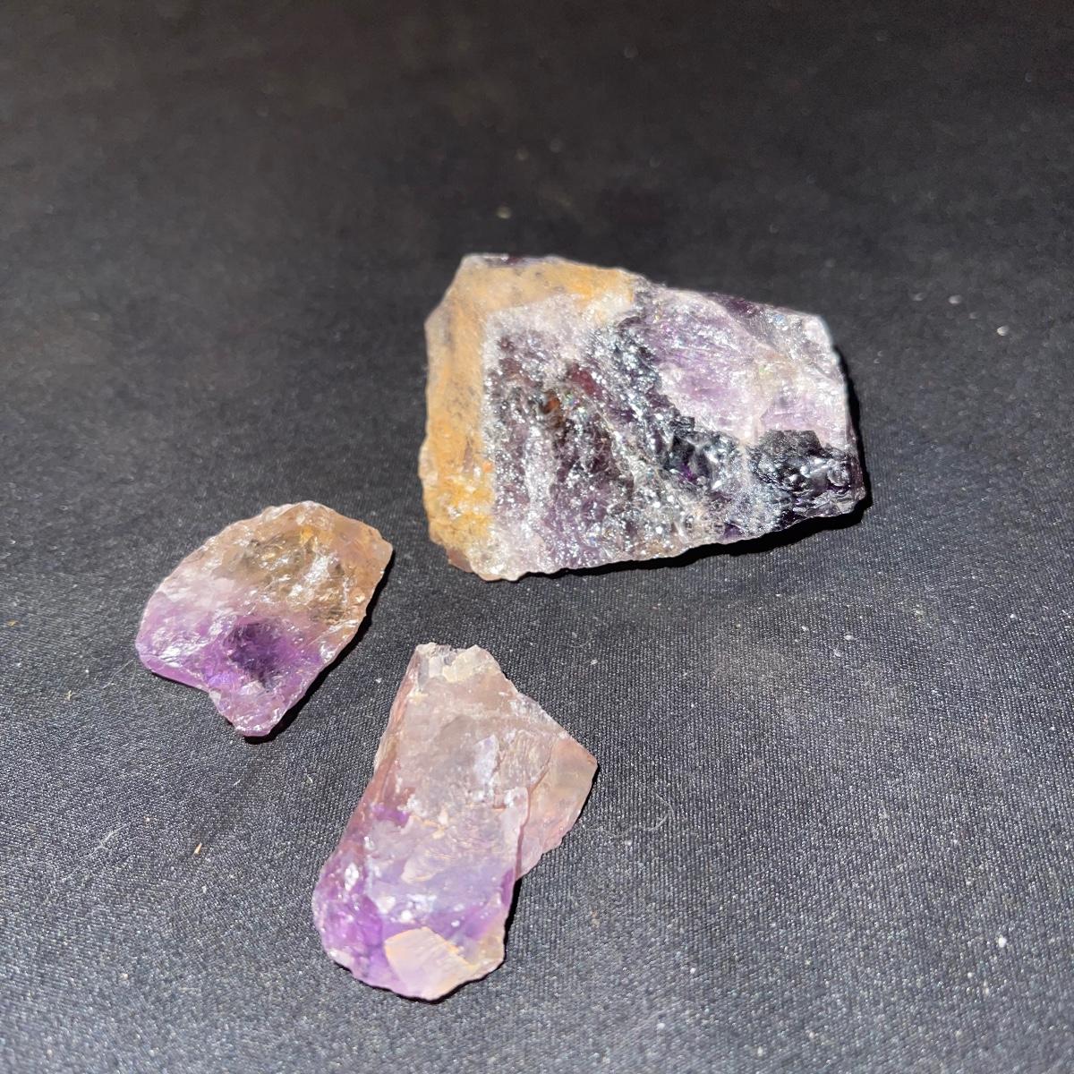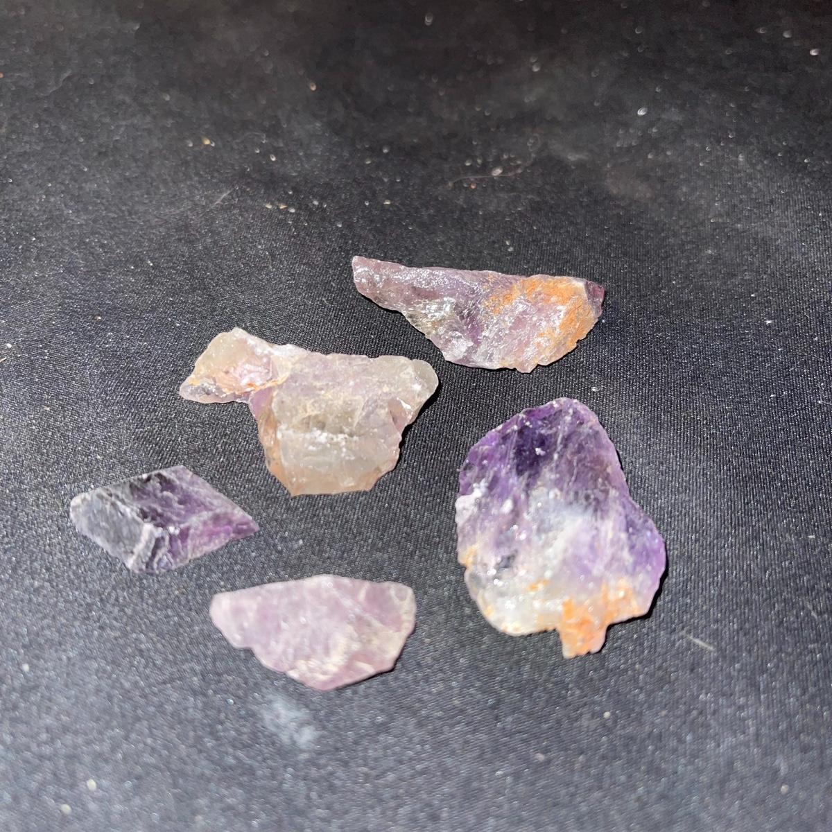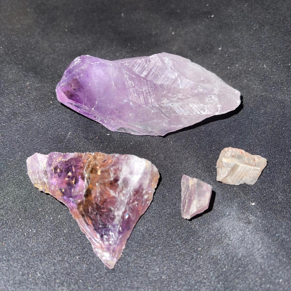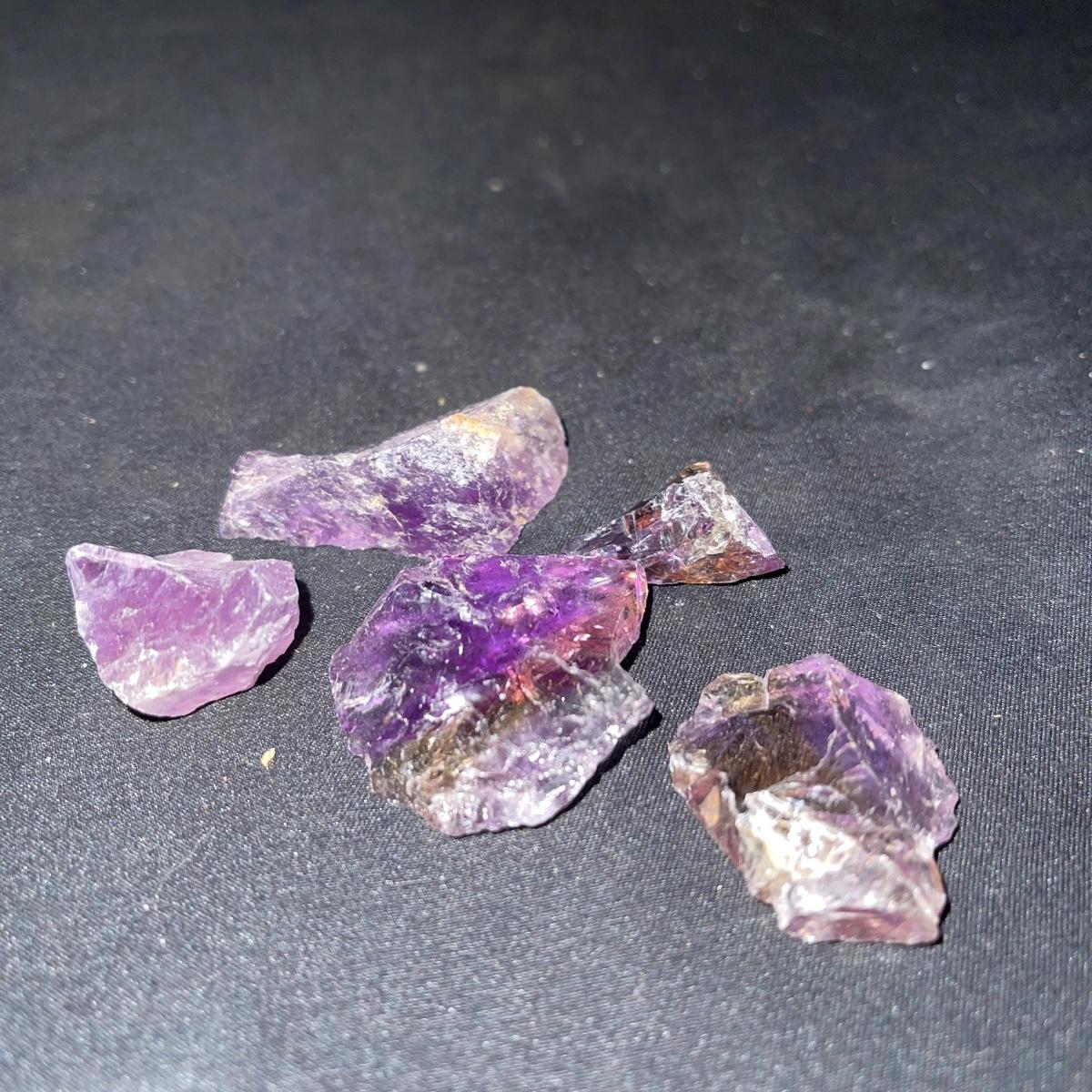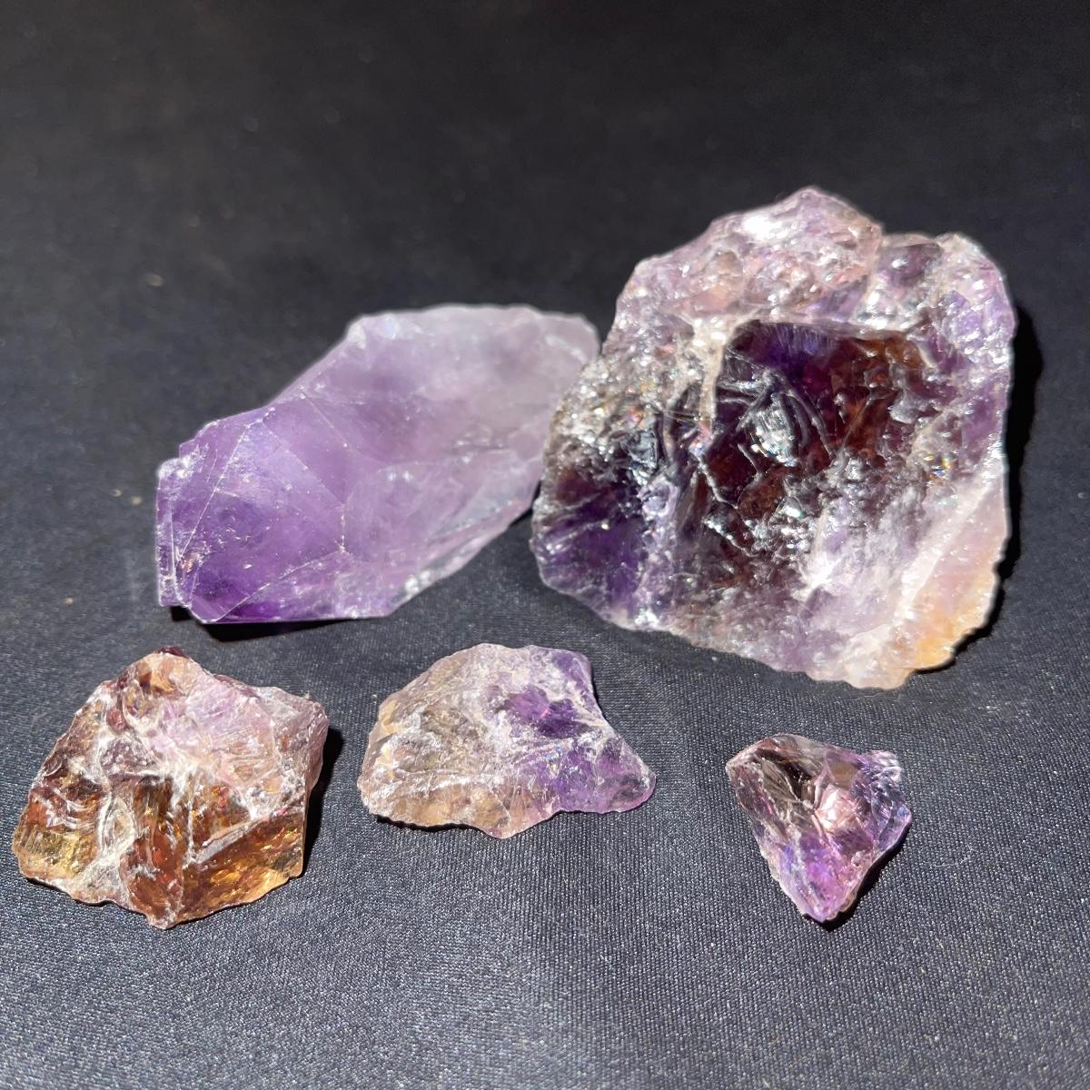 In this amethyst collection, the largest stone measures 2” x 2.25” x 1”. Many shades of purple and gray are the colors of these amethyst. There are a few that are more pink than purple and one that is black. Box of polished amethyst too.
