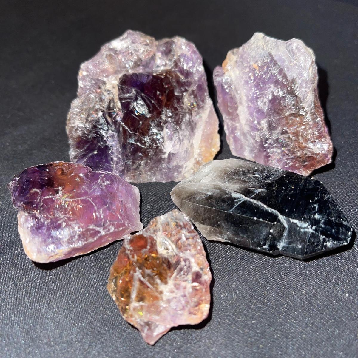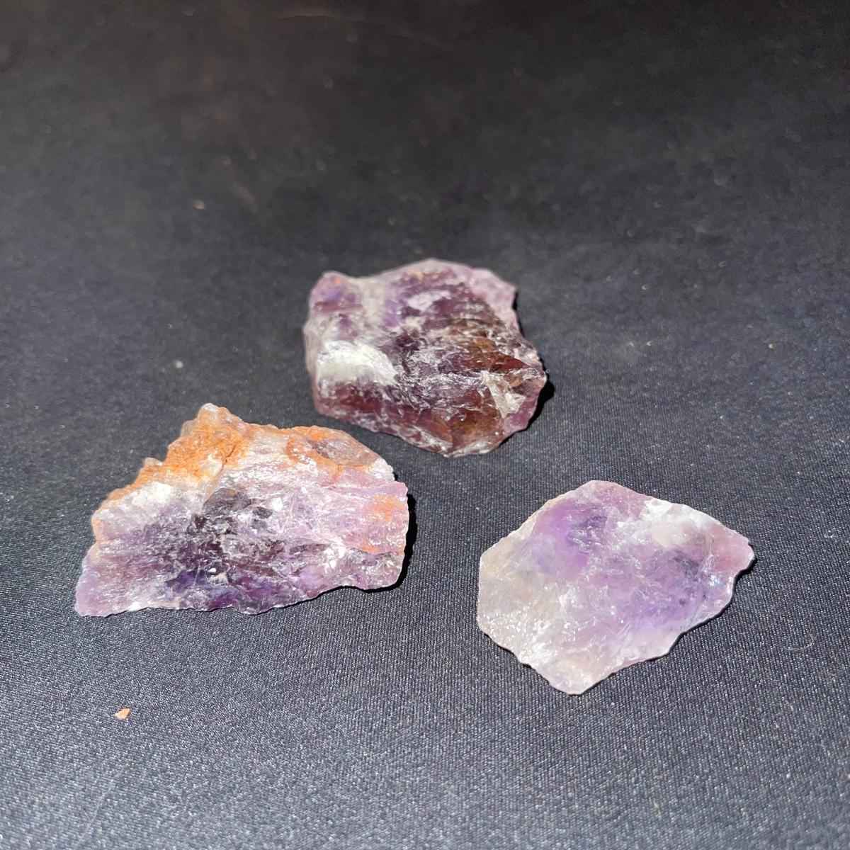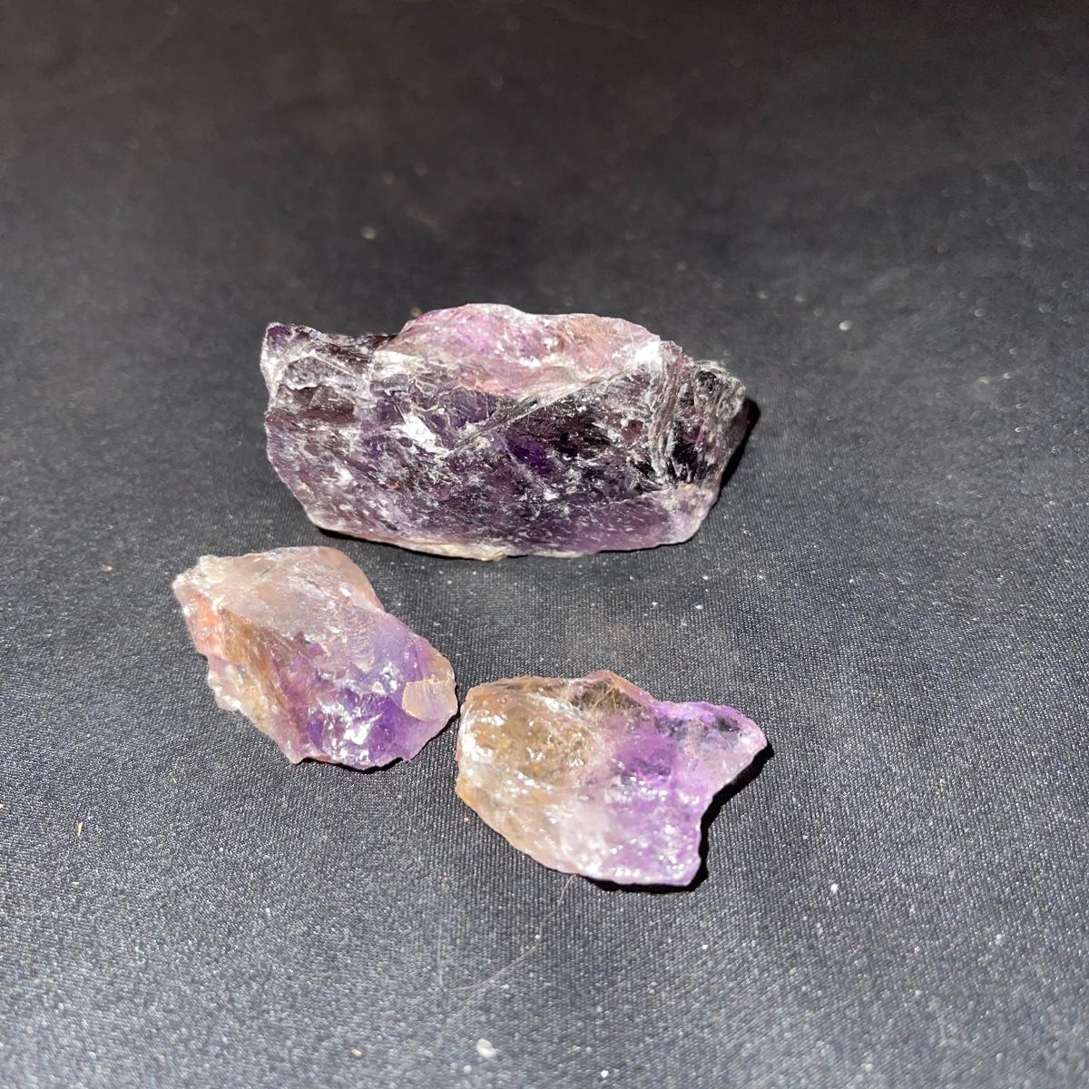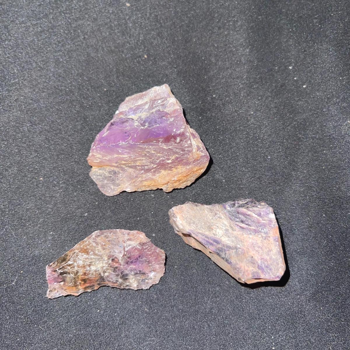 In this amethyst collection, the largest stone measures 2” x 2.25” x 1”. Many shades of purple and gray are the colors of these amethyst. There are a few that are more pink than purple and one that is black. Box of polished amethyst too.