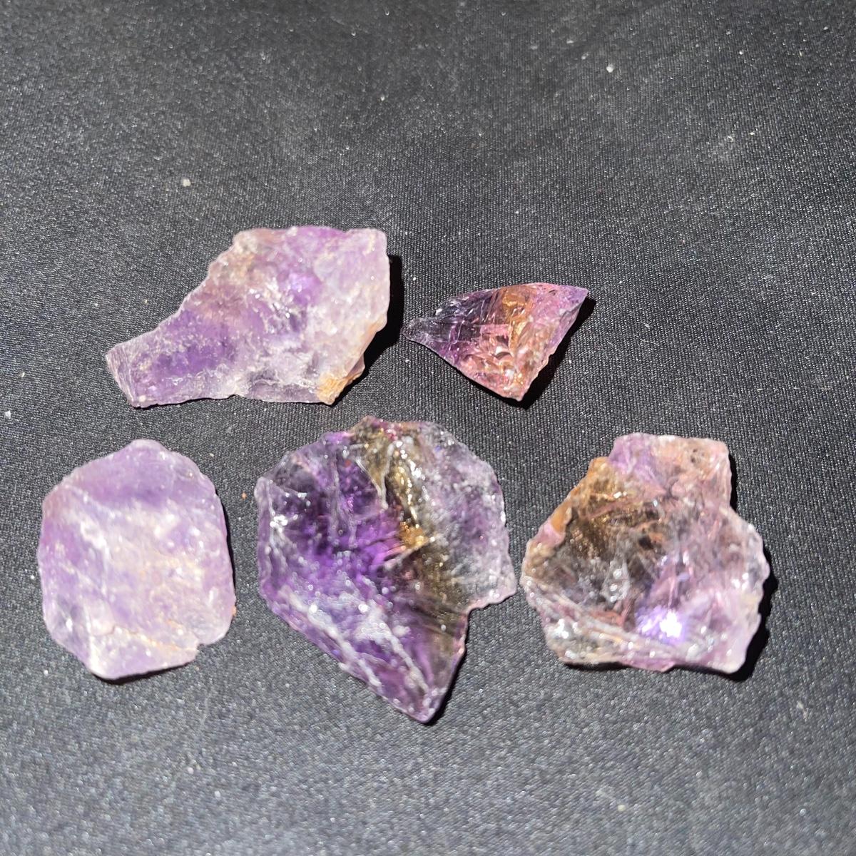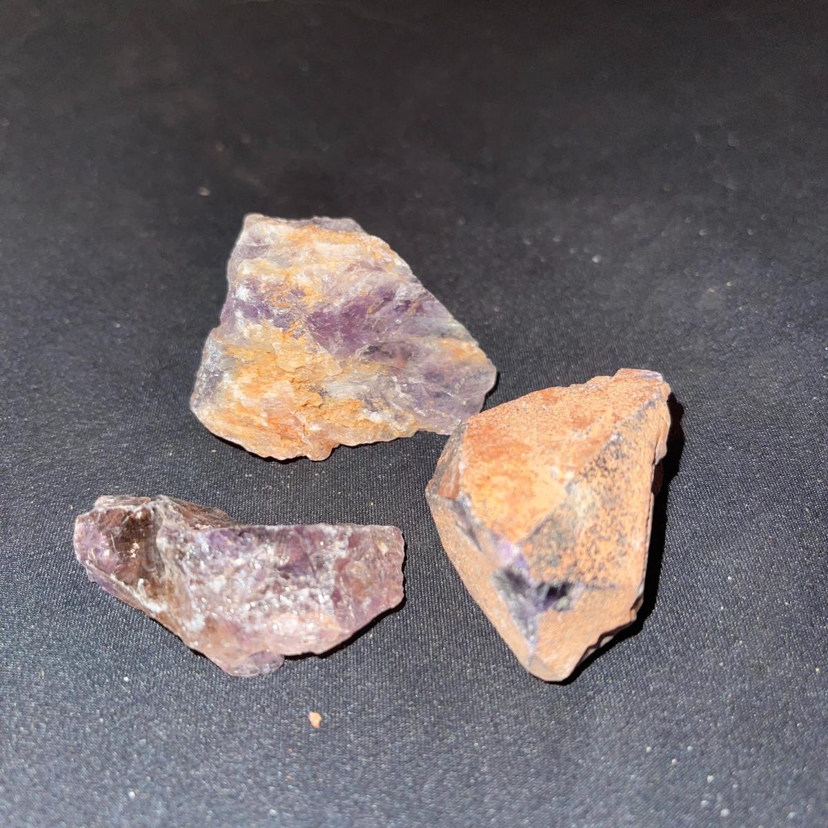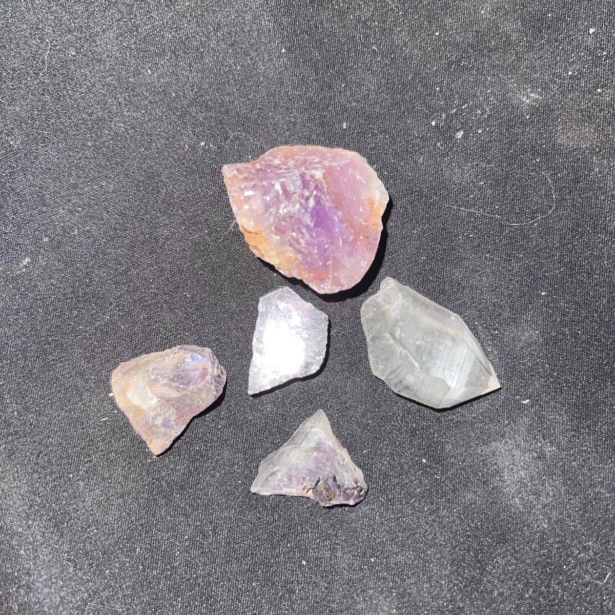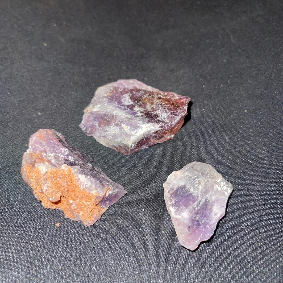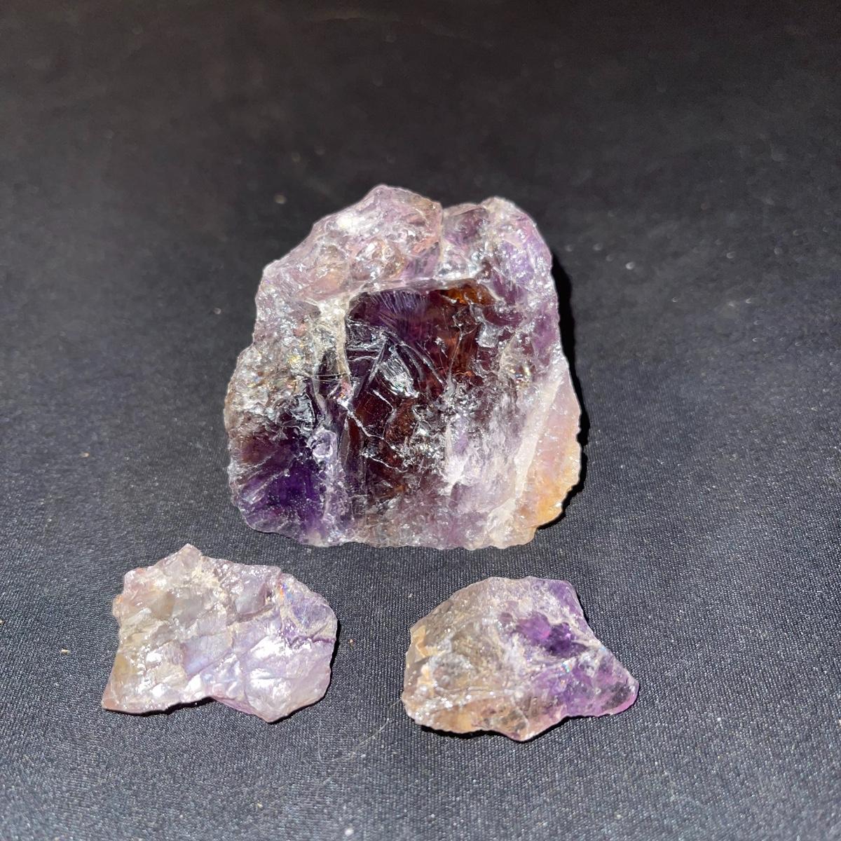 In this amethyst collection, the largest stone measures 2” x 2.25” x 1”. Many shades of purple and gray are the colors of these amethyst. There are a few that are more pink than purple and one that is black. Box of polished amethyst too.