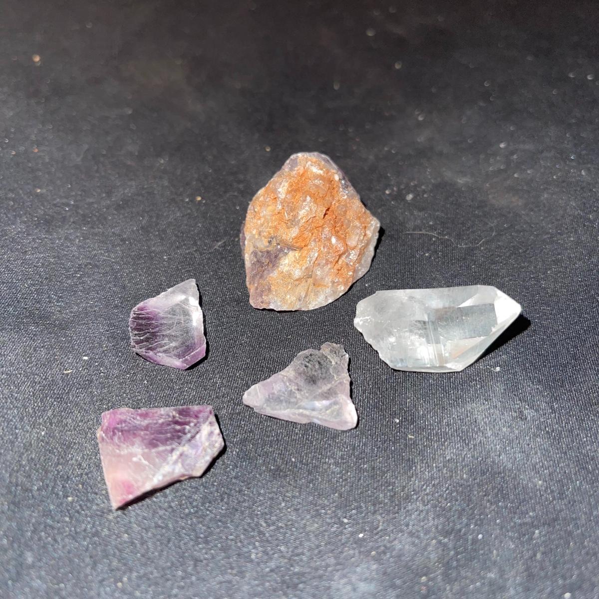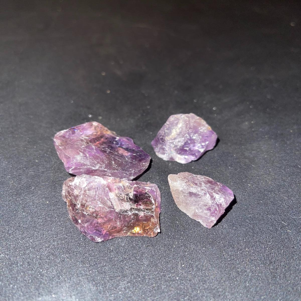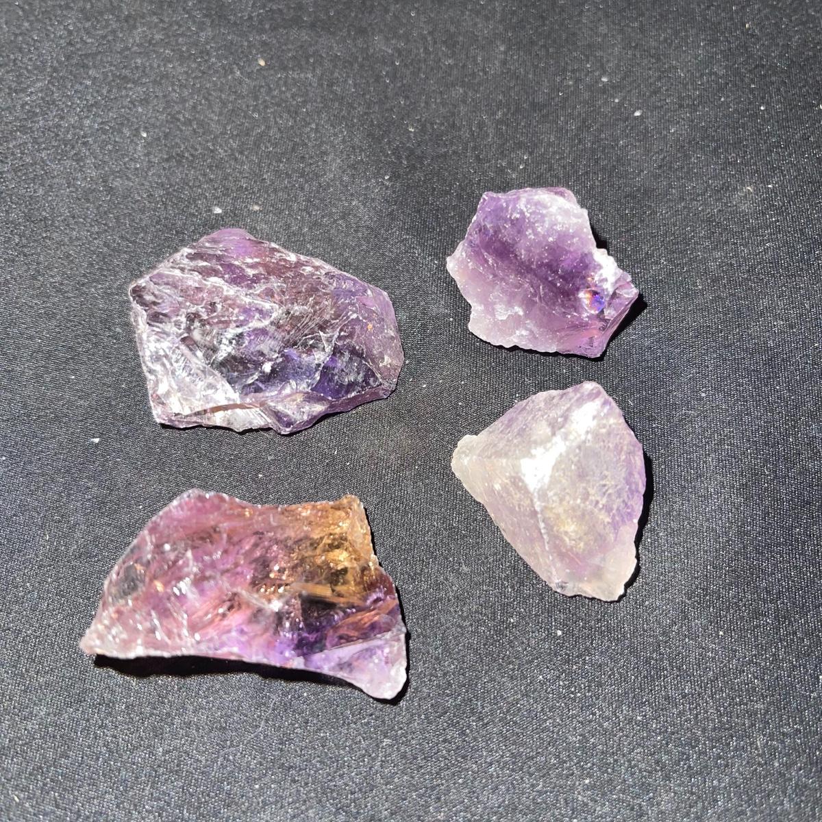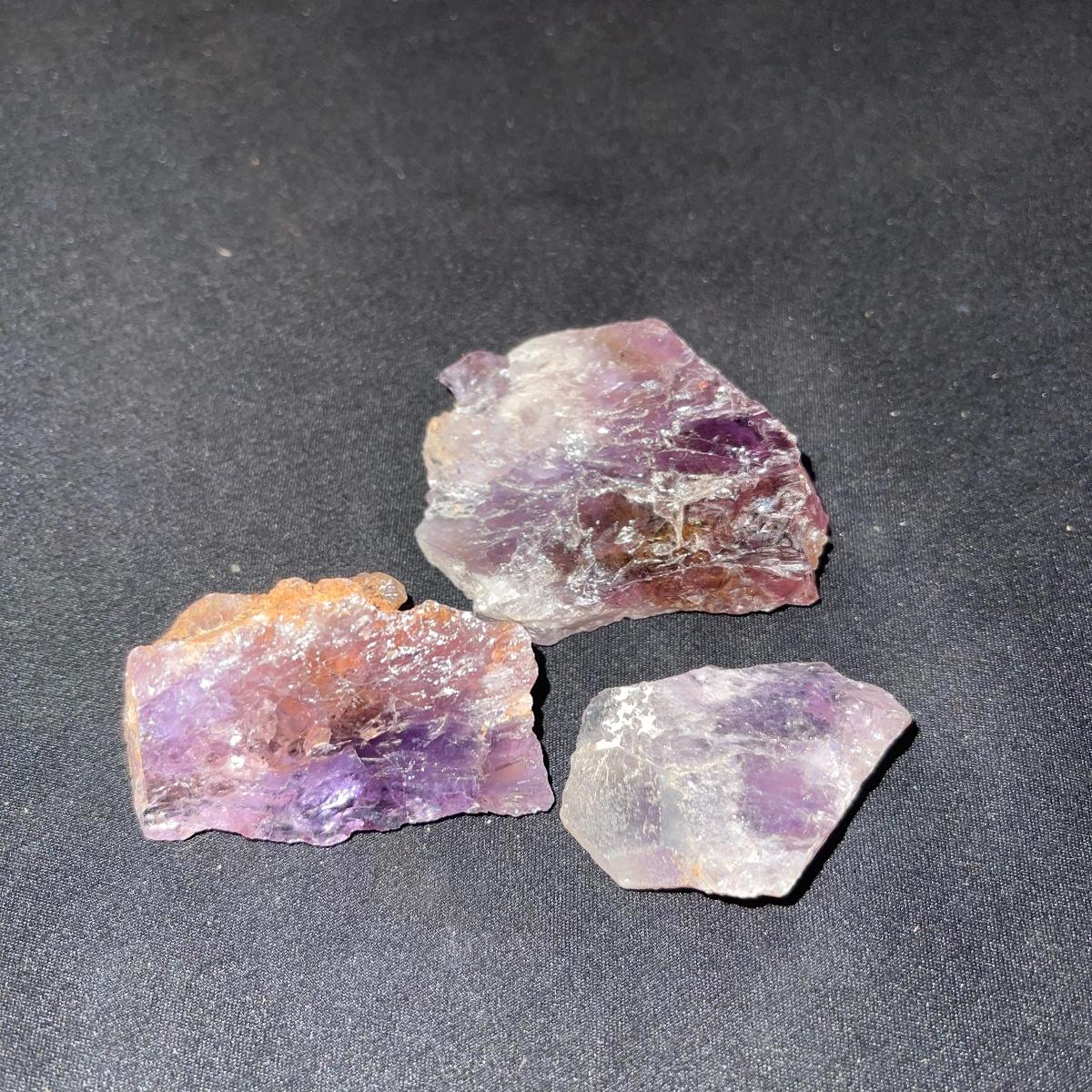 In this amethyst collection, the largest stone measures 2” x 2.25” x 1”. Many shades of purple and gray are the colors of these amethyst. There are a few that are more pink than purple and one that is black. Box of polished amethyst too.