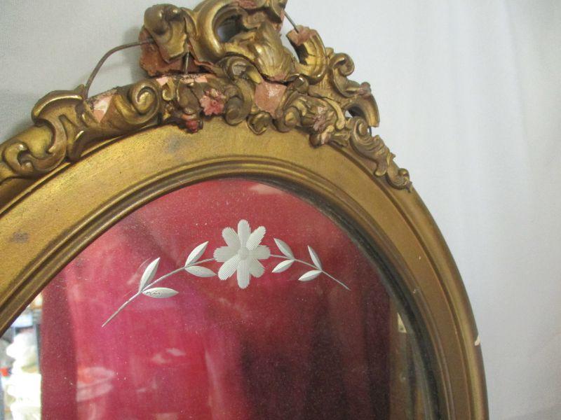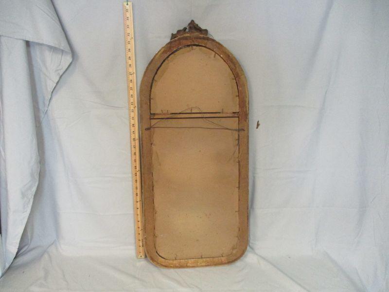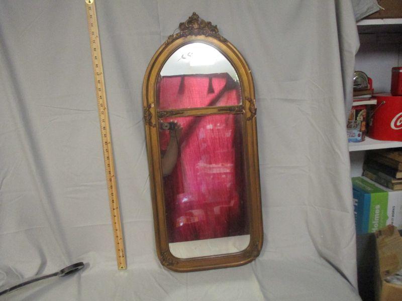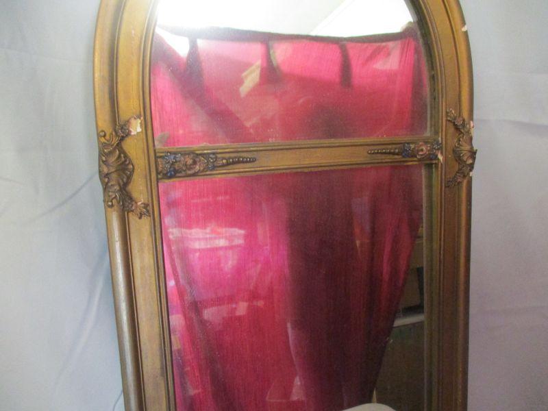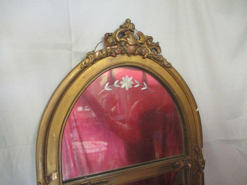 This is a gorgeous mirror that has some damage, but most of the pieces are available for some repair. Think of it as a home décor jigsaw puzzle. The mirror is 35" x 15" and has beautiful carvings and etched glass at the top.