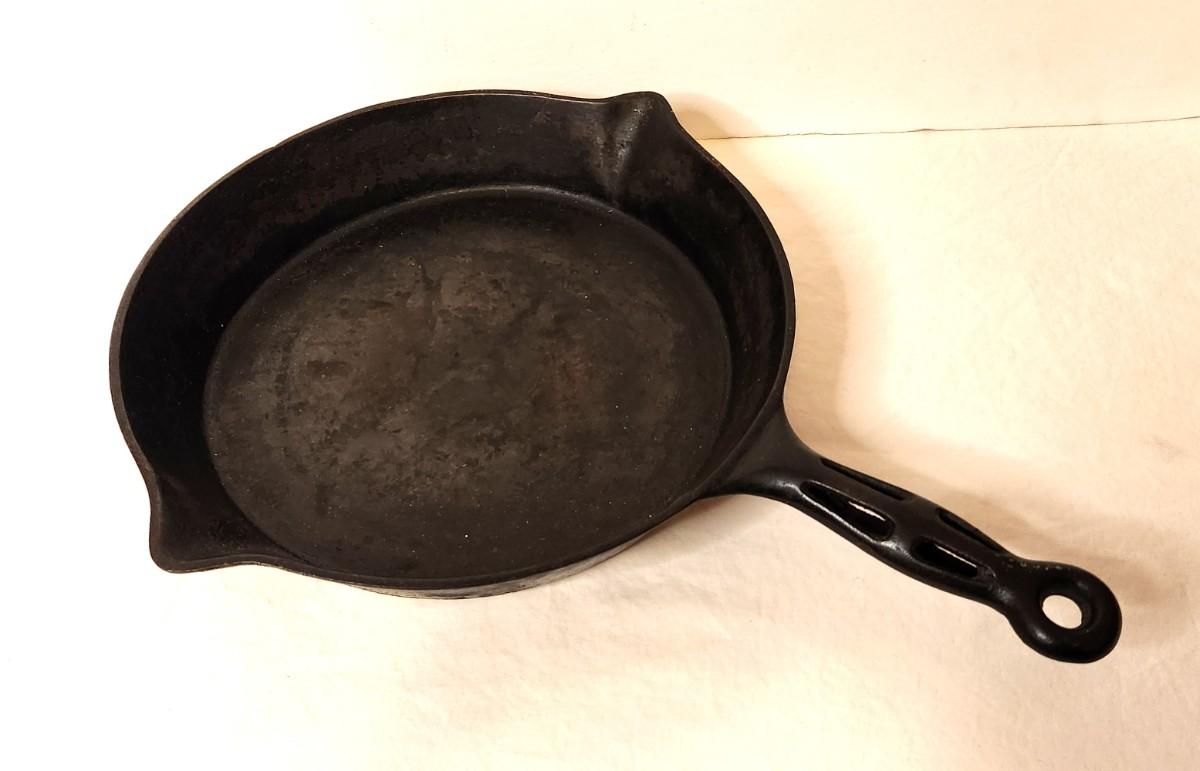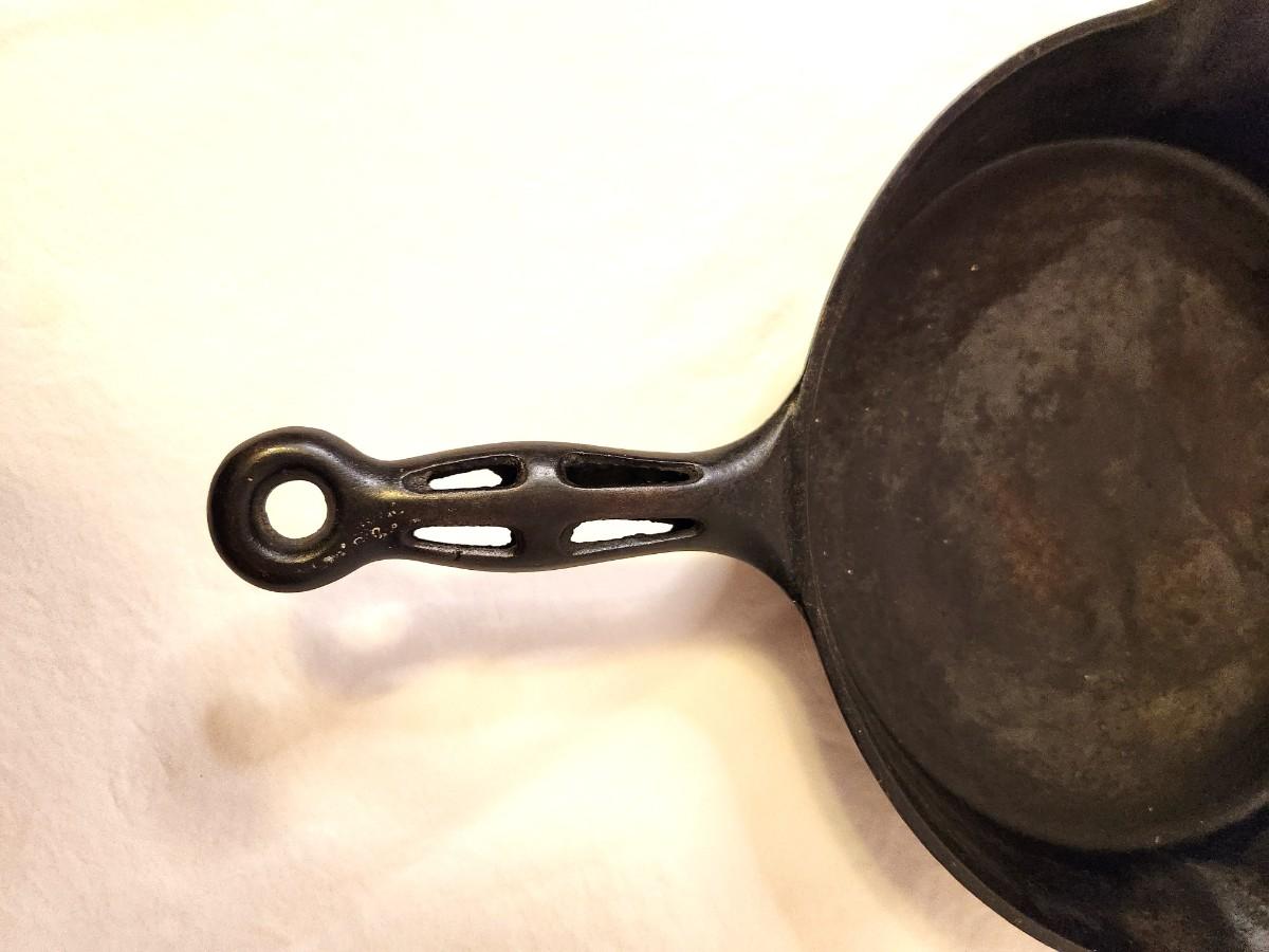 This cast iron double pour skillet has a patent date of June 1879. Unusual twist handle. Good condition. 16" long.