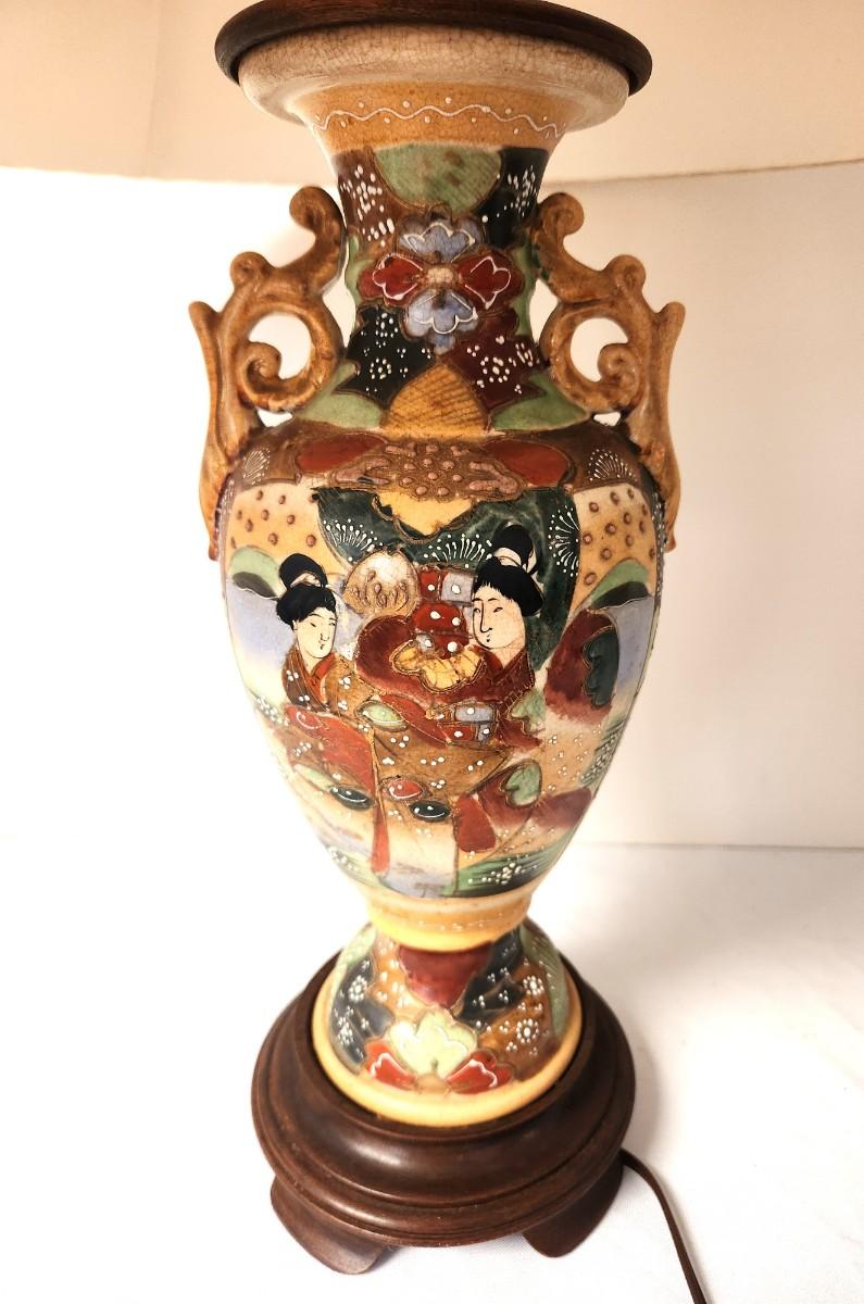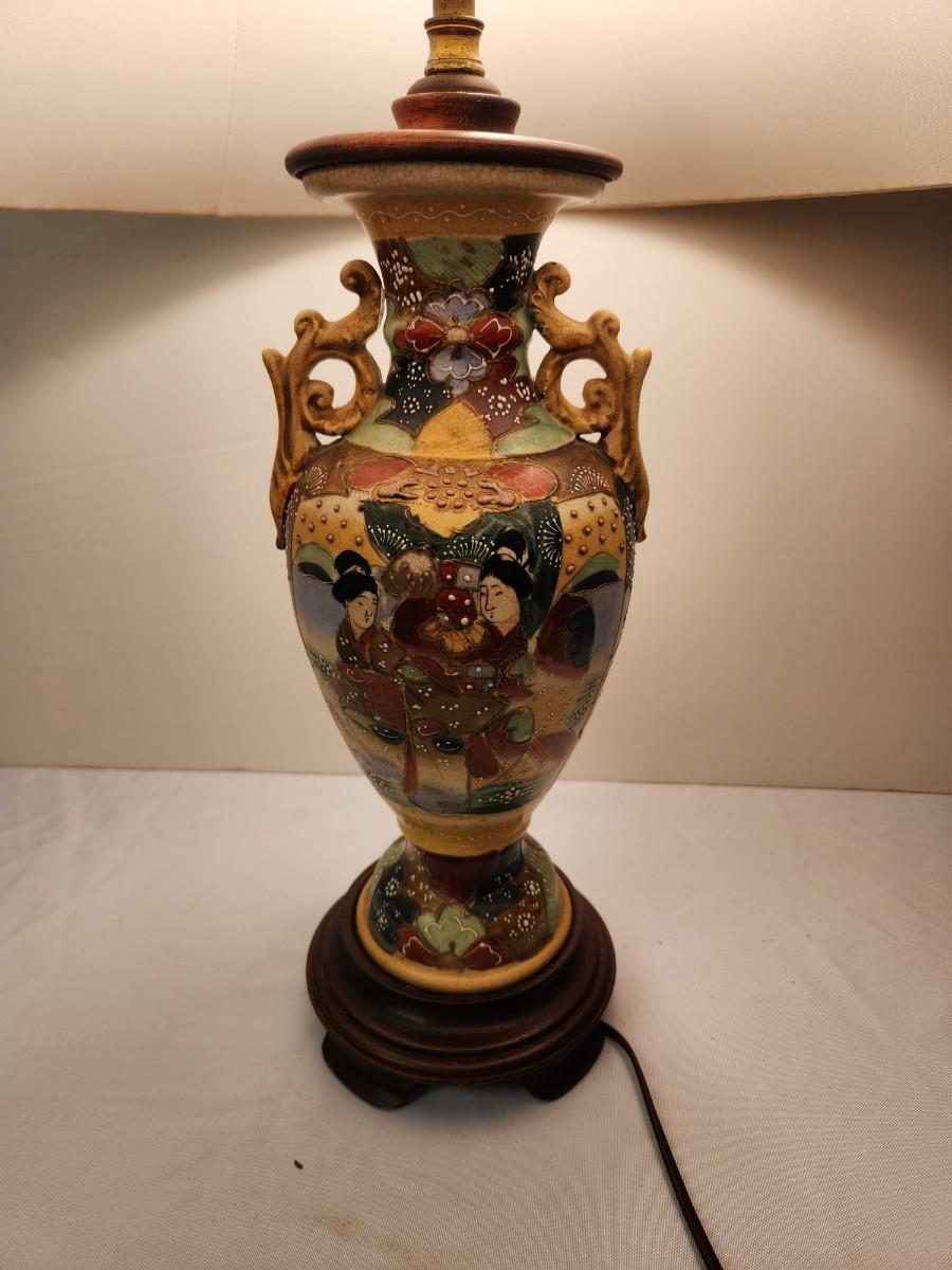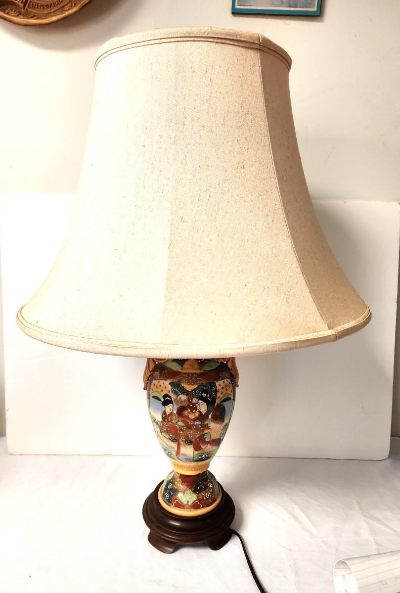 Nice decorator Asian Style Table Lamp - wood base, works. 26" tall, 2 bulbs - shade has a bit of wear, but easy replacement. An attractive lamp.