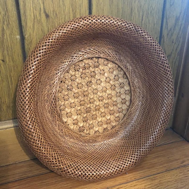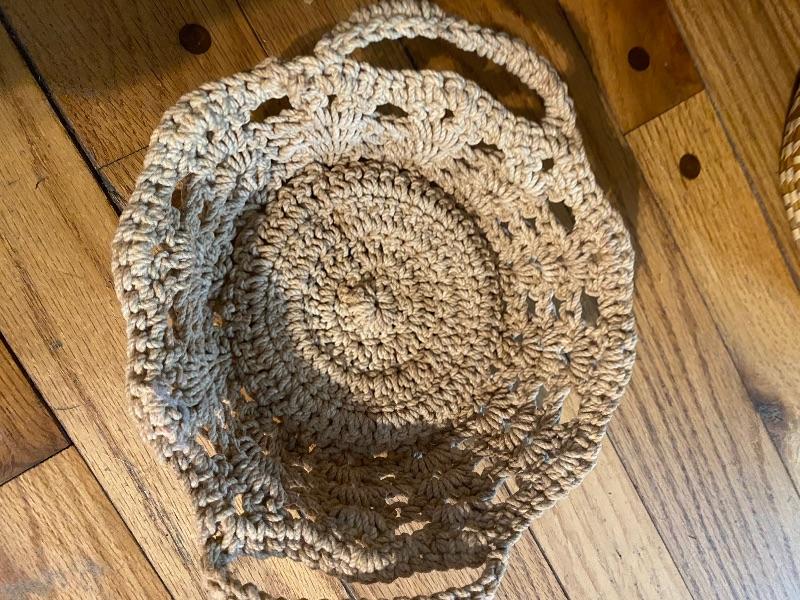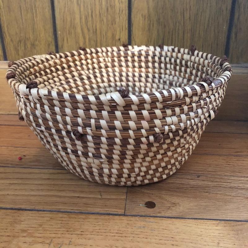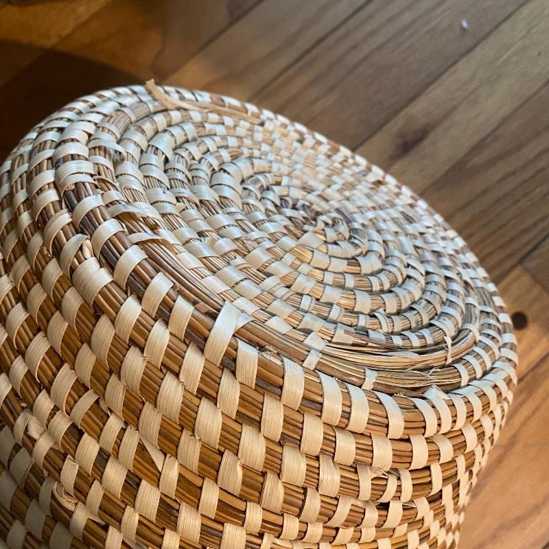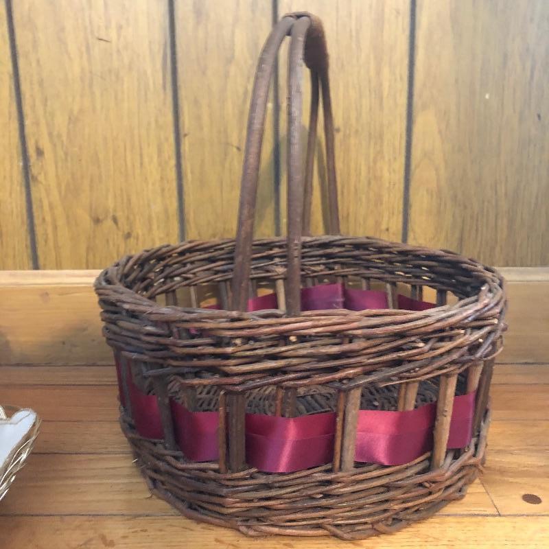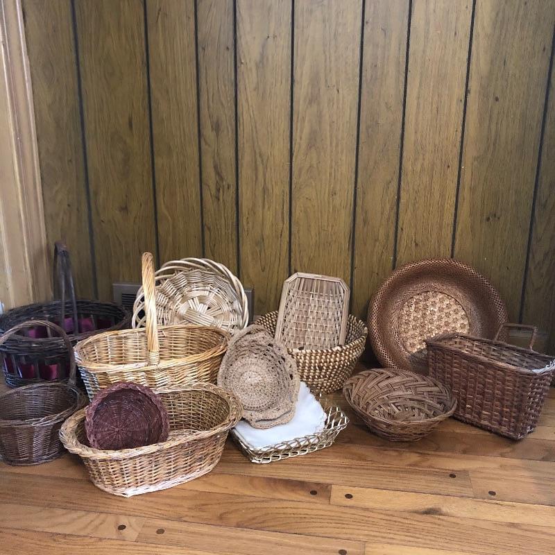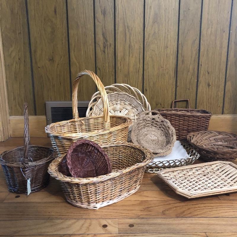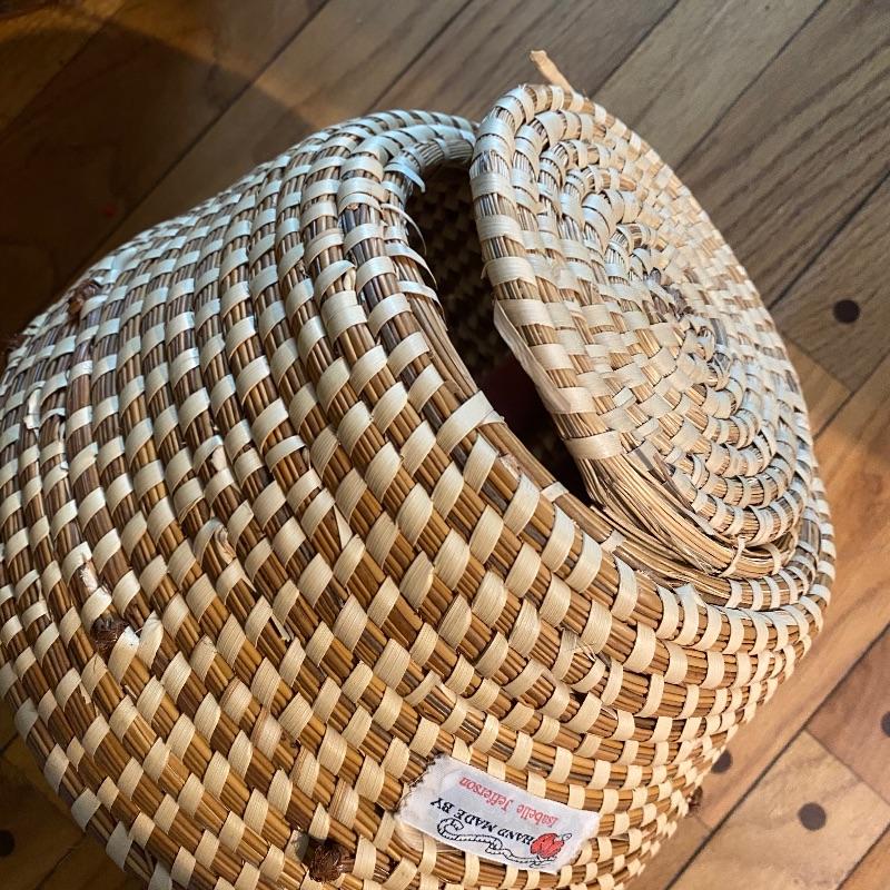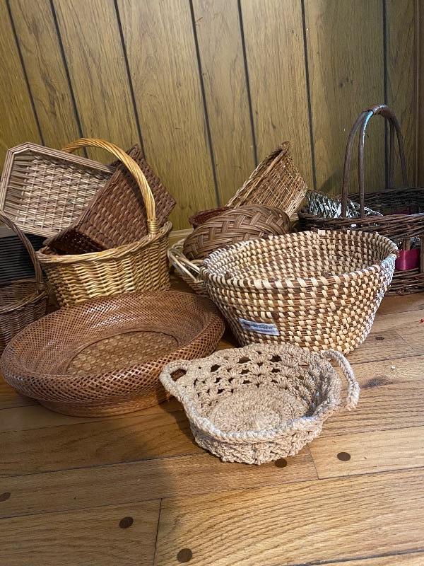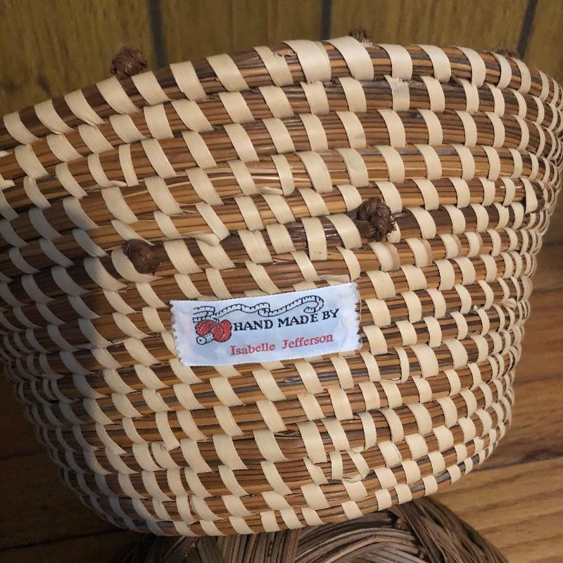 A total of thirteen assorted woven baskets. The largest handled basket is 13”d x 12.5”. This one has a lovely maroon ribbon and appears to be a very sturdy vintage or antique piece. The charming sea grass basket is hand crafted by Isabelle Jefferson; the bottom has come apart but could be pushed back together and is not noticeable when it is in place. Others appear in great shape.