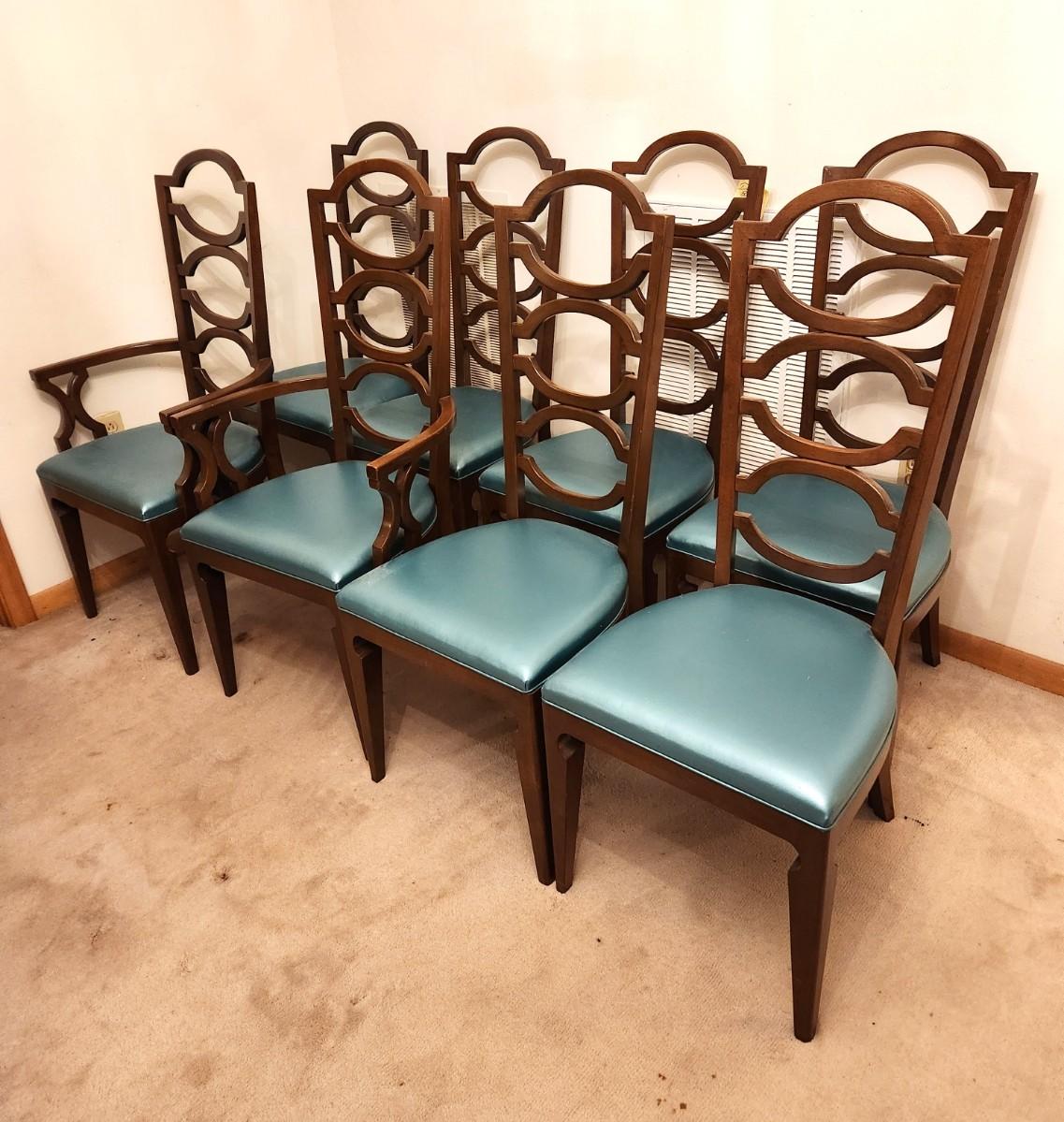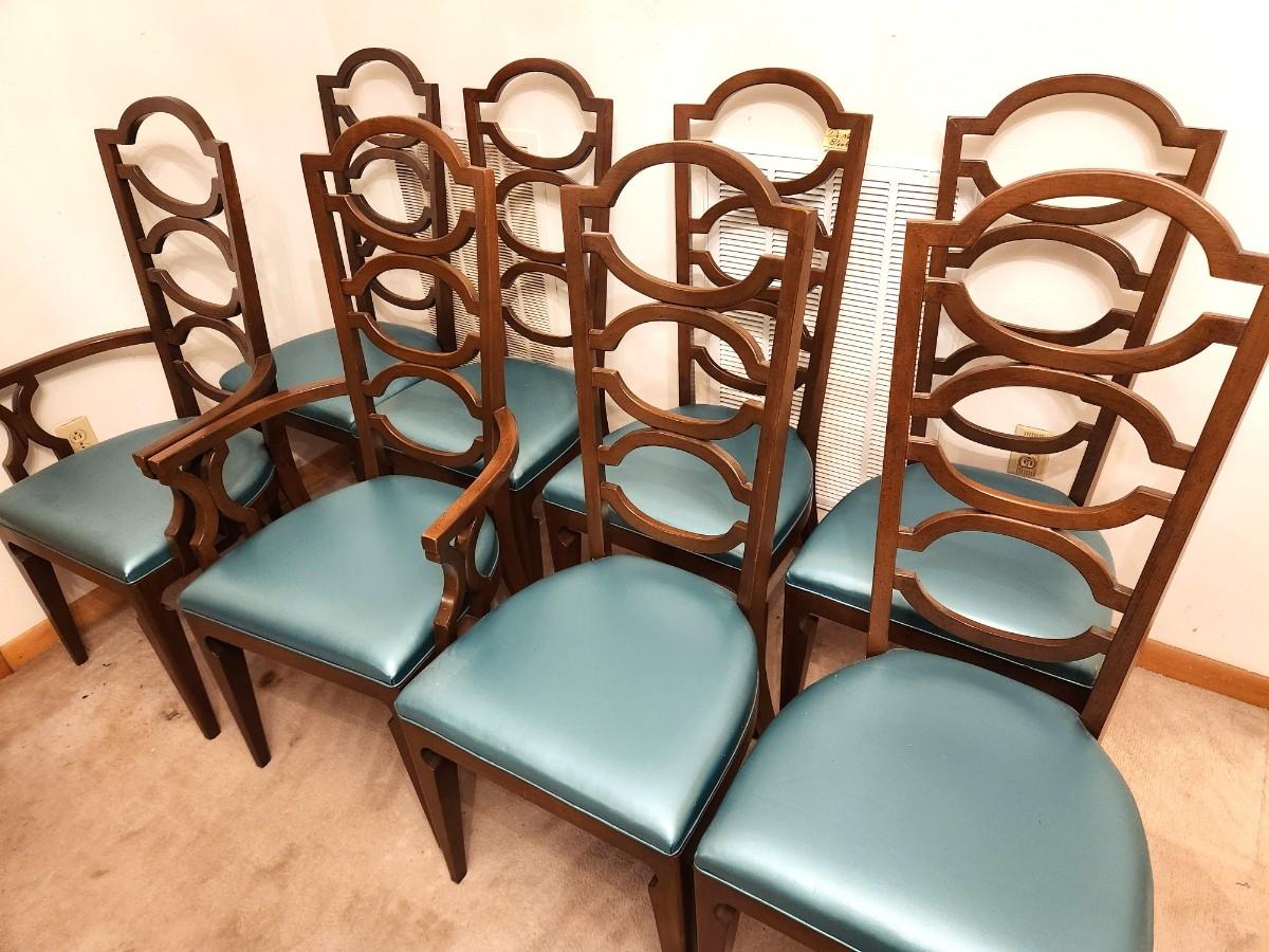 These MCM dining room chairs are in GREAT condition - 2 armchairs, 6 side chairs. Each is 45" tall and 18" across.