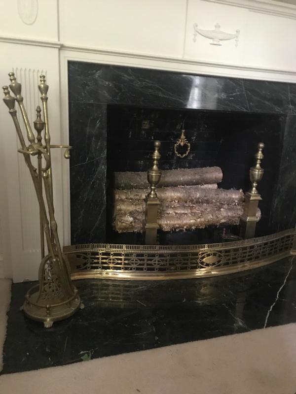 Ordain your fireplace(s) with this brass hearth lot. Lot includes set of gorgeous fireplace tools with one poker, one shovel and one log tong. A stand to hold firewood with removable brass towers along with a long low screen measuring approx. 51.5x6”. Also included in Lot is multiple pieces of birch wood for fireplace decor and a brass flew pull. No shipping.
