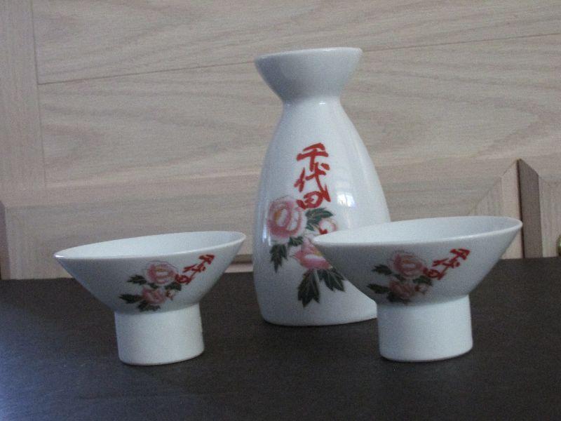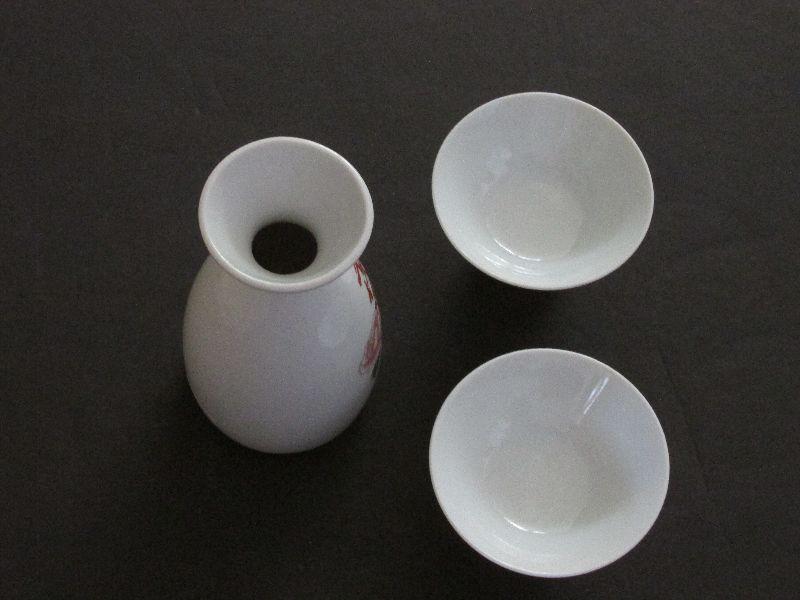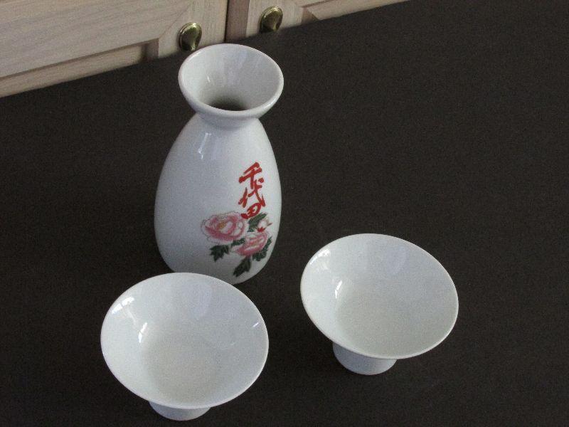 Chiyoda Sake set with pitcher and two cups. Has been stored and never used for over 30 years, No chips or cracks.
