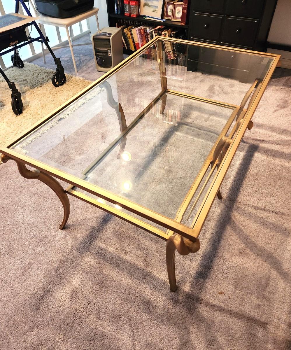 Good looking coffee table will work with all kinds or decor - top and bottom glass lifts out - 50" x 30", 22.5" tall. Good condition.