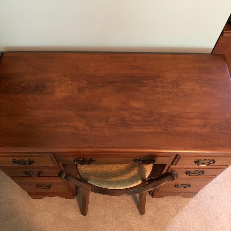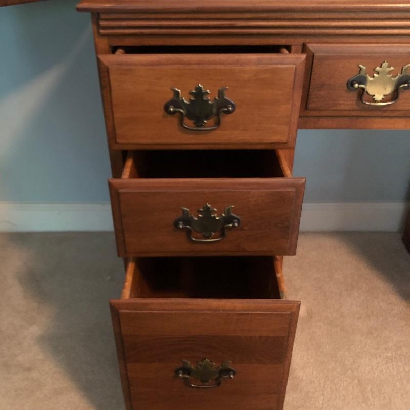 This beautiful desk and chair combo is perfect for any office or living space, with seven generously-sized drawers and 42” x 20.25” of desk space for you to work with. The desk stands at 30.25” and the chair stands at 33”, both a relatively moderate size and a perfect addition to your home.