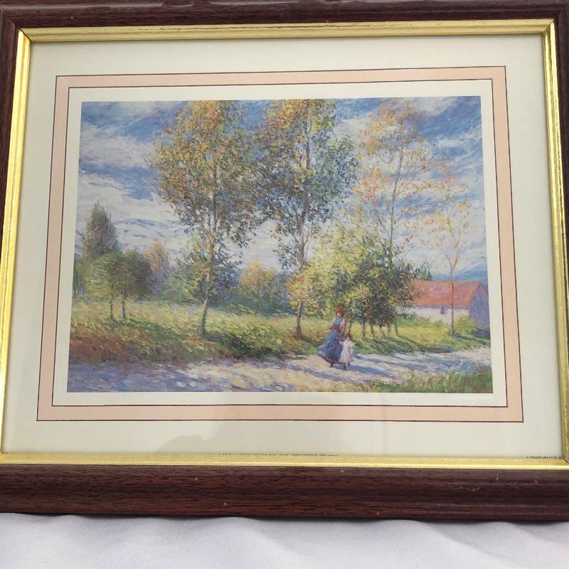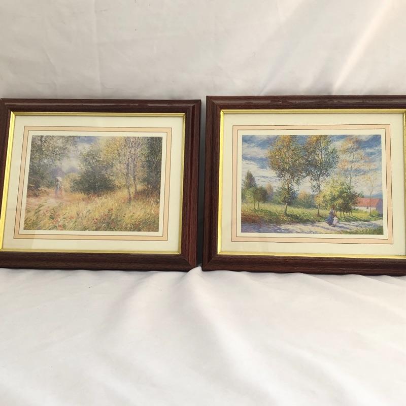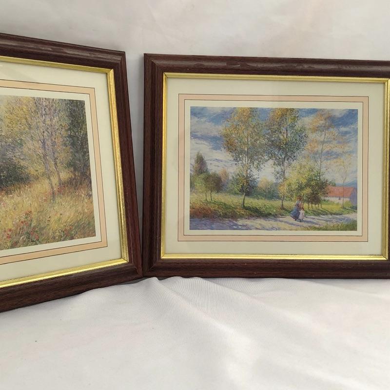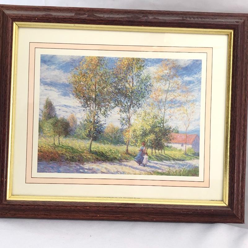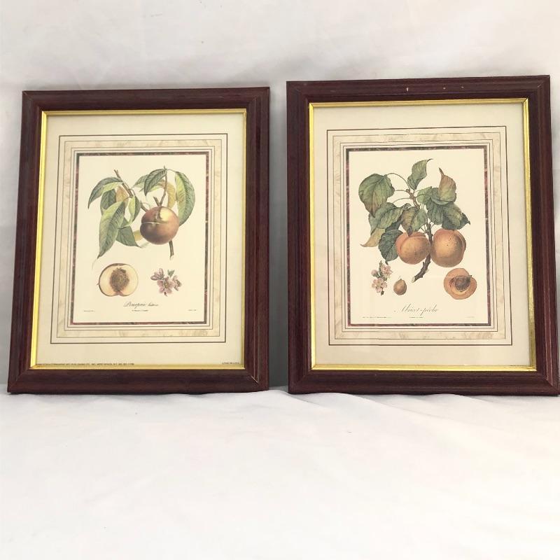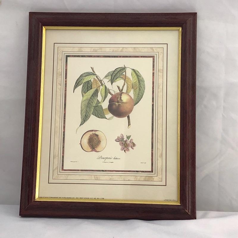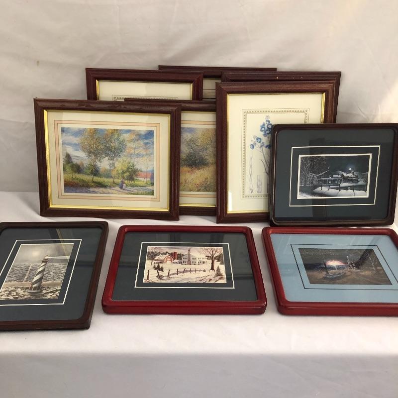 Eight framed pieces of art in this lot. The six prints in the first images all have matching wood frames; two fruit scenes, two landscape and two floral pieces make up these six. Also included are 4 more landscape scenes mounted in wood frames.