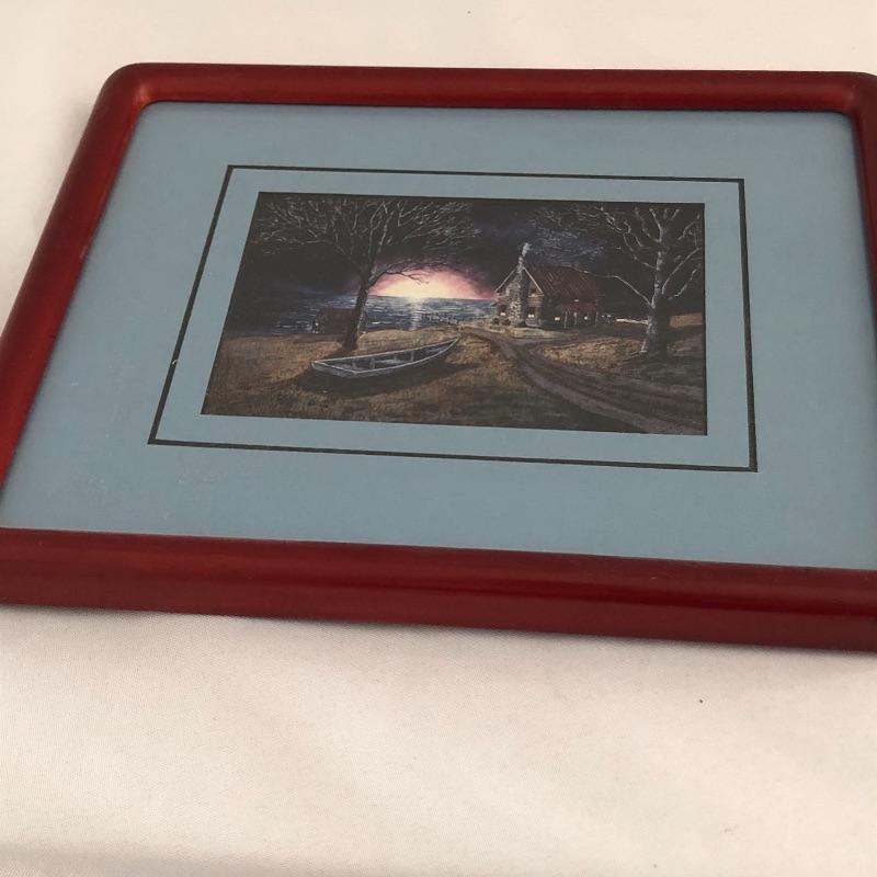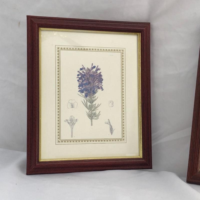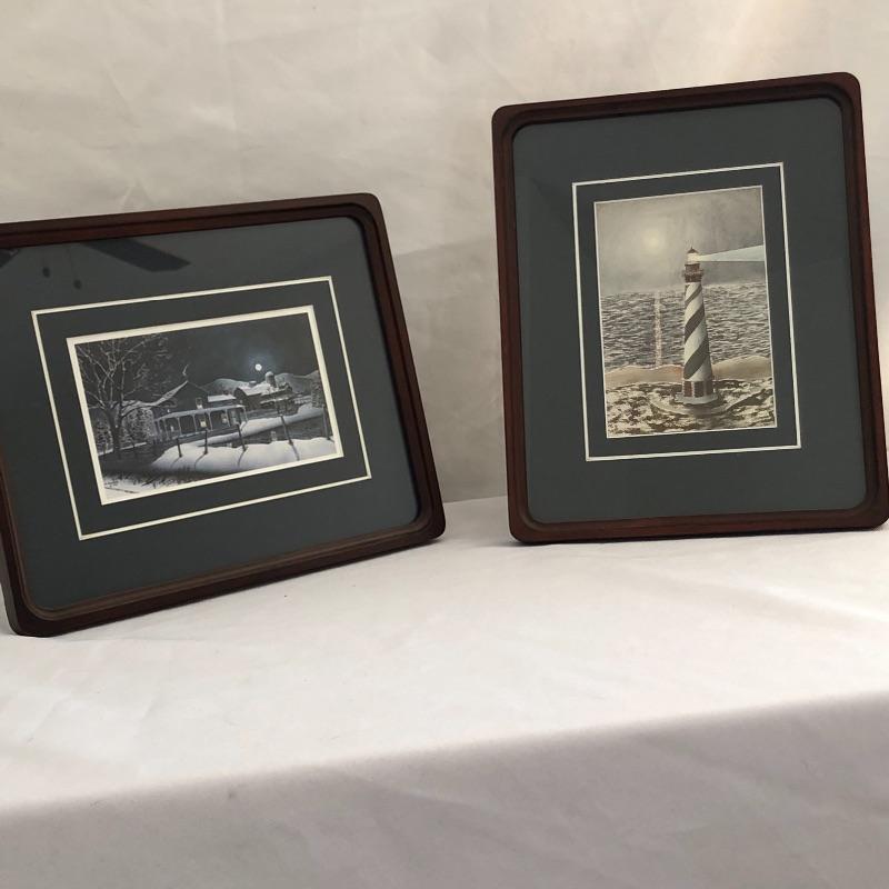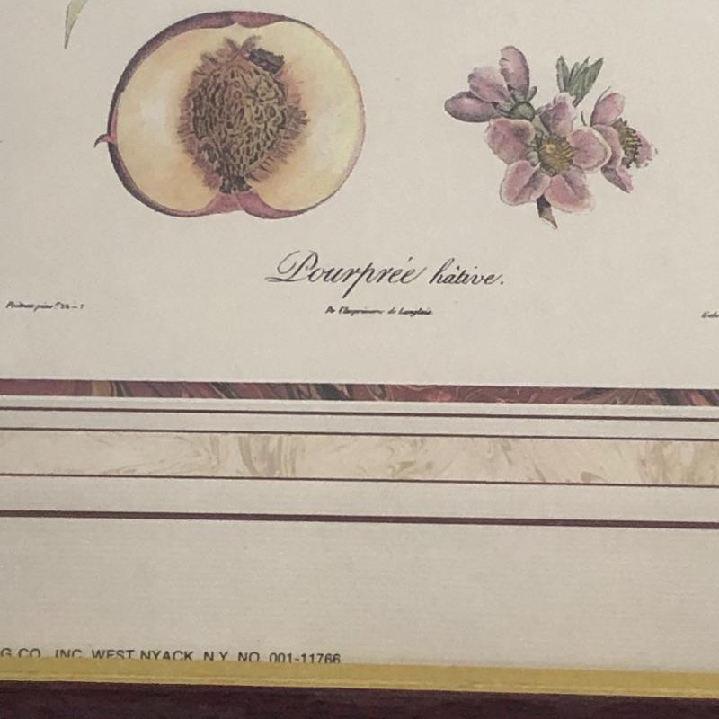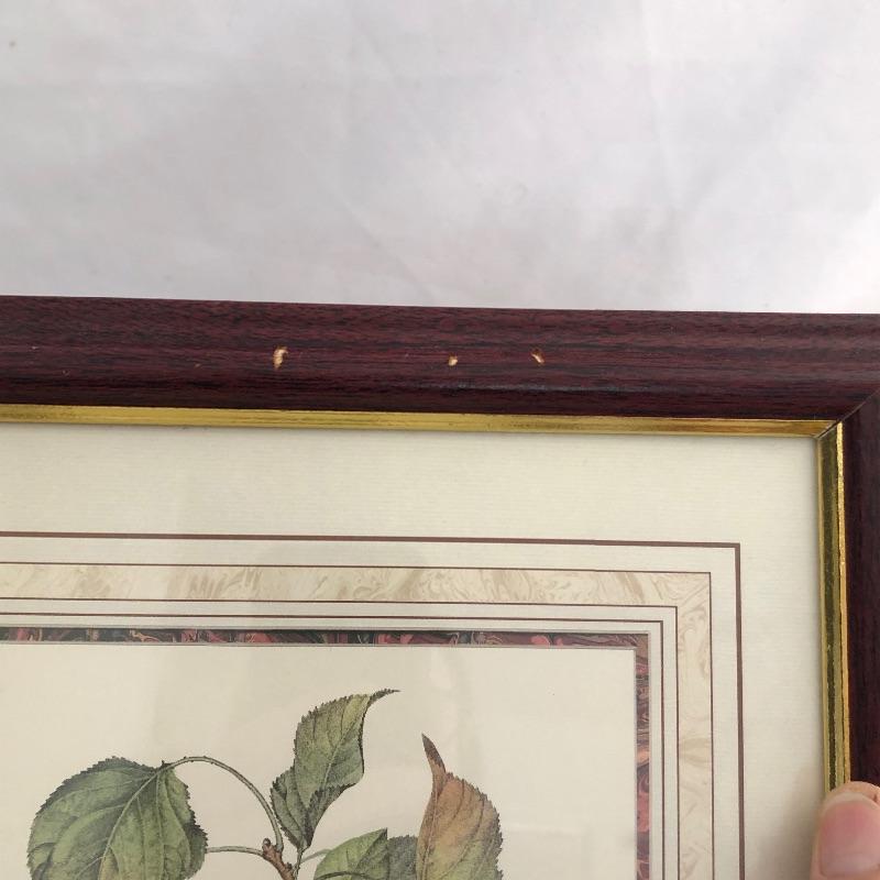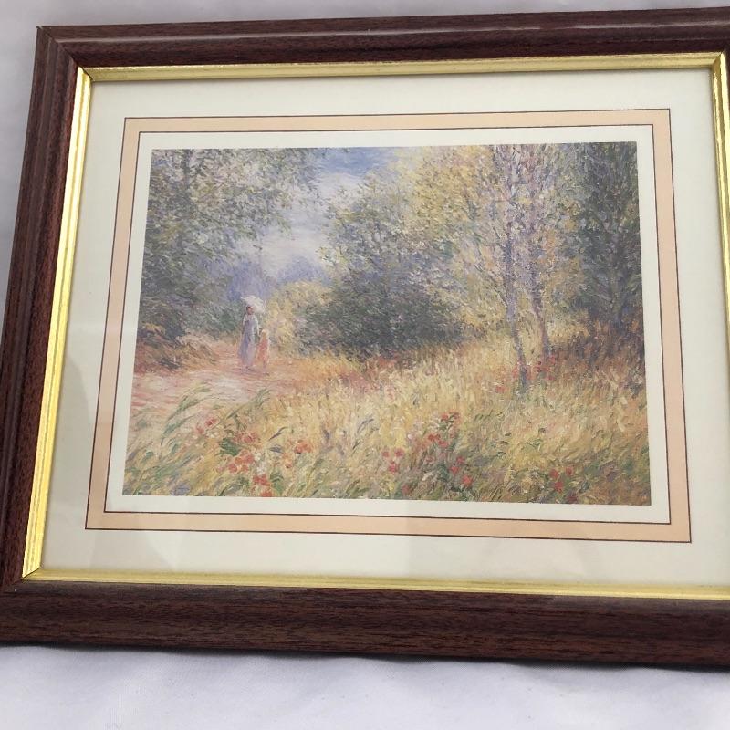 Eight framed pieces of art in this lot. The six prints in the first images all have matching wood frames; two fruit scenes, two landscape and two floral pieces make up these six. Also included are 4 more landscape scenes mounted in wood frames.