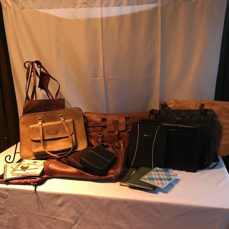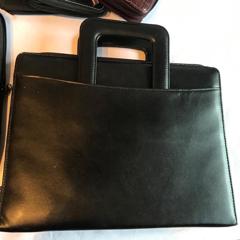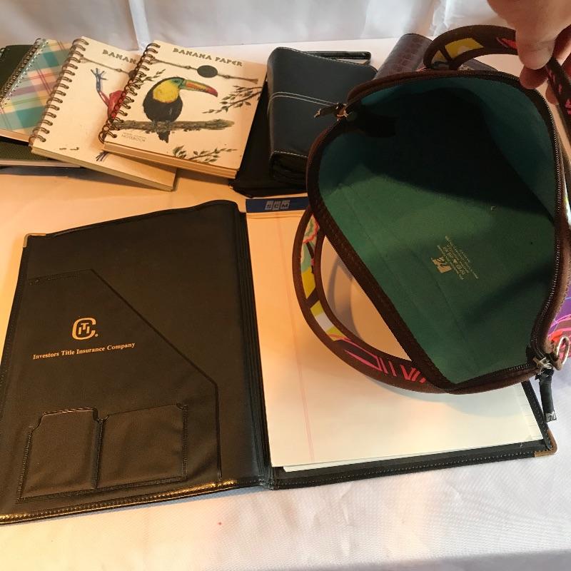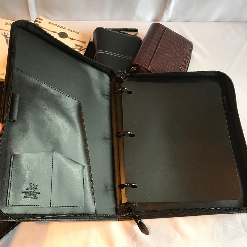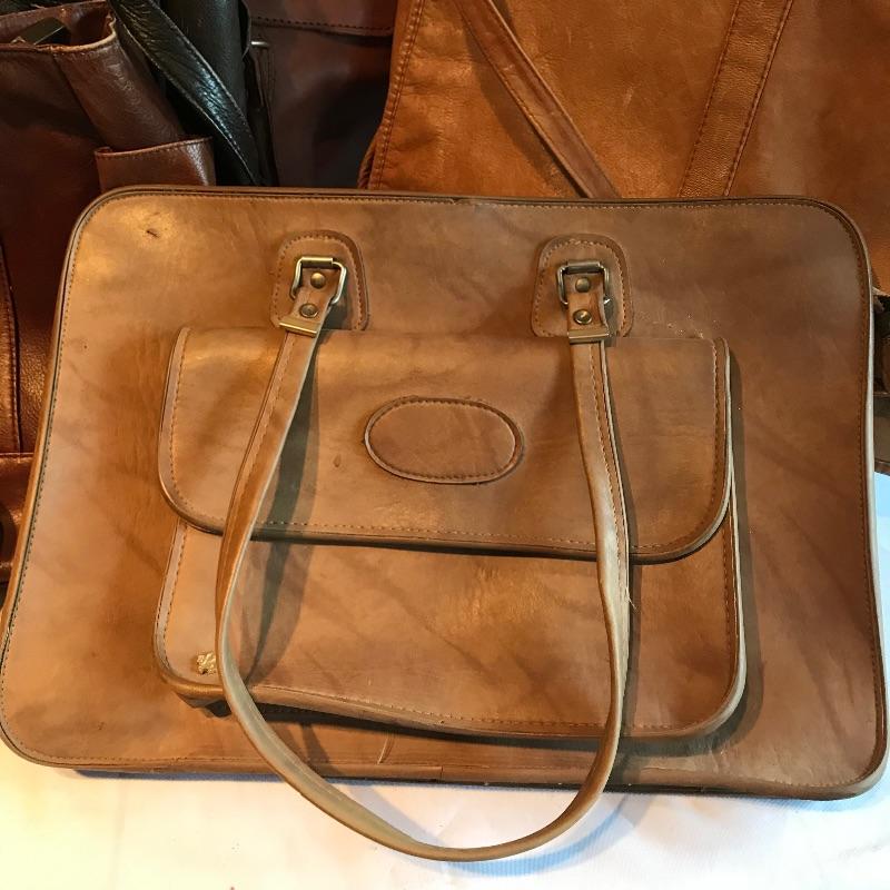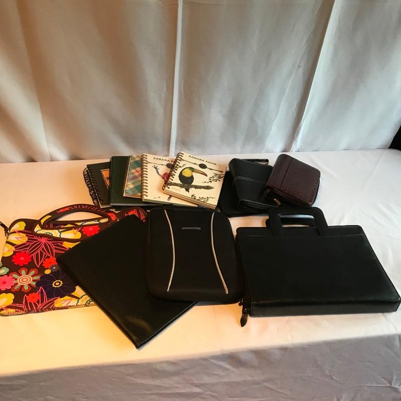 A fine selection of leather briefcases, bags, planners and duffle. The first five leather pieces are large enough to hold a standard laptop, the duffle is large enough to hold the entire lot inside (although top cannot be secured with all items inside) and has a unique closure system of hooks and belts. All pieces need a good leather clean, but will be beautiful no matter how you chose to use them. We’ve thrown in a few other pieces of various materials like a BodyGlove tablet holder, a flowered, padded case by IE, two leather-like planners with extra compartments for personal items and a five notebooks, two of which are Banana Paper. The black planner is missing one zipper, but the second compartment is fully useable. See photos. Local pick up only.