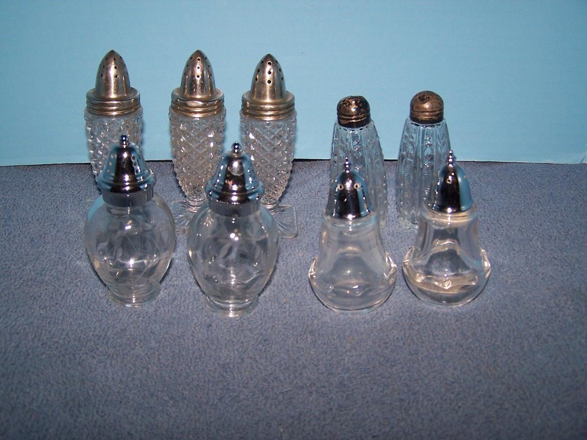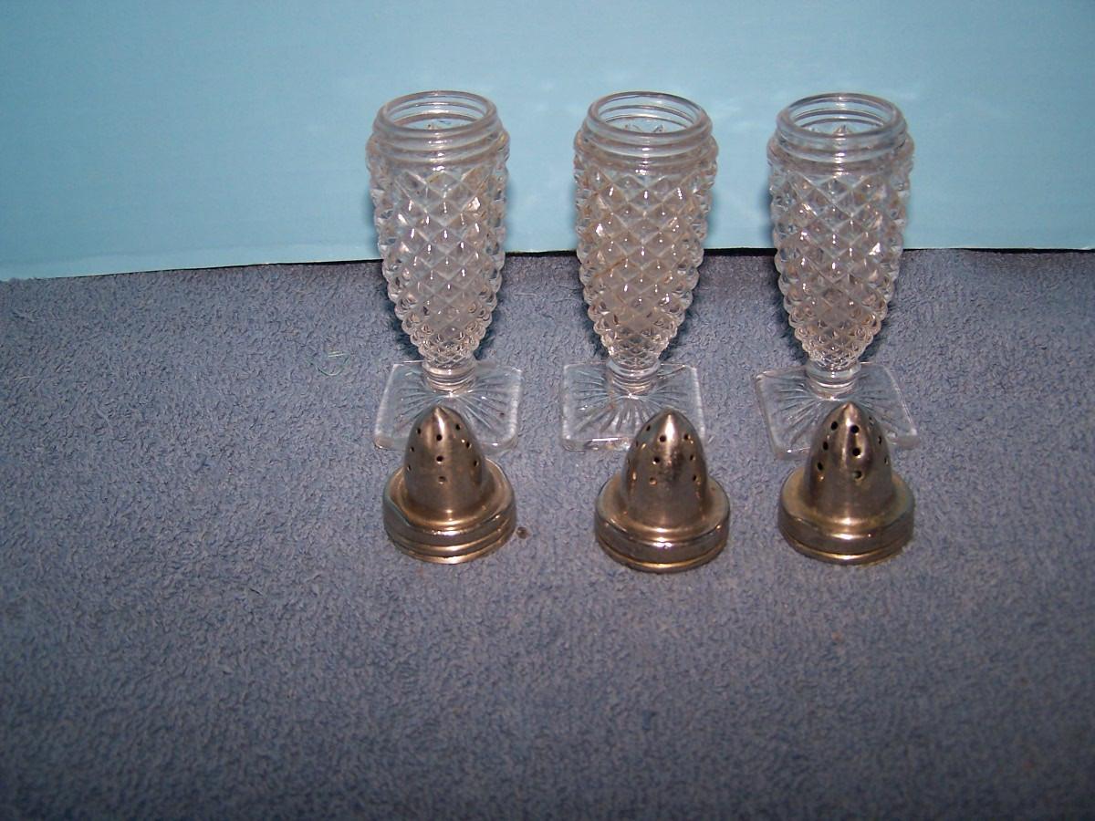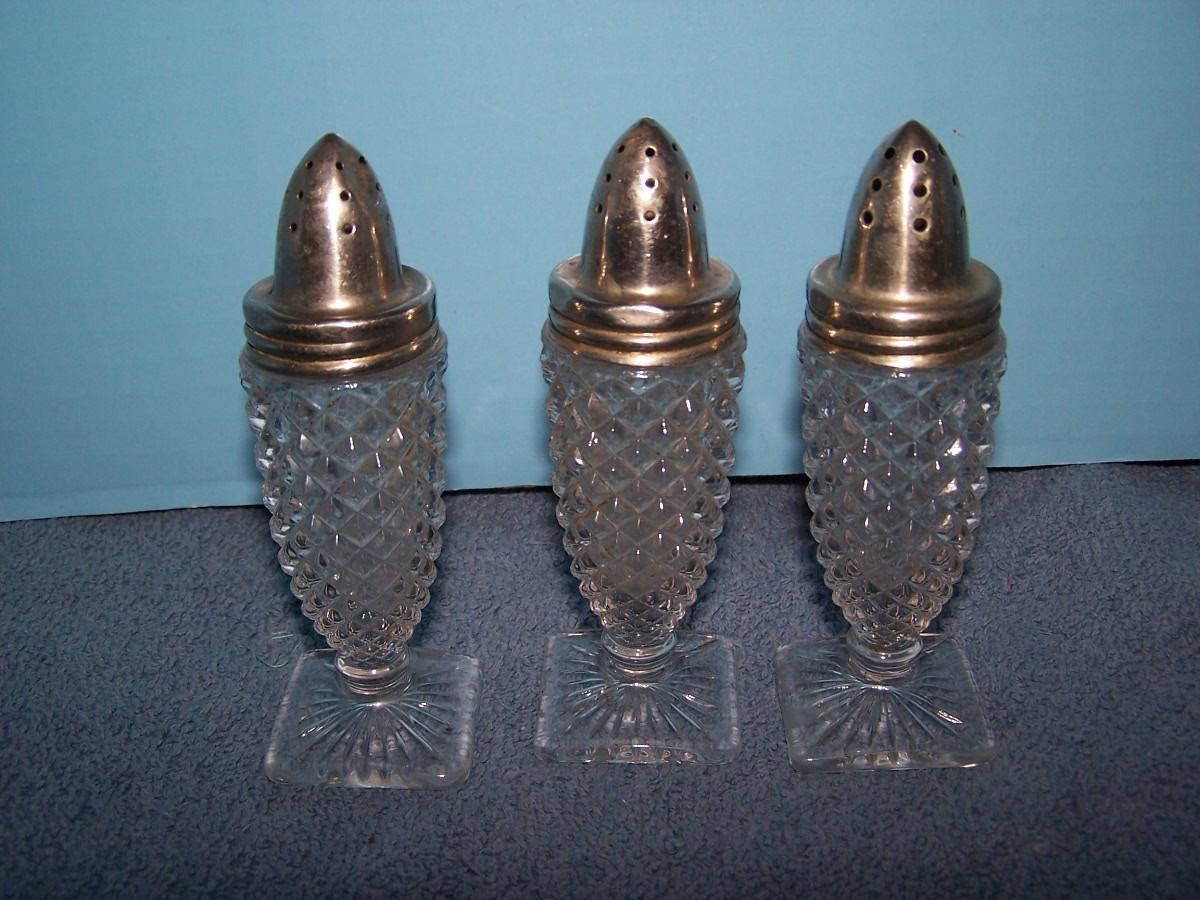 THESE ARE LOVELY VINTAGE CRYSTAL SHAKERS! 3 SHAKERS-4 5/8'' TALL. LIGHT WEAR..