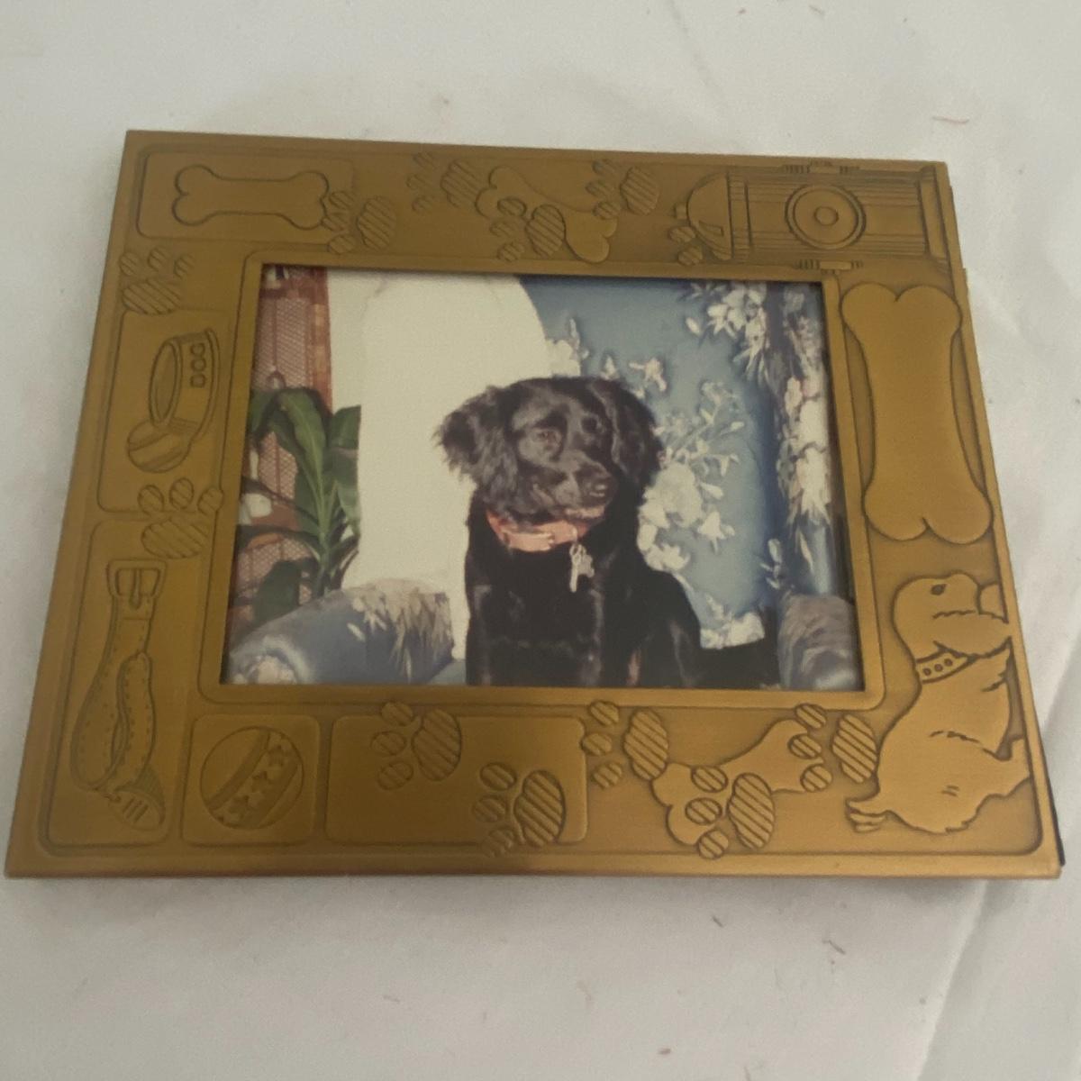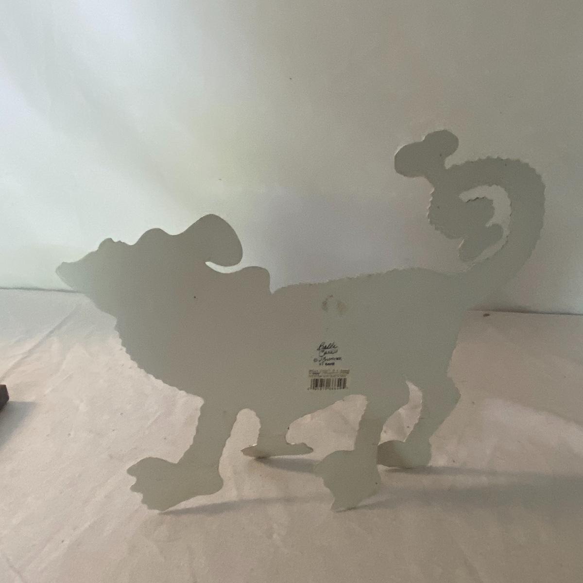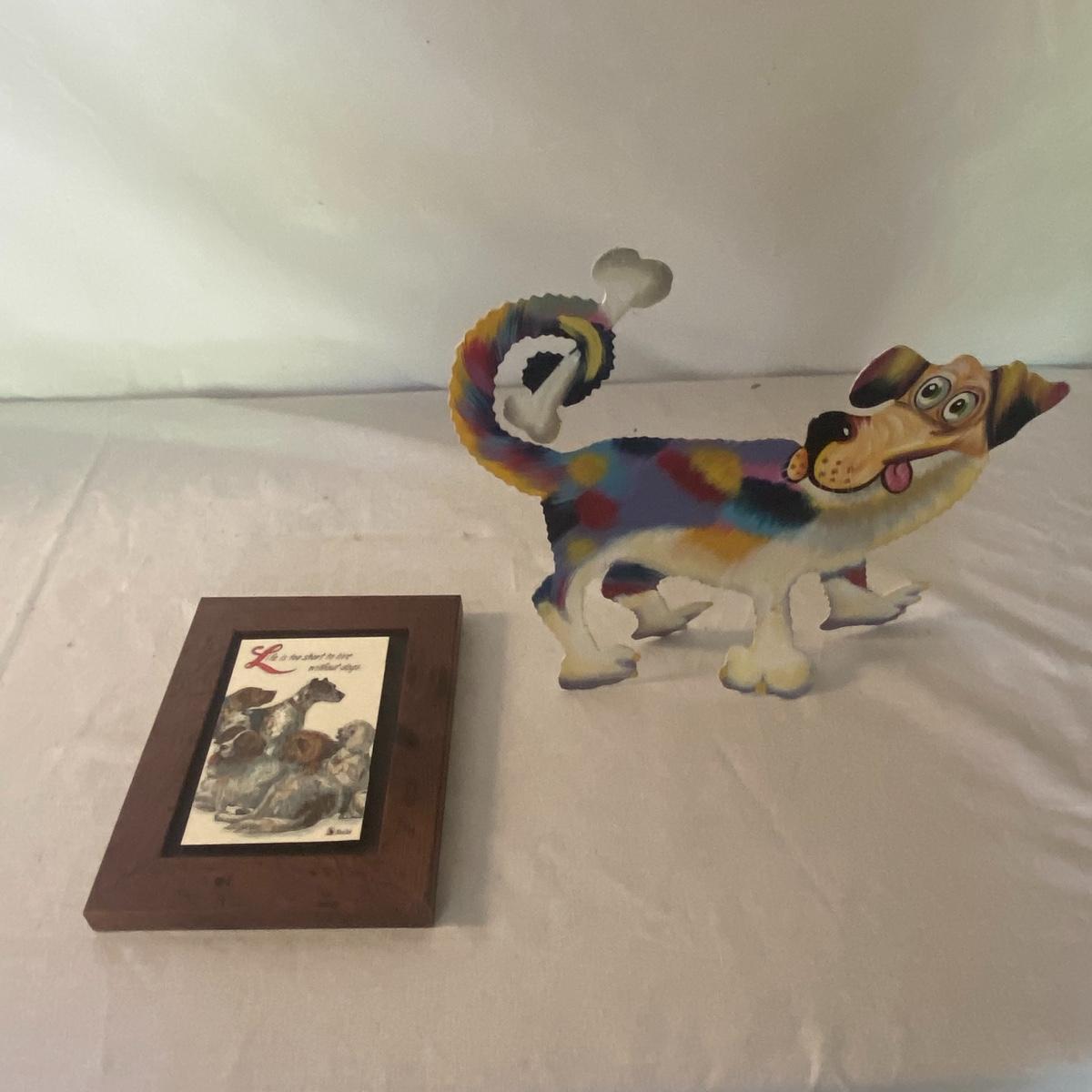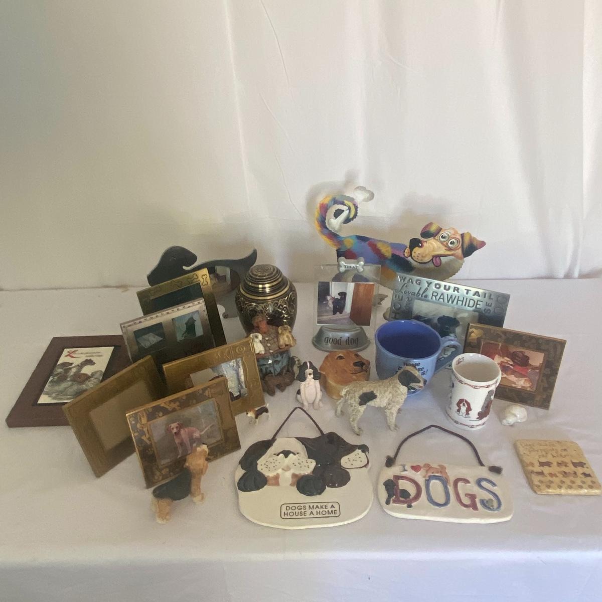 Lot includes many doggie relics and collectibles. Ranging from picture frames to wall decor you will be able to properly appreciate your pooch! Colorful metal dog stand measures approx. 13”x11”. Vase stands 7” tall. See photos for details. Shipping Available.