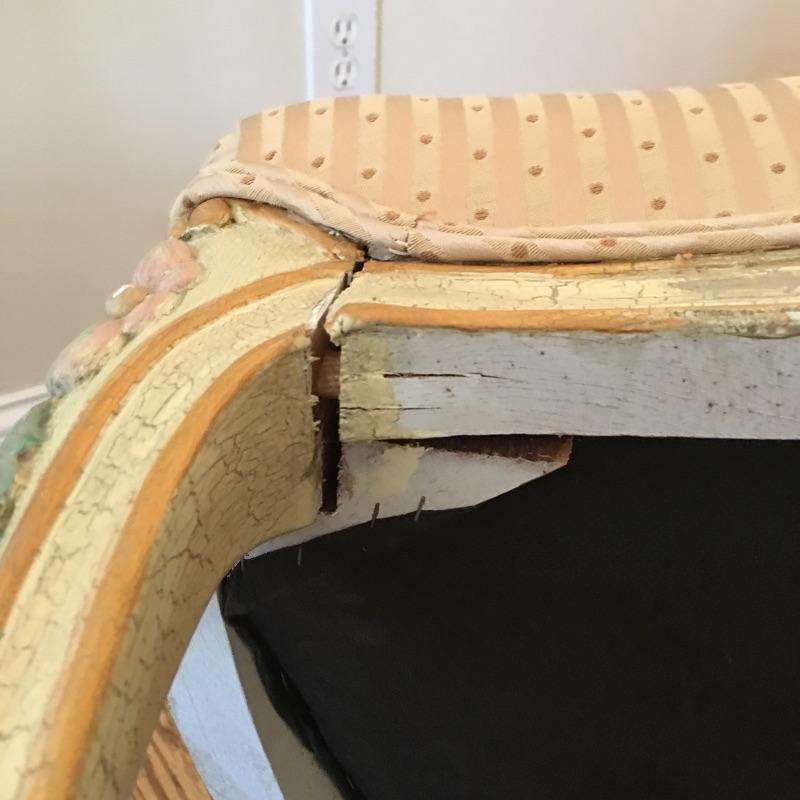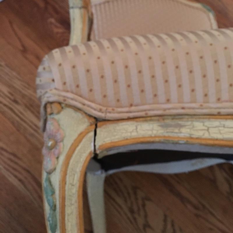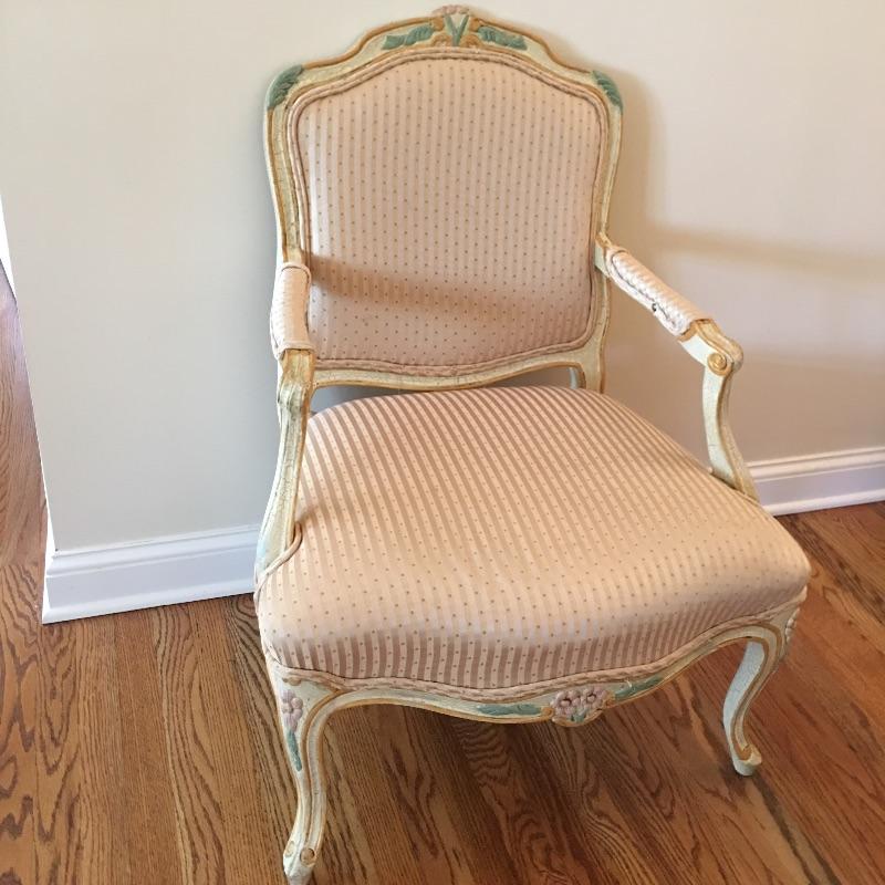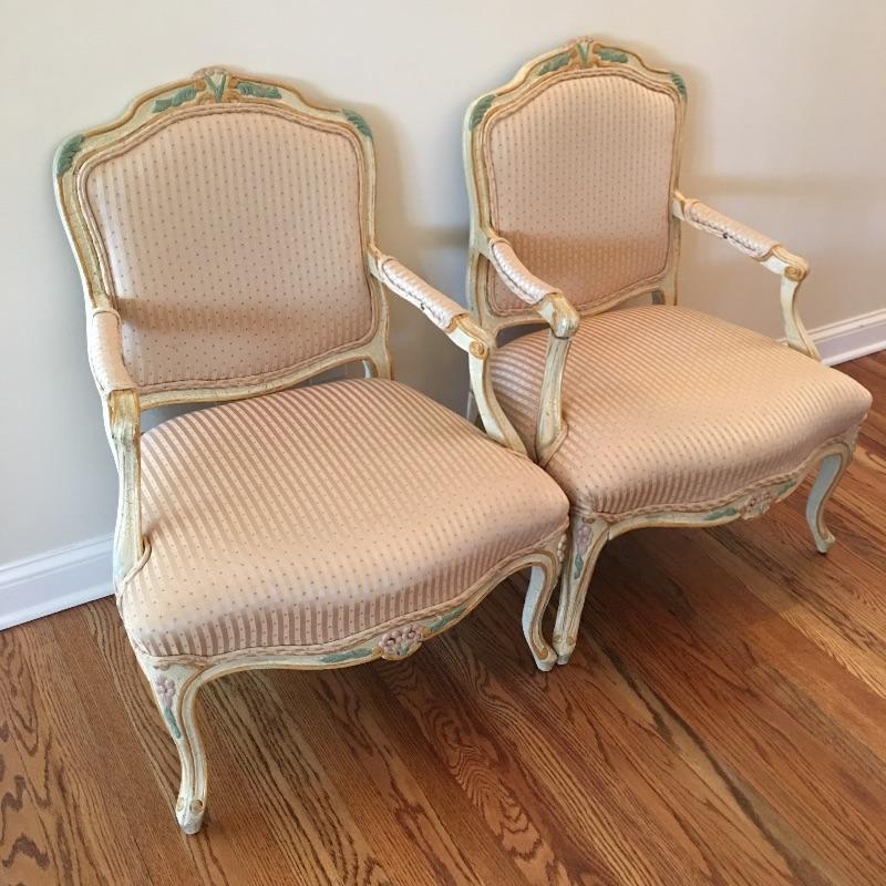 Two ornate Louis armchairs with beautiful wooden frames and silk upholstery. One chair has crack in wood. Still sturdy. Upholstery is clean and in good condition. See pictures.