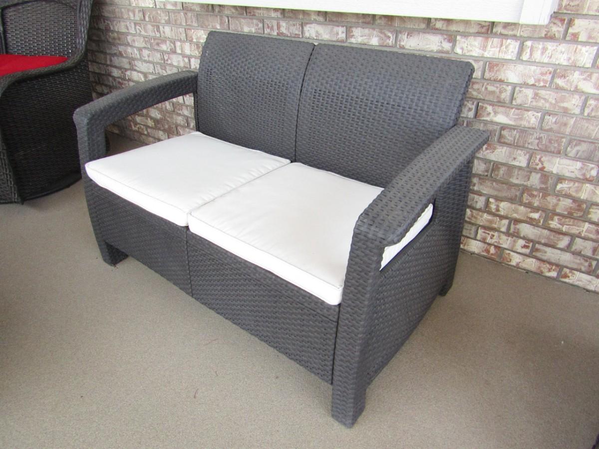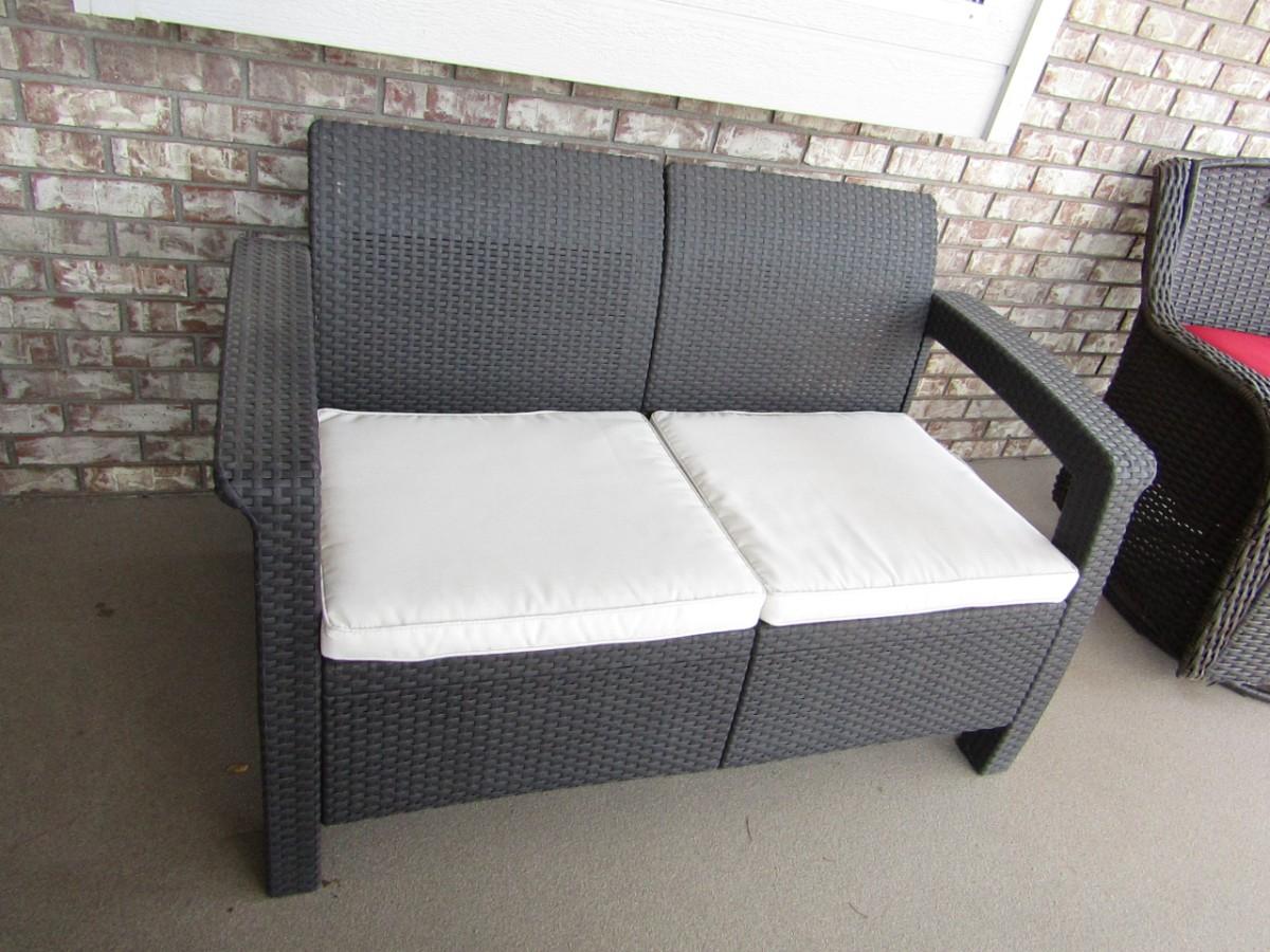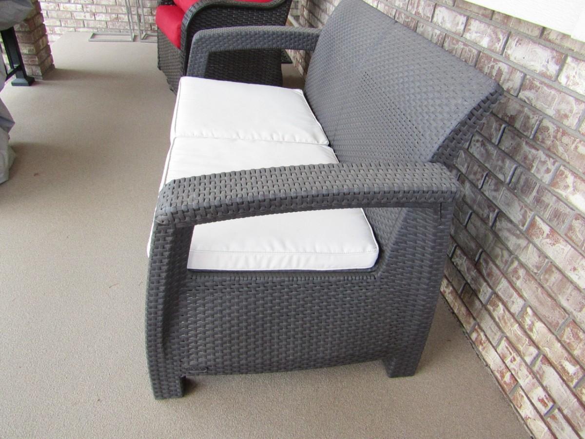 50" X 23"  PLASTIC BENCH WITH THE LOOK OF WICKER.  THE SLIPCOVERED SEAT CUSHIONS NEED TO BE CLEANED.