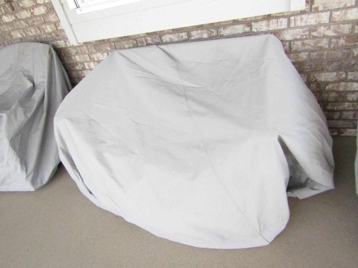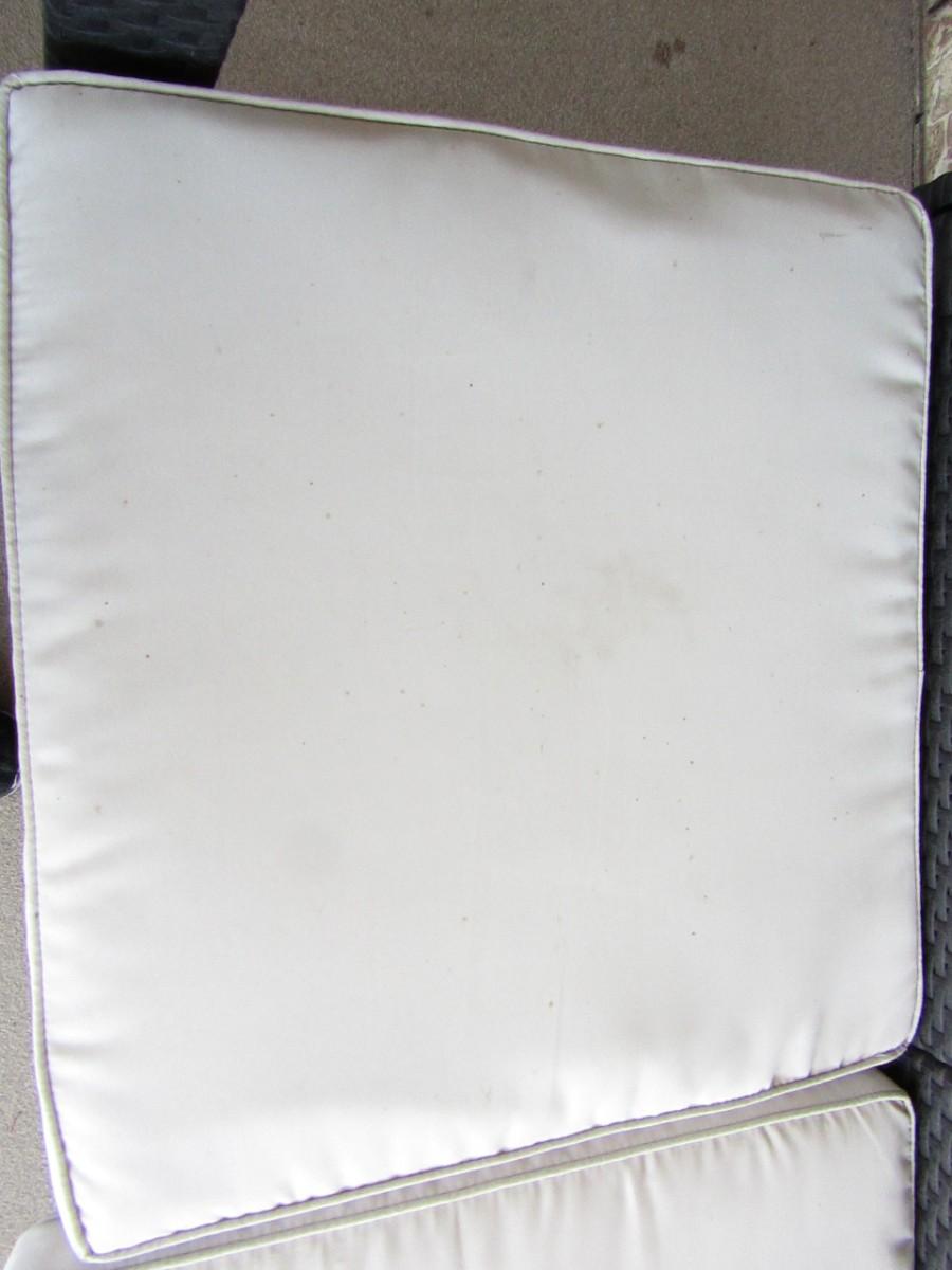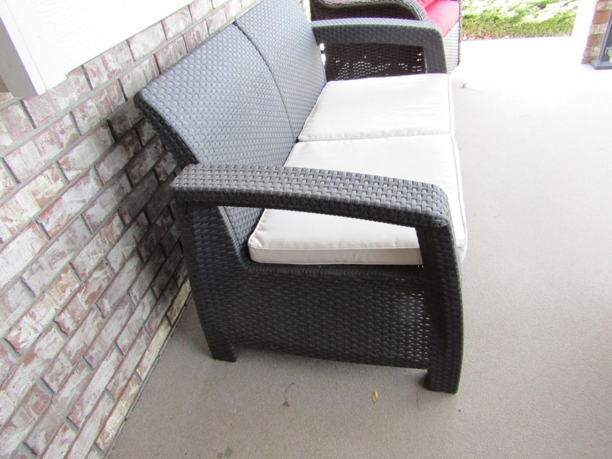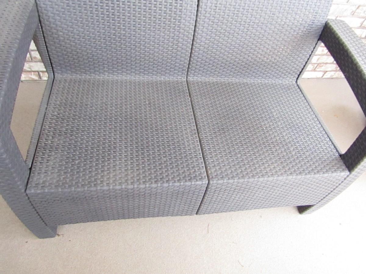 50" X 23"  PLASTIC BENCH WITH THE LOOK OF WICKER.  THE SLIPCOVERED SEAT CUSHIONS NEED TO BE CLEANED.