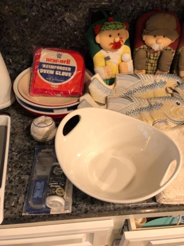 Lot 91. Potholders, serving bowl, hot chocolate maker, ceramic pie dishes, utensil organizer, electric tea kettle, bundt pan, cook-top cleaning kit--WAS $45““NOW $22.50