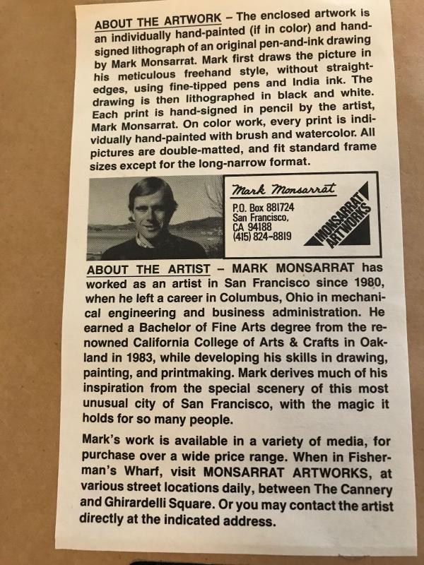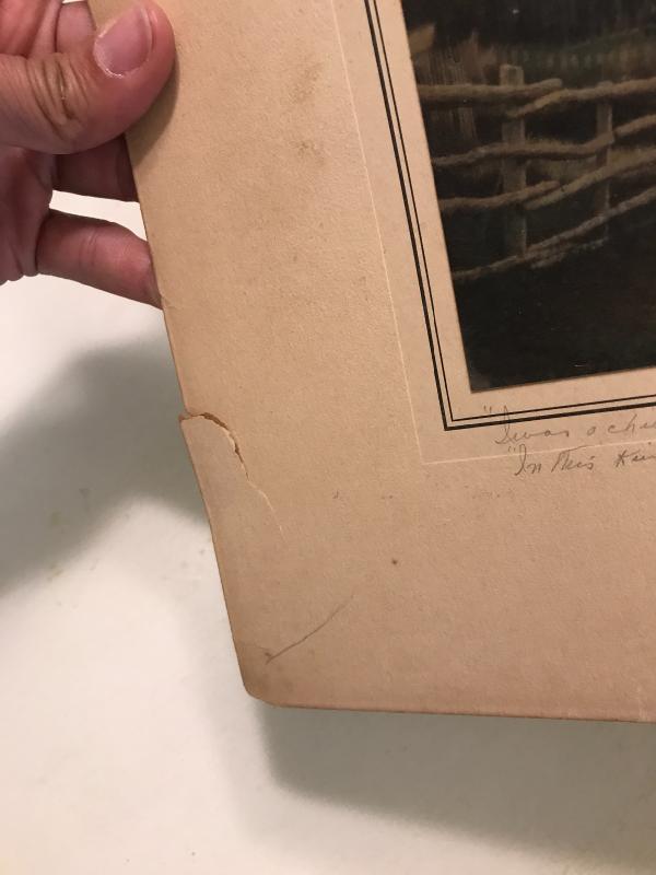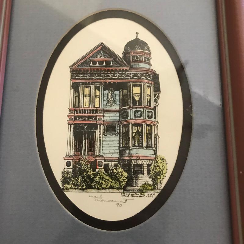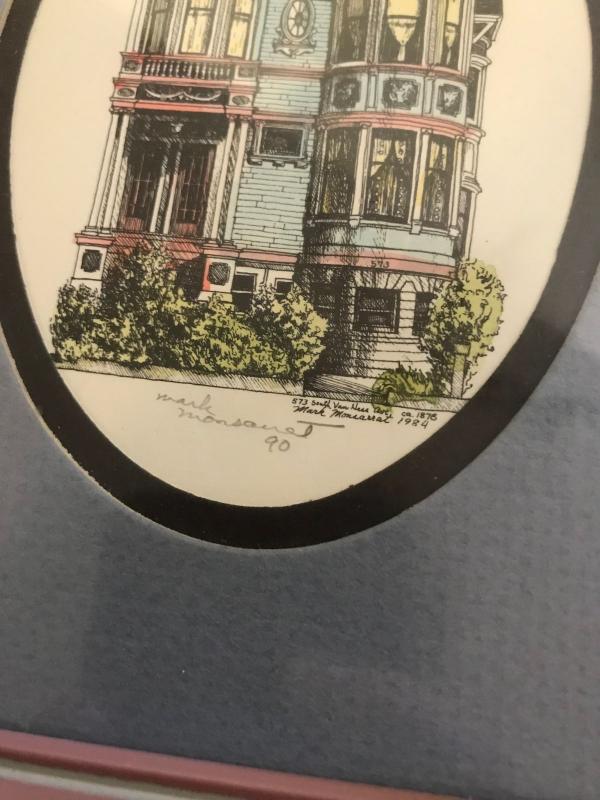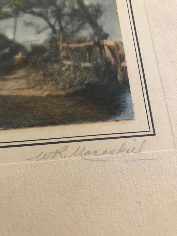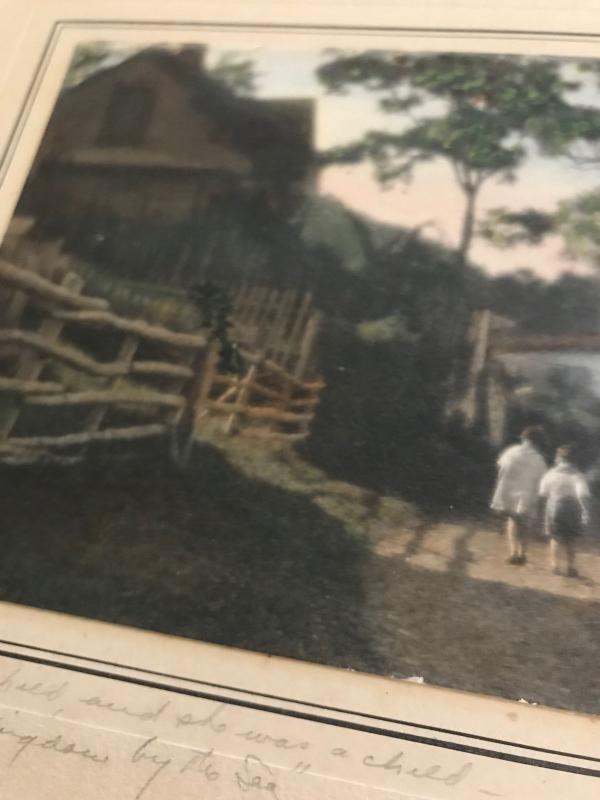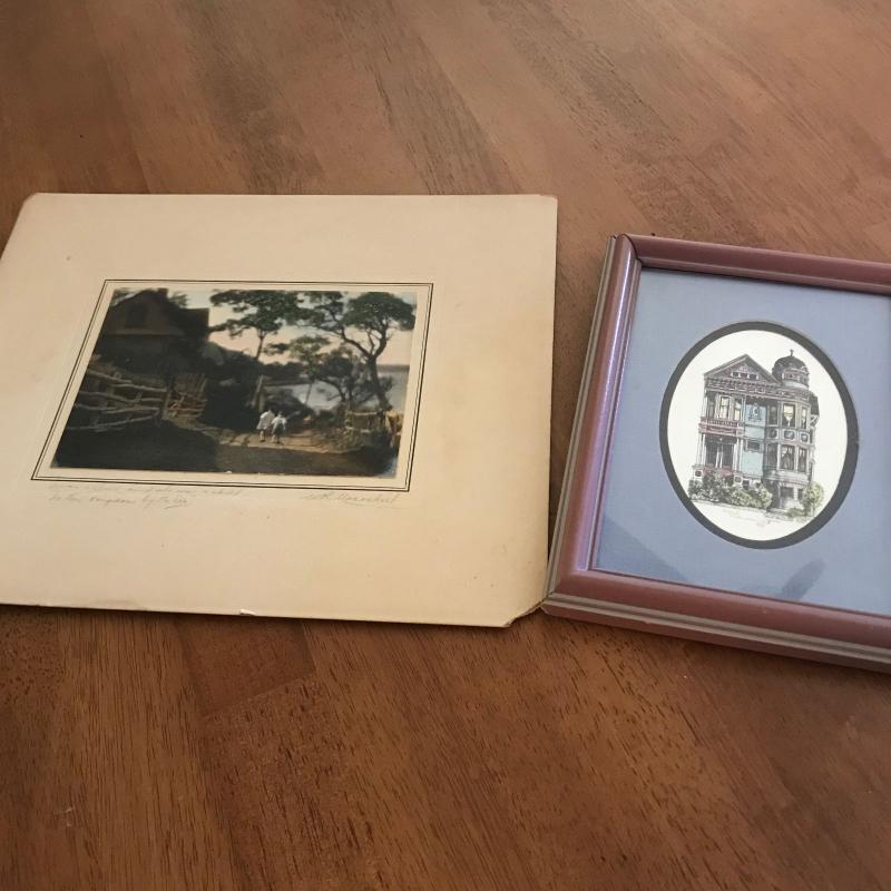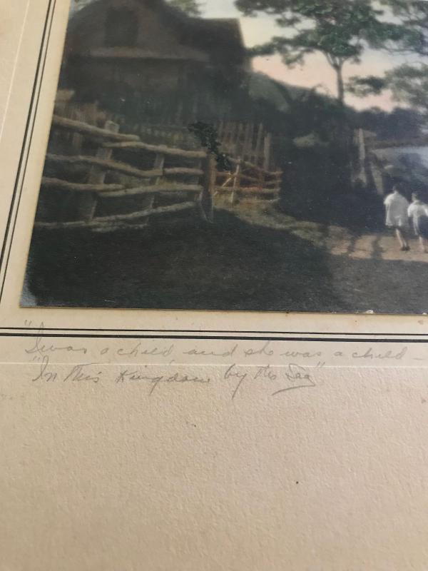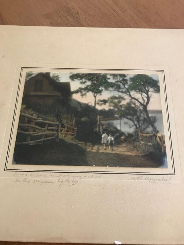Two signed pieces of art. One is a framed individually hand-painted and hand signed lithograph of an original pen and ink drawing by Mark Monsarrat. The other is by Wallace R. Macaskill, Nova Scotia photographer from the turn of the century. This piece is a pictorialist forum signed by the artist and titled “I was a child and she was a child - In this kingdom by the Sea. The mat has a rip and worn edges. Shipping available