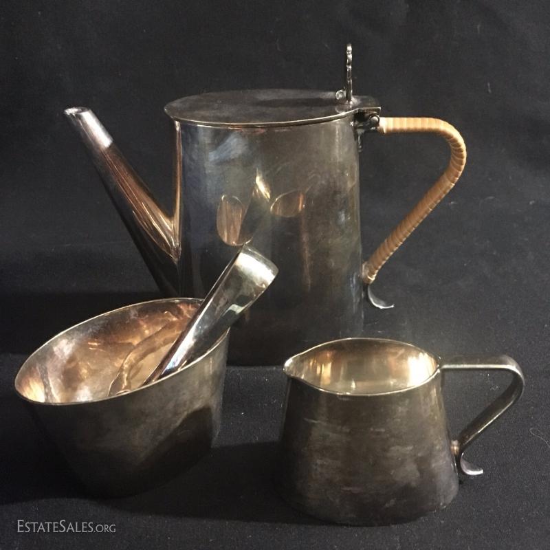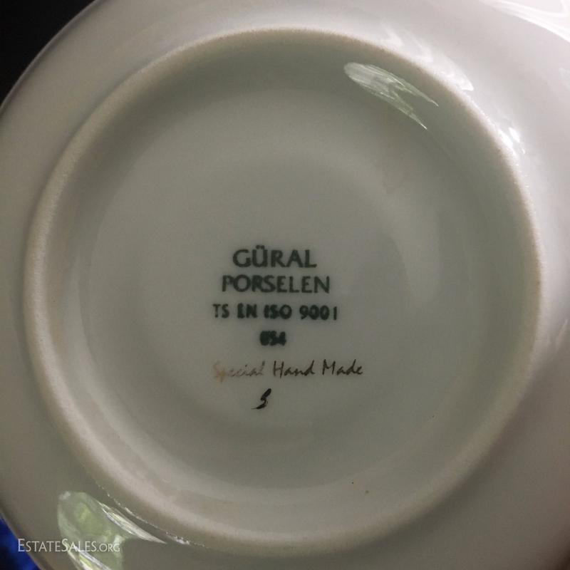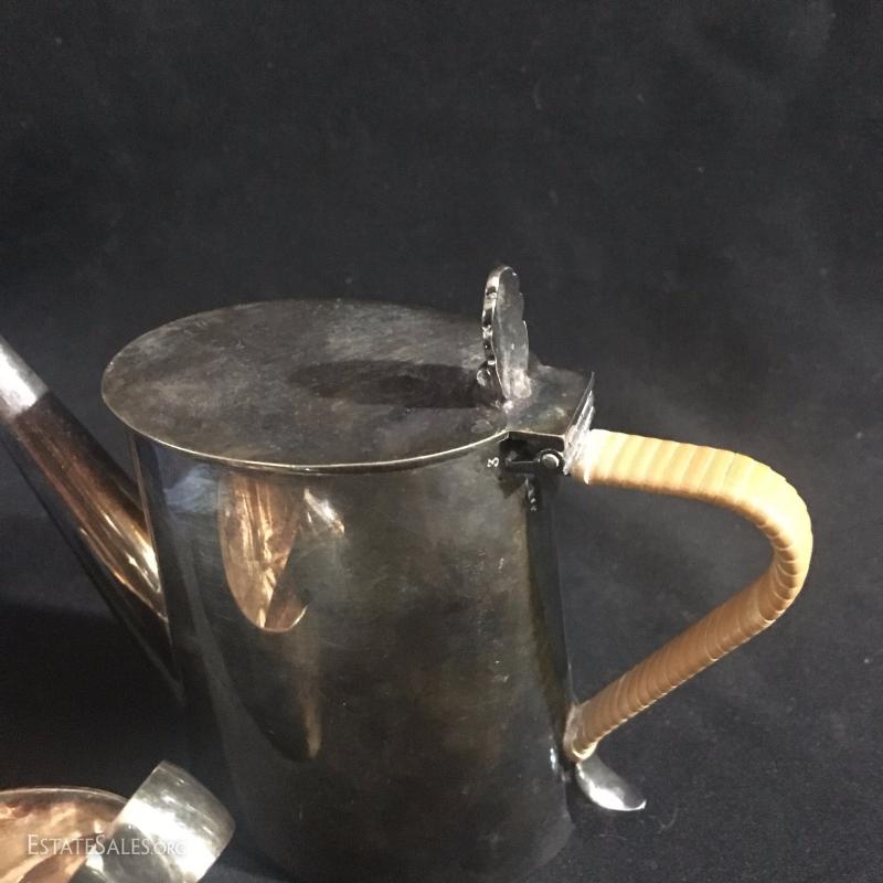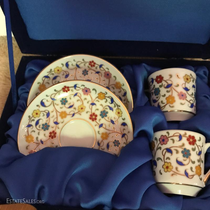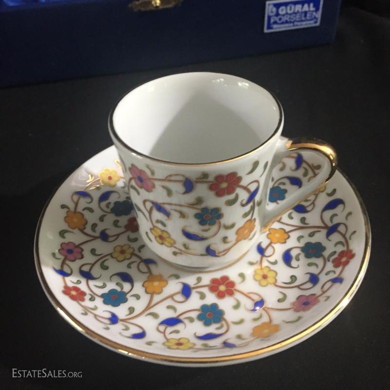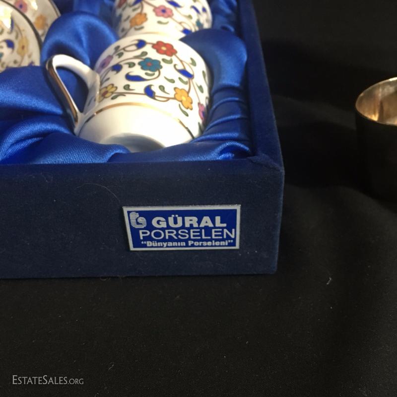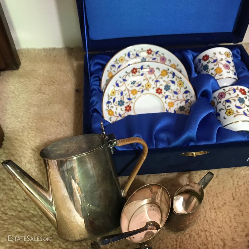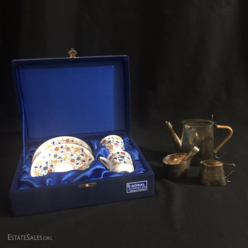 Silver set pitcher measures 4" tall x 5.5" w at handle. Two china tea cups and saucers by Gural Porselen in carrying case.