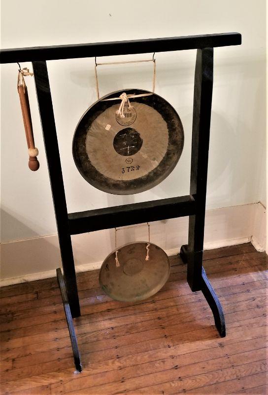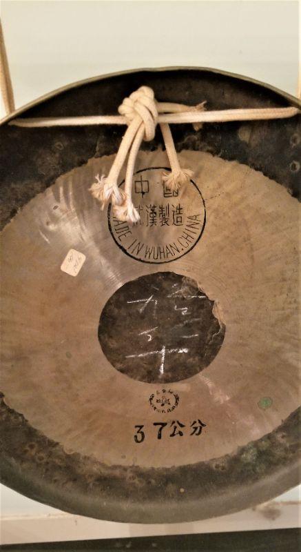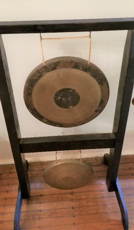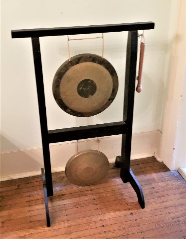 Interesting piece - double brass dinner gong - has mallets. i can tell you these give a resounding BONG! when you try them out! Made in Wuhan, China. 28" across, 41" tall. Black Wood frame.