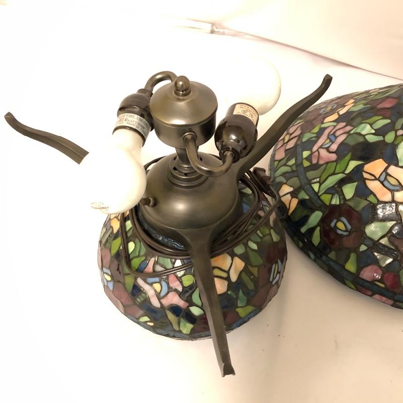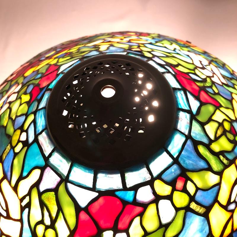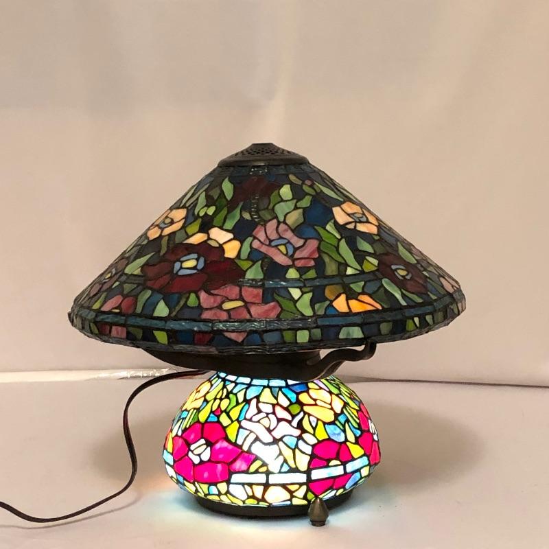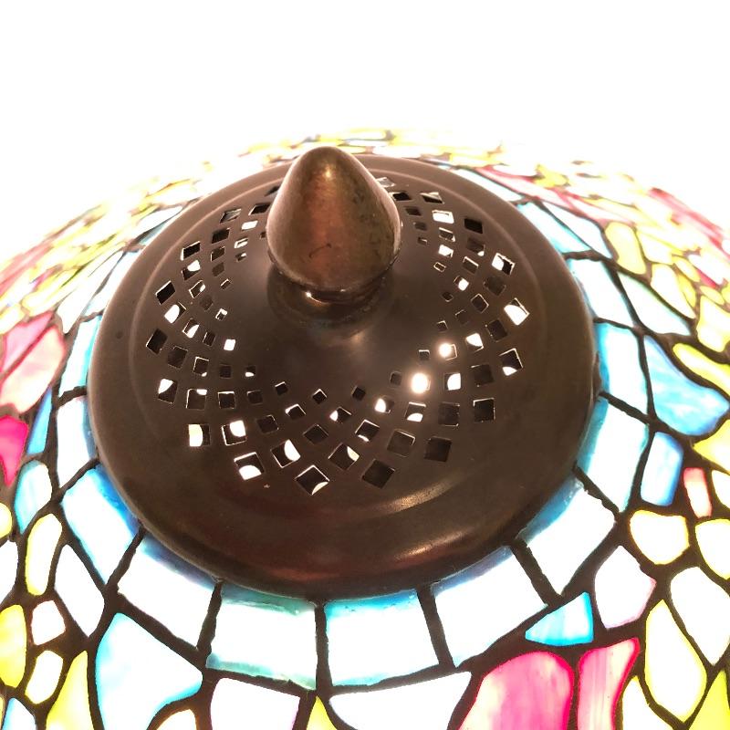 This unique and colorful Tiffany style mushroom lamp is in 2 pieces with the shade sitting on the 3 metal arms on top of the base. The knob that belongs on the top of the shade needs to be attached see photos.