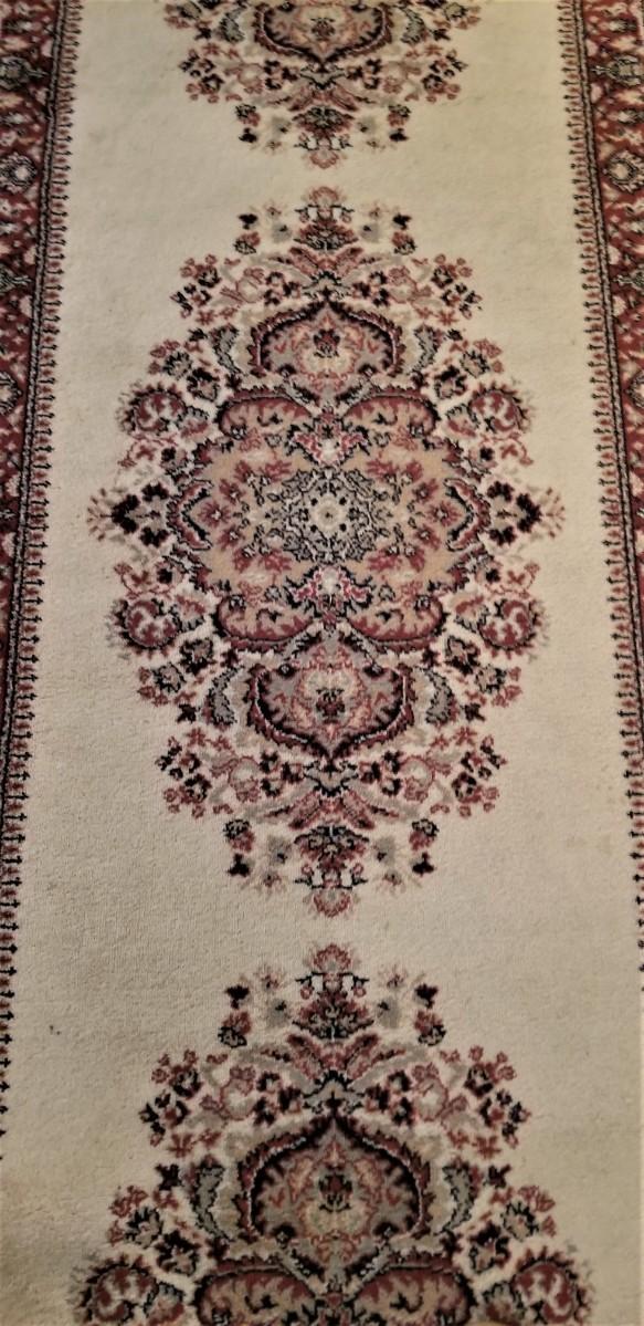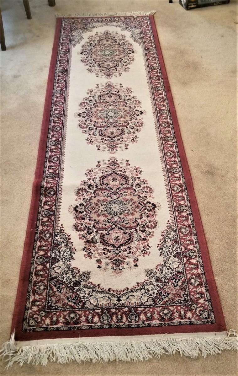Machine made rug/runner in the traditional style - burgundy and cream. Good condition. Measures 28" wide and 100" long, counting the fringe.