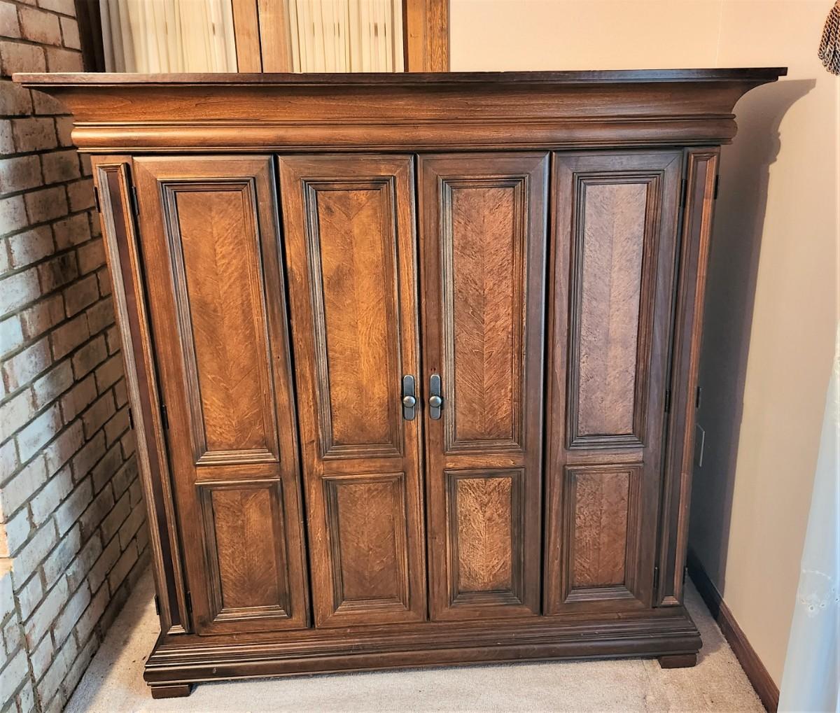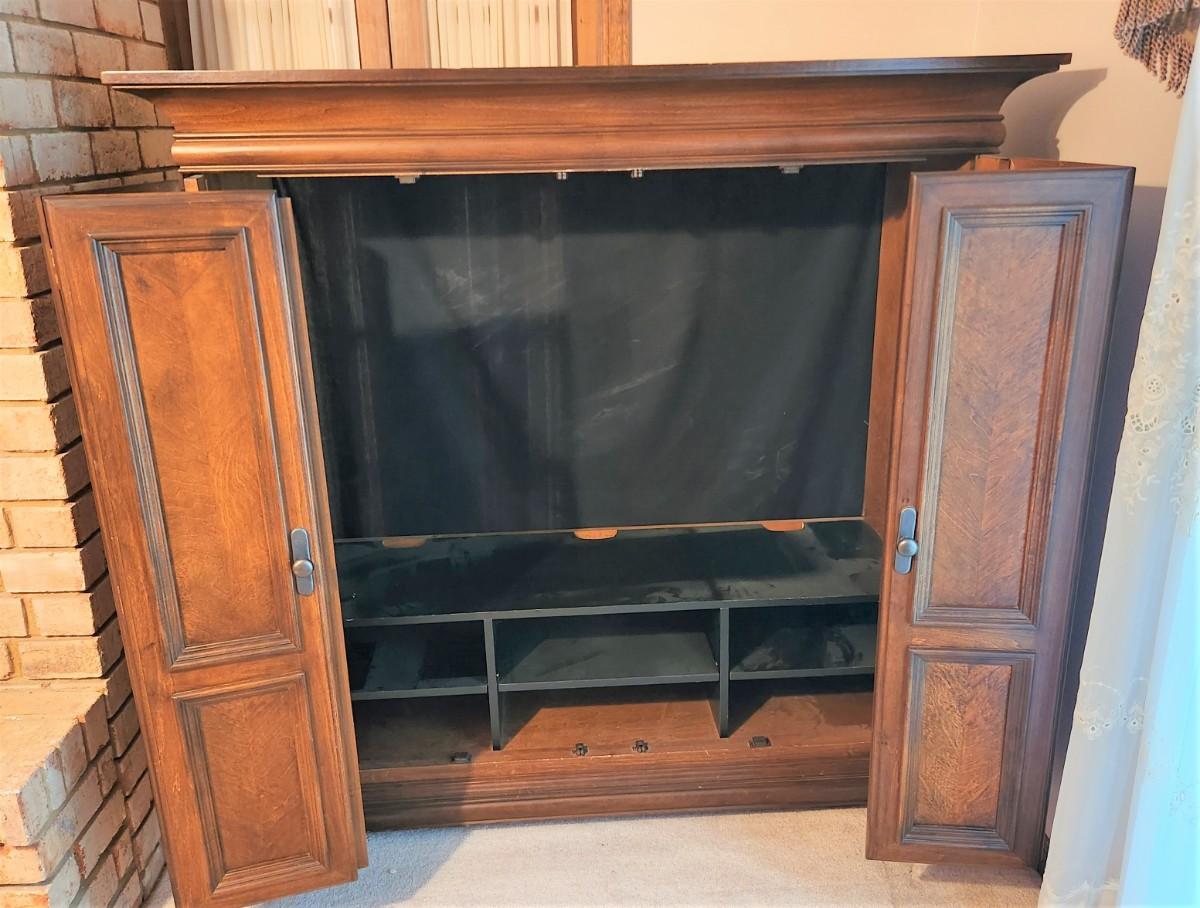 TV/Media Cabinet - measures 58.25" across, 21" deep, 58" tall. Used condition. Back has been removed and a black fabric drape placed there - as found.