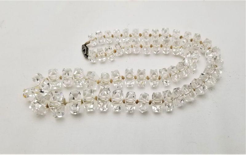 Two piece lot here - two vintage Aurora Borealis crystal necklaces - one is a double strand, measuring 21 inches long - some wear to back of clasp, which is set in rhinestones - the other is 18" long and the beads are "octagonal" and faceted on the sides - a form you rarely see. Both in good vintage condition - crystals nice and clear.