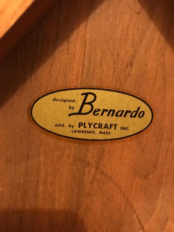 The very first production run of the famous MCM Cherner Pretzel Chair by Plycraft. Geoge Nelson recommended Norman Cherner to redesign his unsuccesful "pretzel chair" for Plycraft, who whas trying to break into the furniture market from making boat hauls in 1958. Cherner presented Plycraft's Paul Goldman with his new improved bentwood Pretzel Chair designs only to be told that Plycraft had decided to scrap the project. Six months later, Cherner found his chairs in a showroom for sale under the Plycraft label crediting design by "Bernardo". Cherner immediately sued Plycraft, who had to stop production. Goldman admitted that "Bernardo" was a fictitious name- and Cherner won the lawsuit. Plycraft was allowed to continue production of the chairs, but was required to pay Cherner royalties and credit him on the label. The chair was featured in Norman Rockwell's September 1961 Saturday Evening Post cover. Later Plycraft added black vinyl padded seat and back cushions. In the 1980's Cherner's sons revived production of the Pretzel Chair, but the reproductions have chunkier less tapered legs and a wider waist. This set of Plycraft Pretzel Chairs feature the original "Bernardo" label on the underside, definitively dating them to the first production run of 1958 before the lawsuit. They were origianlly purchased in 1958 in Washington DC with a coordinating Bowling Block extension table (Lot 92) and unlabled sideboard (already sold). Our consignor bought the set from the original owner in 1980. They are in excellent original condition with no cracks, breaks, or repairs. They are very sturdy given their delicate proportions- I weigh close to 300 pounds (unfortunatley), and they comfortably support me. A beautiful and sought after addition to any MCM collection. Armchair 25 1/2" x 23" x 31" H