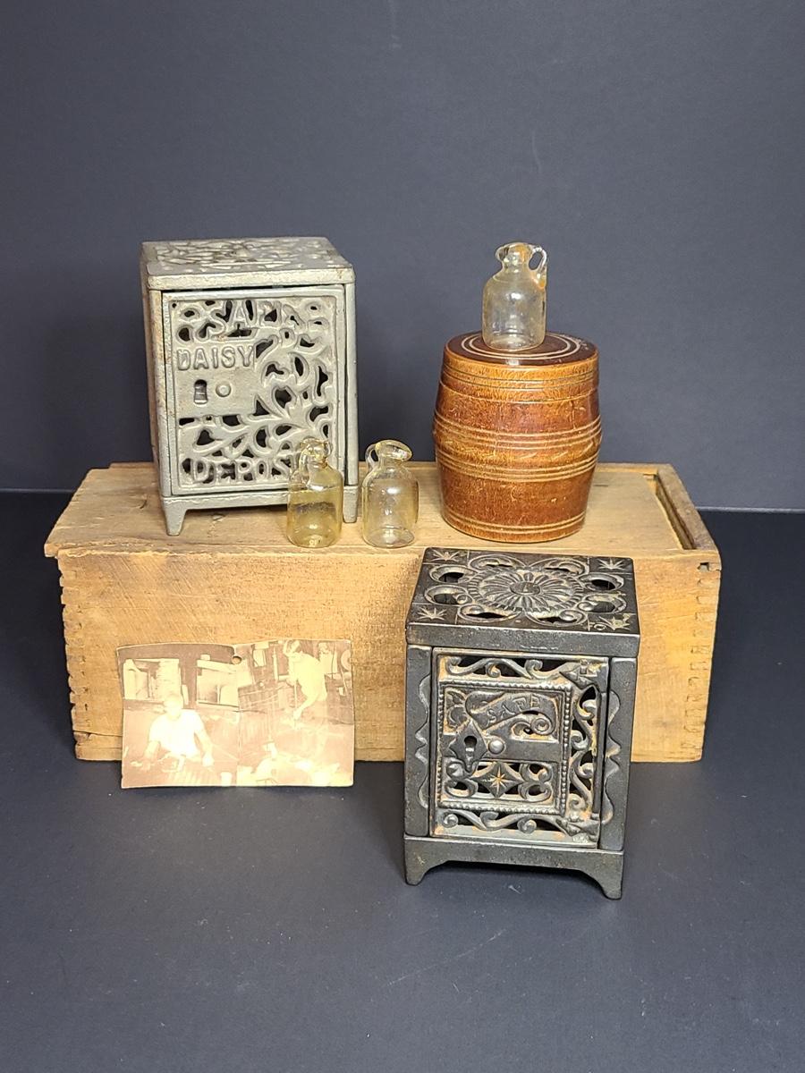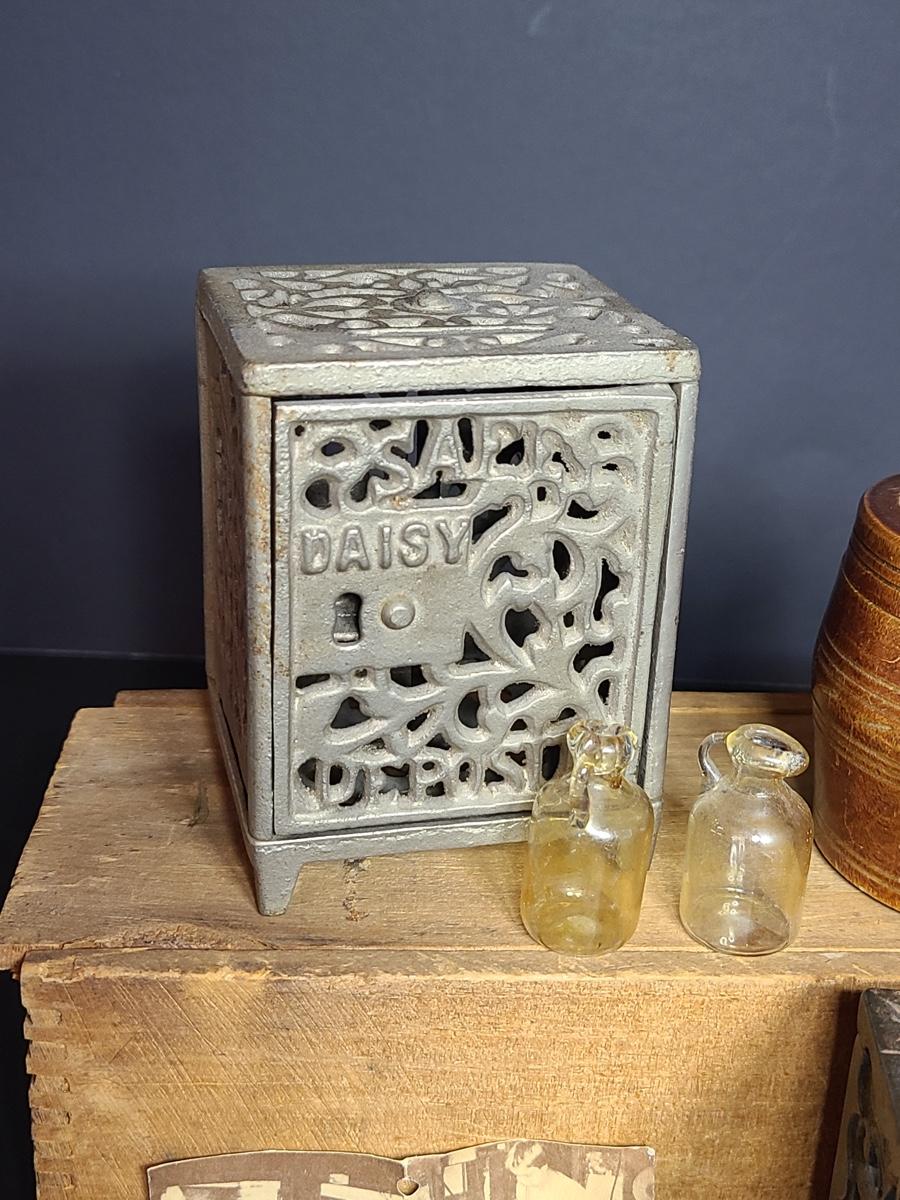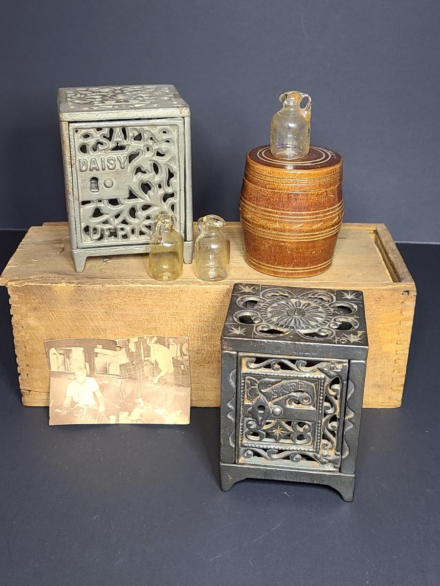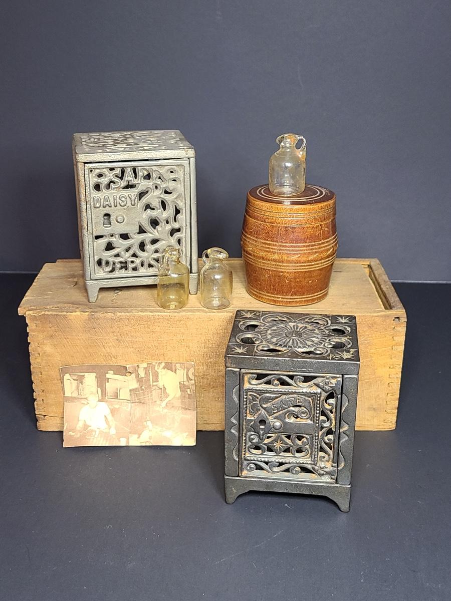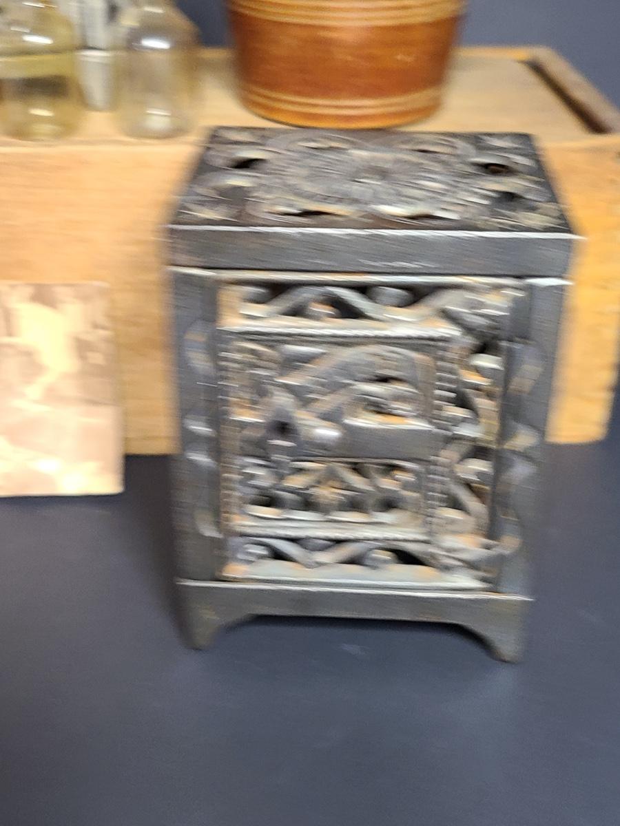 Vintage metal banks, no keys. Small glass blown bottles with a small history of Clevenger Glass, and wood carved primitive storage container. Please see all pictures as they are the best representation of the items. The pictures show condition, measurements if taken, and what is included in the lot. Due to the large amount that we photograph and the time frame, we are not always able to take measurements. All items unless noted, are pre-owned and have been used. If you purchased furniture, you must bring help. We do not allow one person to carry large furniture out on their own. Bring help, tools and a truck for the safety of our client’s homes, and your personal safety. Company policy. Thank you.