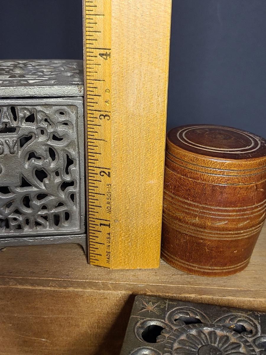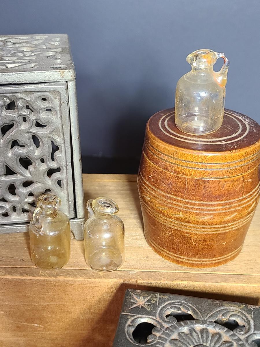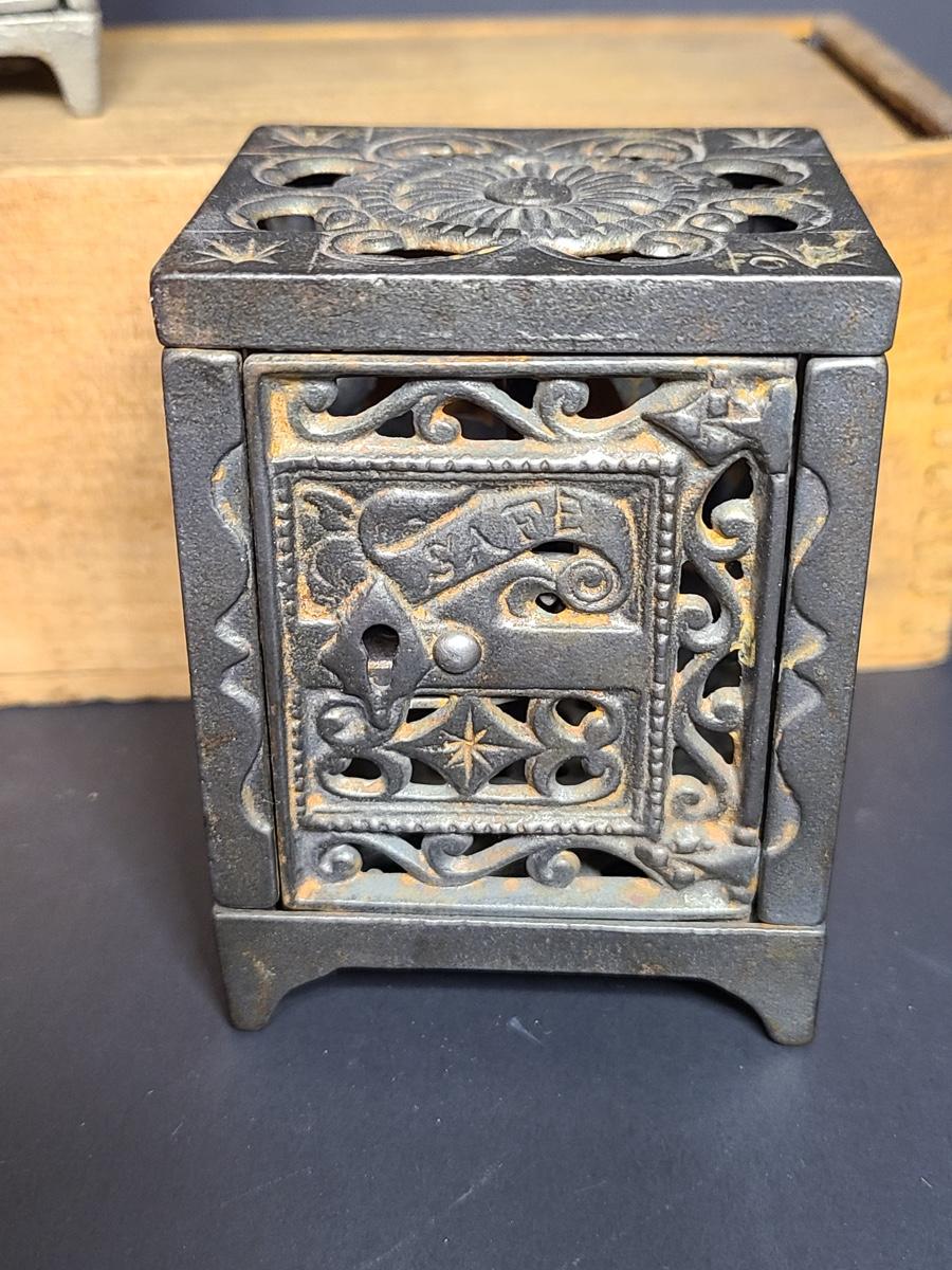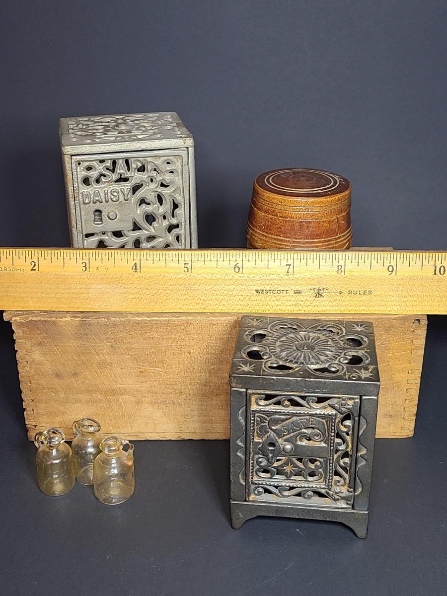 Vintage metal banks, no keys. Small glass blown bottles with a small history of Clevenger Glass, and wood carved primitive storage container. Please see all pictures as they are the best representation of the items. The pictures show condition, measurements if taken, and what is included in the lot. Due to the large amount that we photograph and the time frame, we are not always able to take measurements. All items unless noted, are pre-owned and have been used. If you purchased furniture, you must bring help. We do not allow one person to carry large furniture out on their own. Bring help, tools and a truck for the safety of our client’s homes, and your personal safety. Company policy. Thank you.