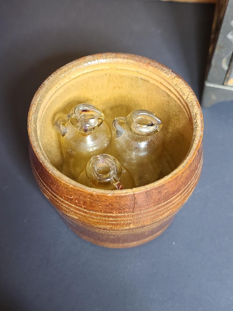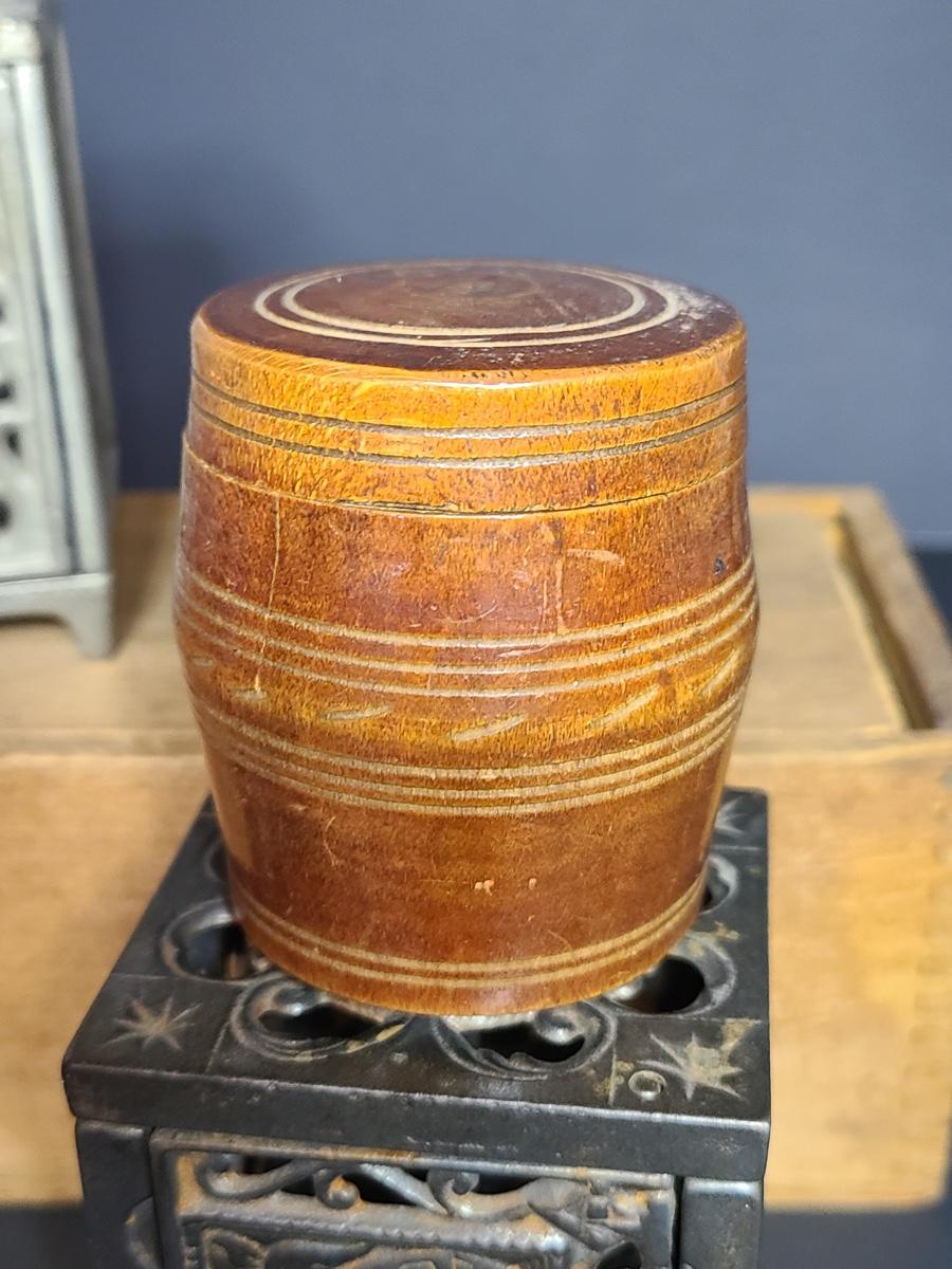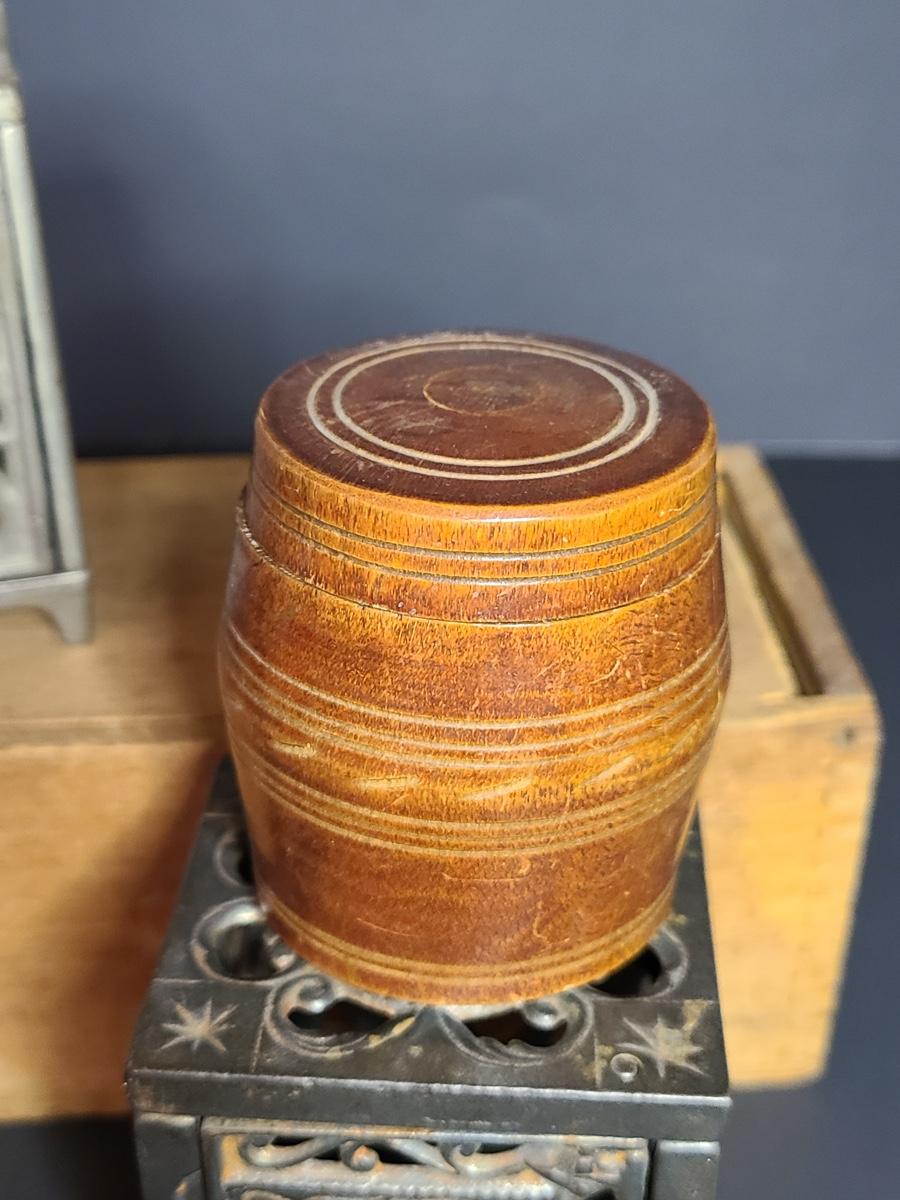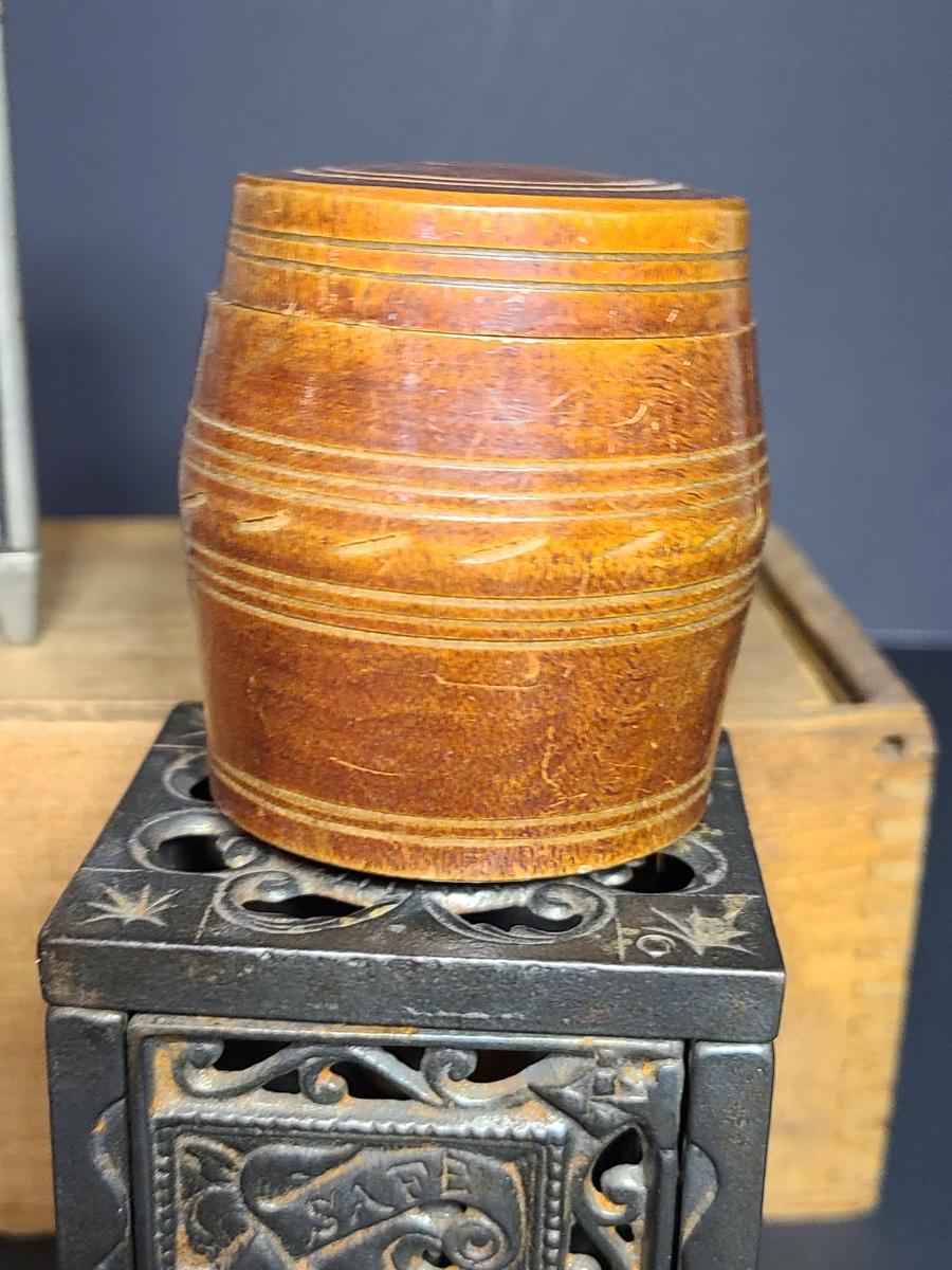 Lot 91: Vintage Banks, Clevenger Glass, and Wood Trinket Barrel