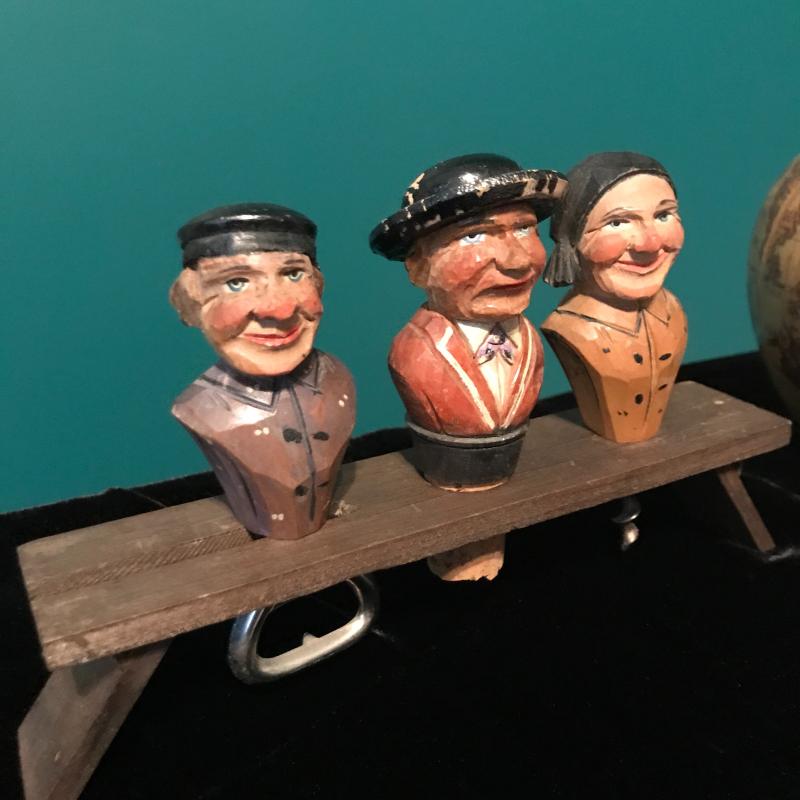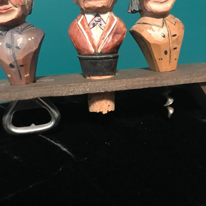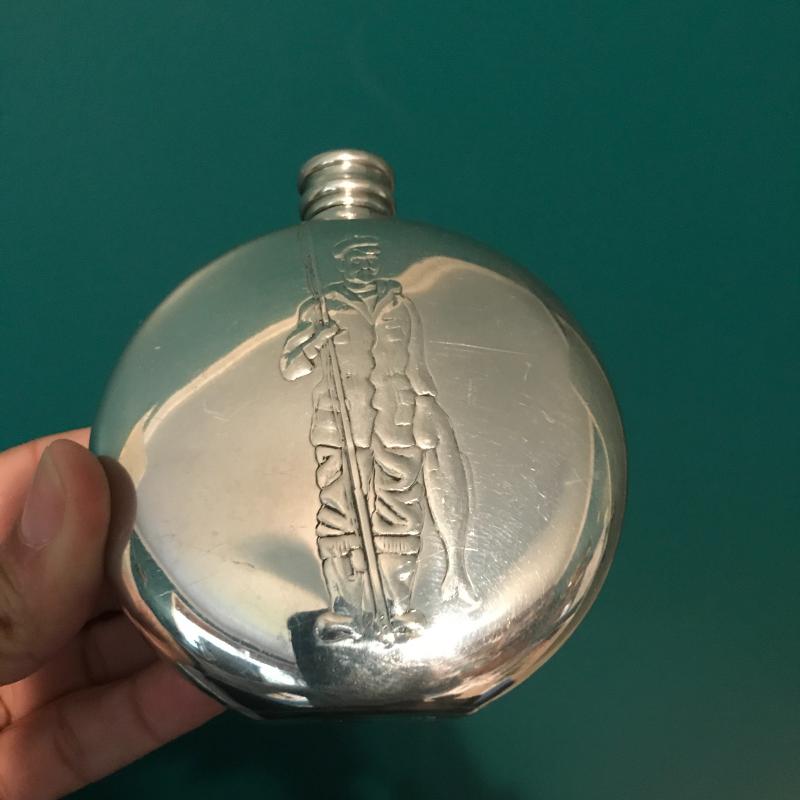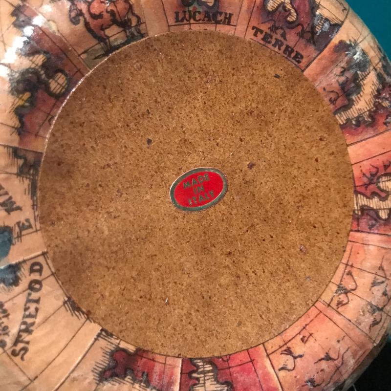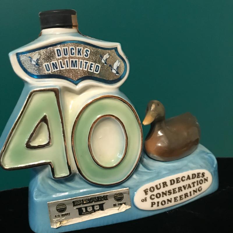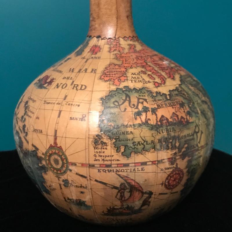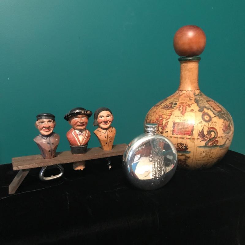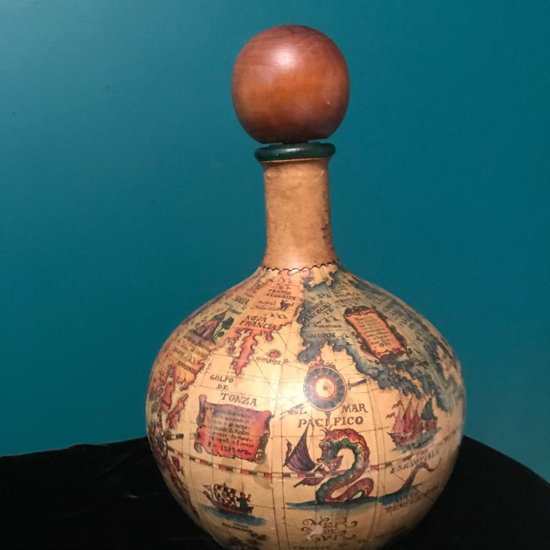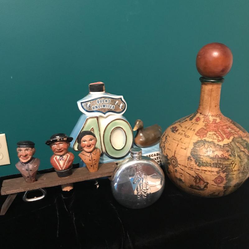 Vintage Map Covered Decatur, Bar Tools, Jim Beam vintage bottle and Sheffield English pewter flask. Bar tools are delicate and May be better for decor than use! Ducks Unlimited 40th anniversary bottle seal is tattered but appears to be unbroken. Bottle full but can not verify contents. This lot is a great bar set that can be for you or as a gift. Global Decatur measures 7”d x 11” h. Shipping available.