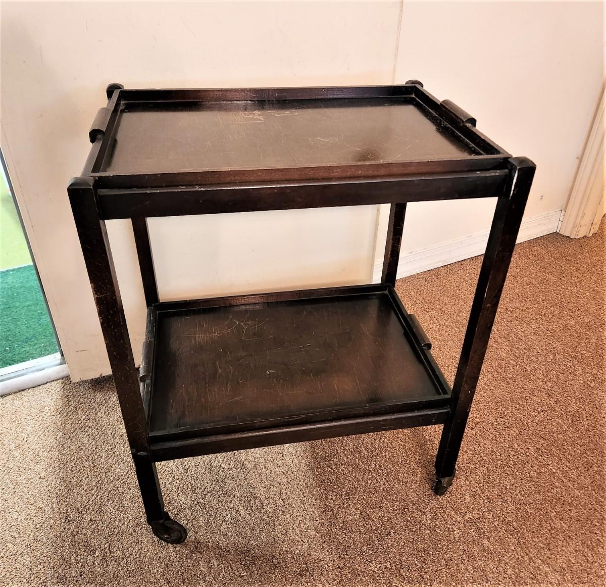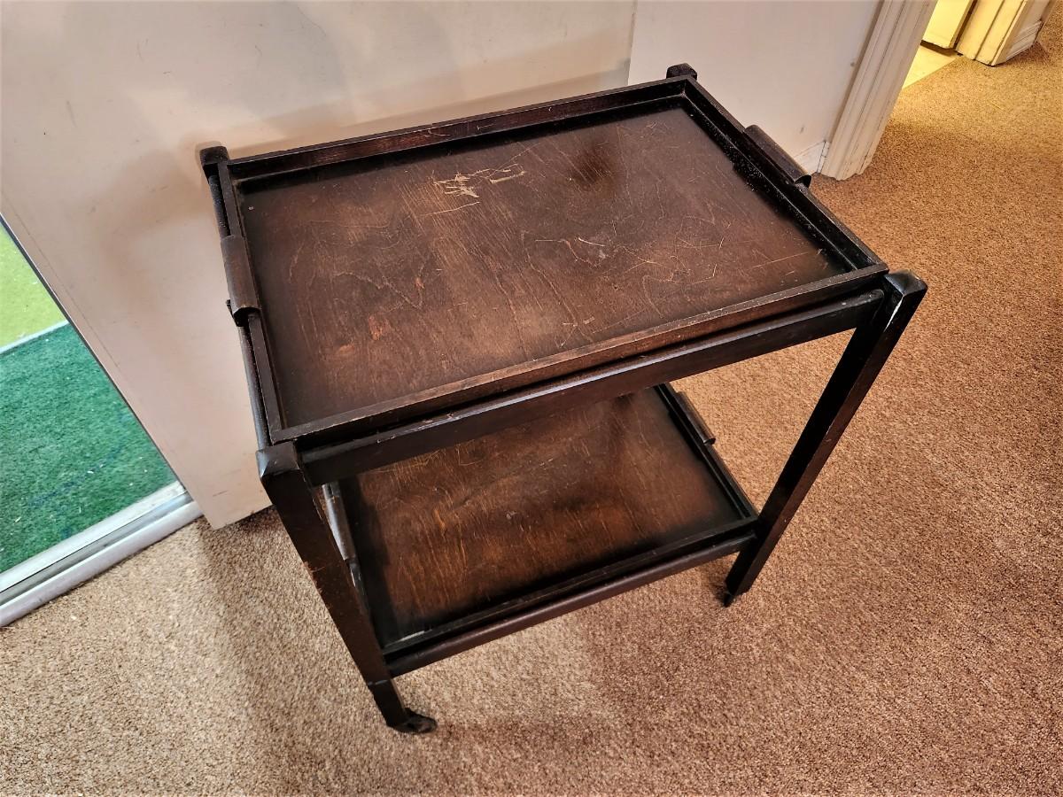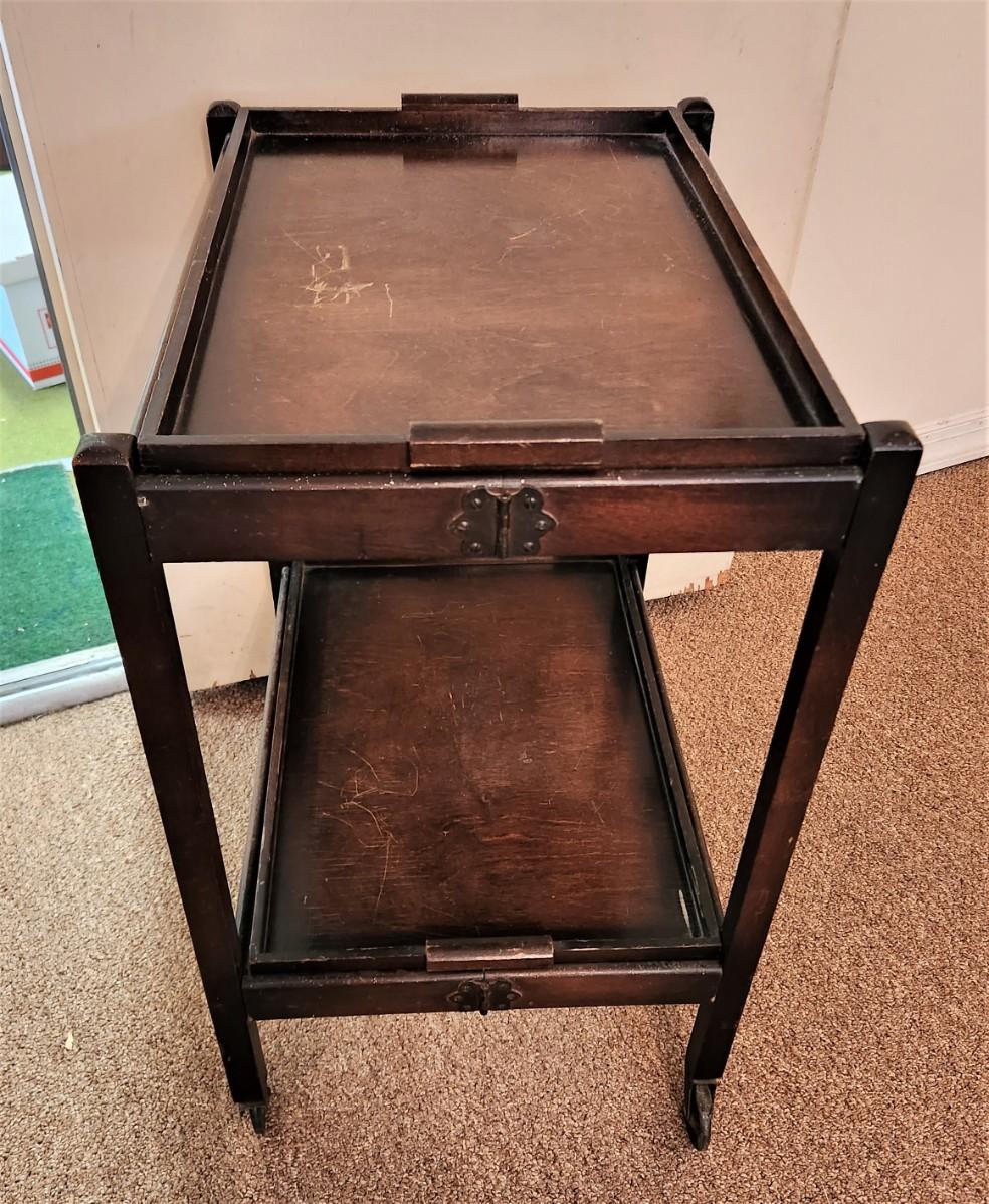 1930's folding tea cart with two lift out strays - on wheels. 17" wide, 23" across, 29" tall. Shows some wear, as shown. Refinish or distress/paint. A versatile piece,