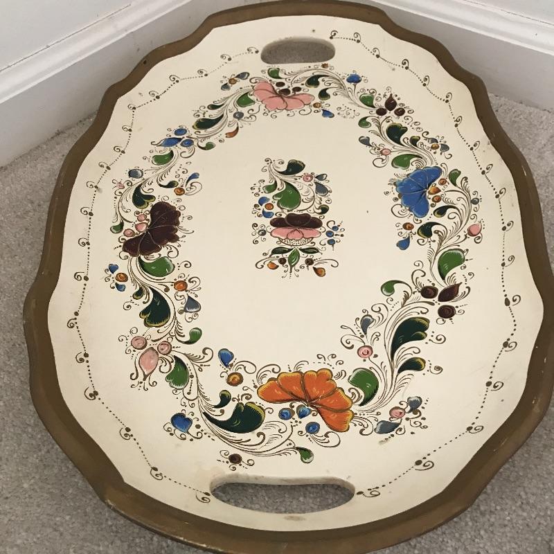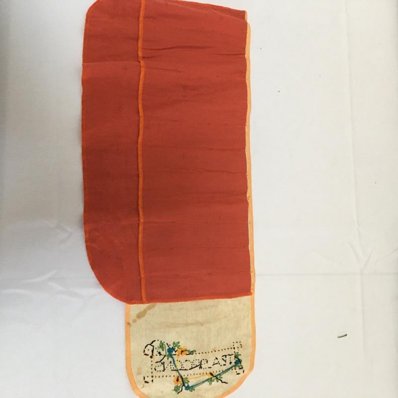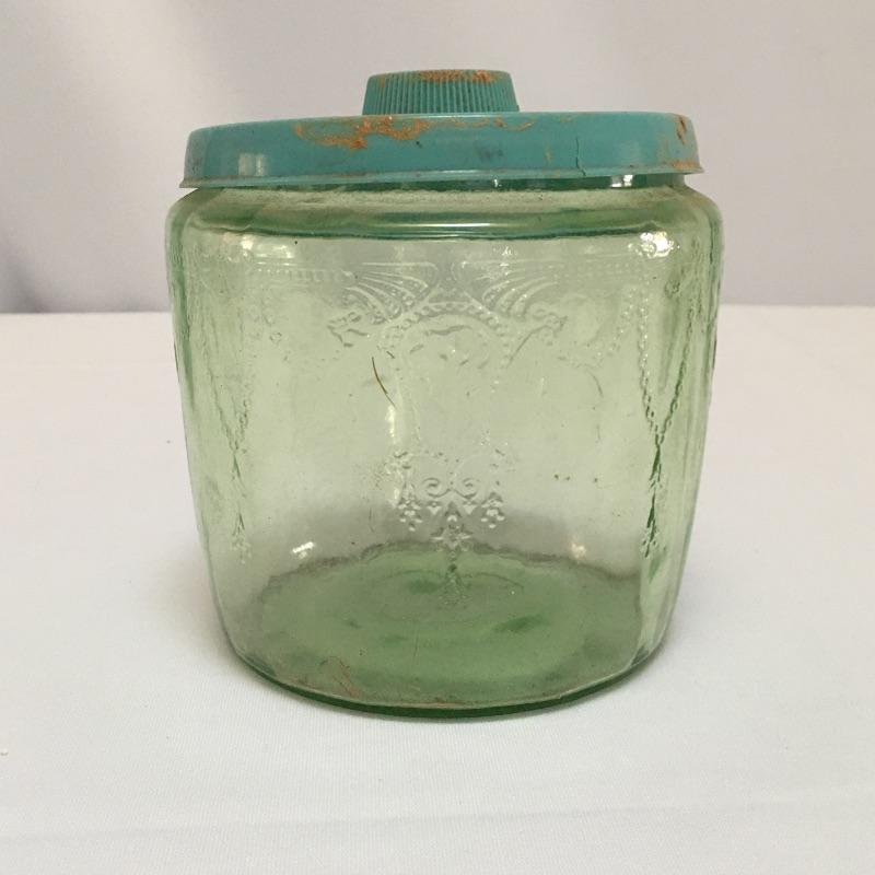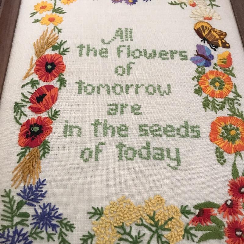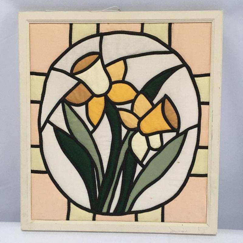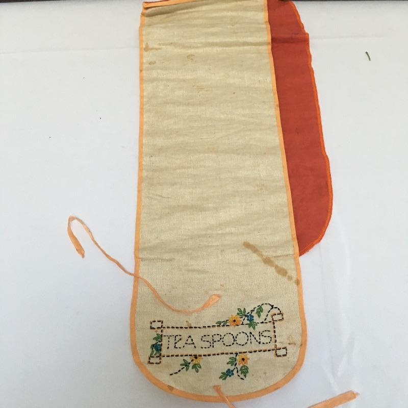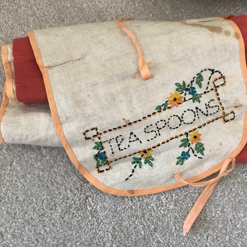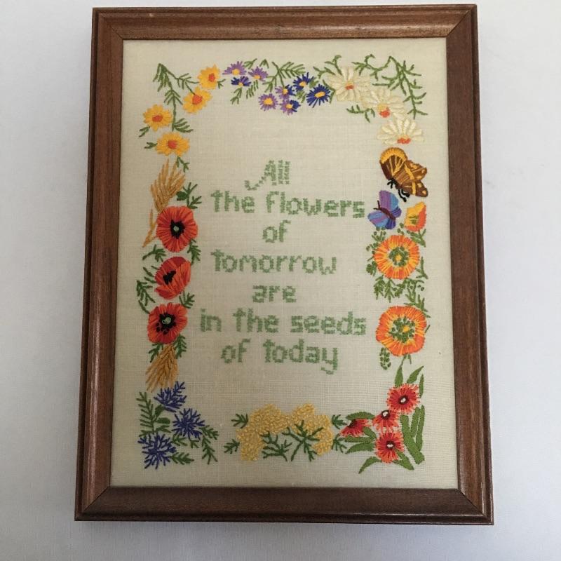 Vintage lot includes several sweet gifts. There are three framed handmade pieces -one quilted piece and two cross stitch artworks. You'll find a dainty handmade teaspoon storage wrap (could use a good cleaning). There is a glass storage jar with a plastic lid (you can use with out lid) and a decorative tray as well. You may feel nostalgic with this classic lot. Largest frame measures 18.75” x 20.5”. Lid to jar has crack, see pictures.