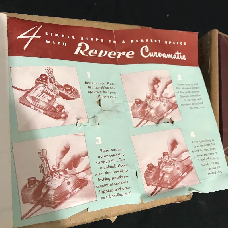 Vintage Revere Curvamatic 8mm and 16mm Film Splicer with original instructional pamphlet and box! Pamphlet boasts a “Never before a splicer so speedy and simple to operate!” Appears to be in working order, but not verified. Shipping available.