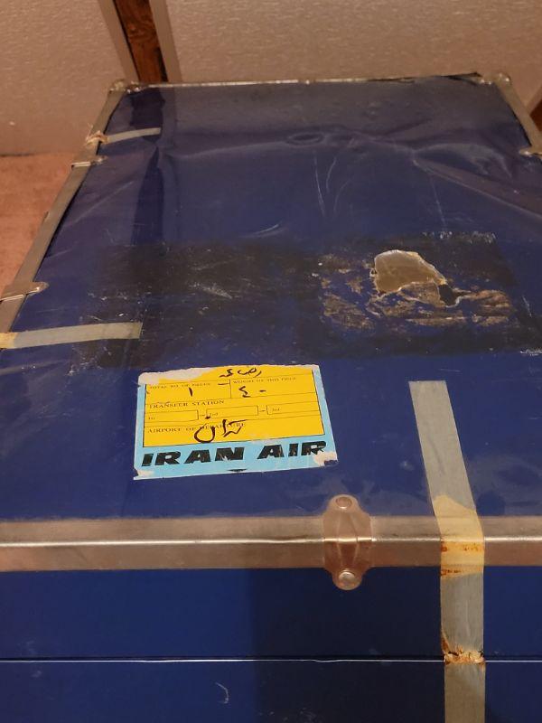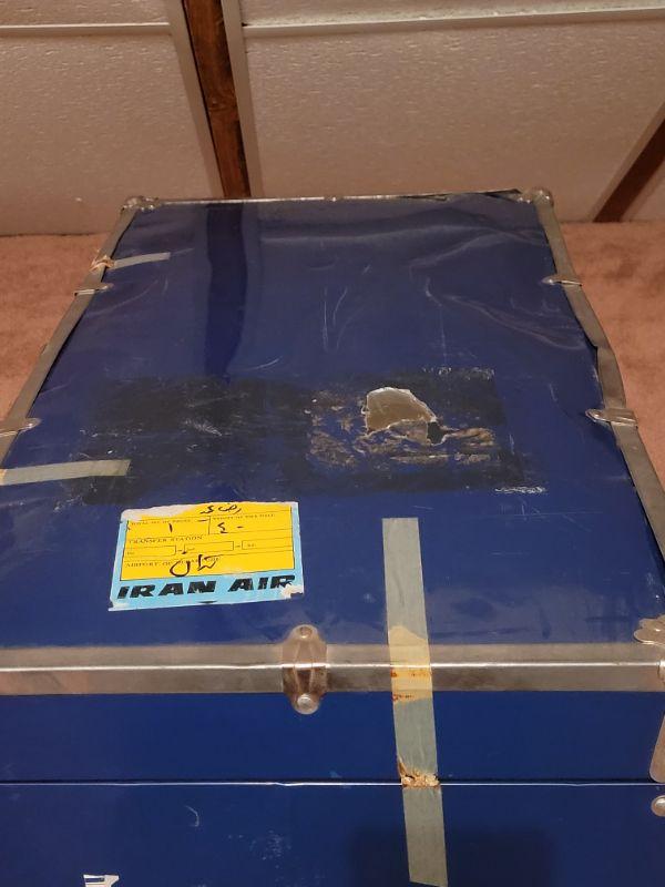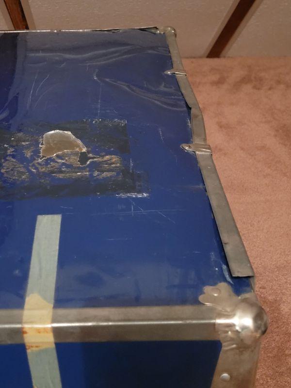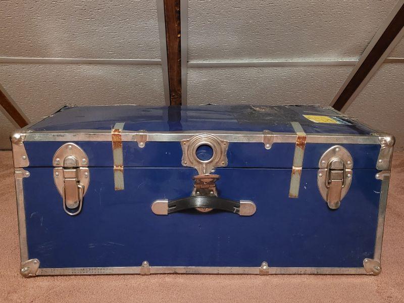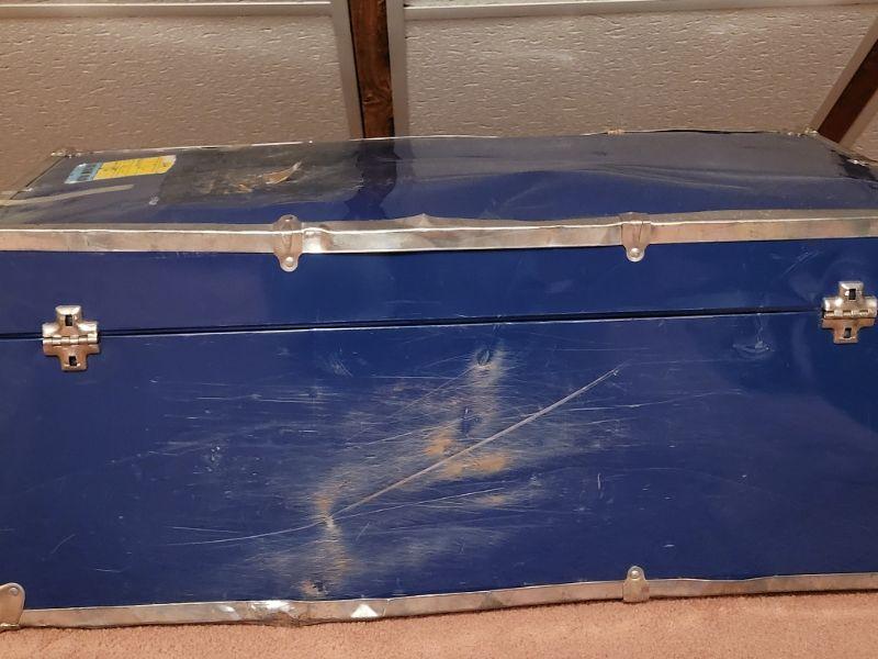 Lot 910: Vintage Blue Metal Trunk (has some damage from travel)
