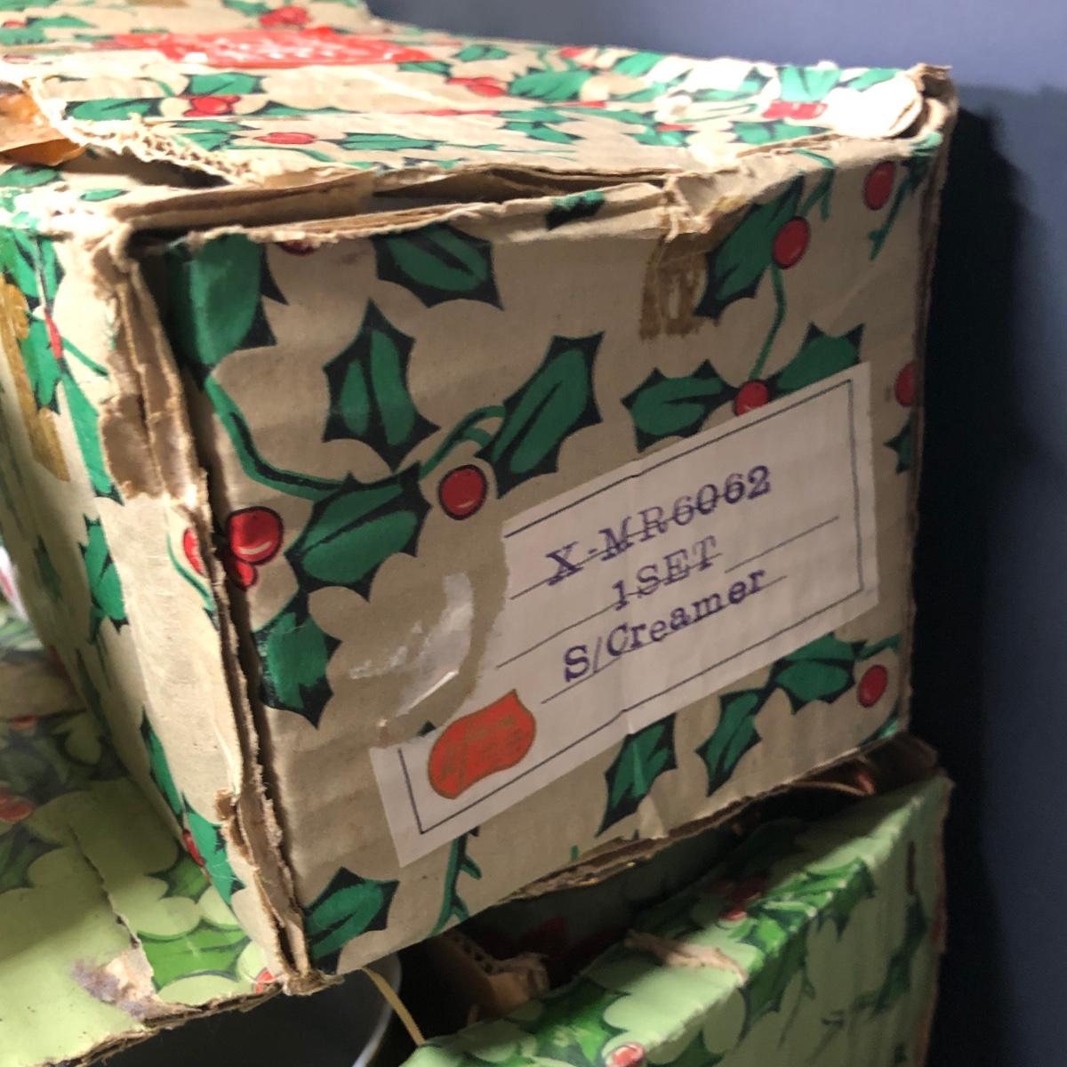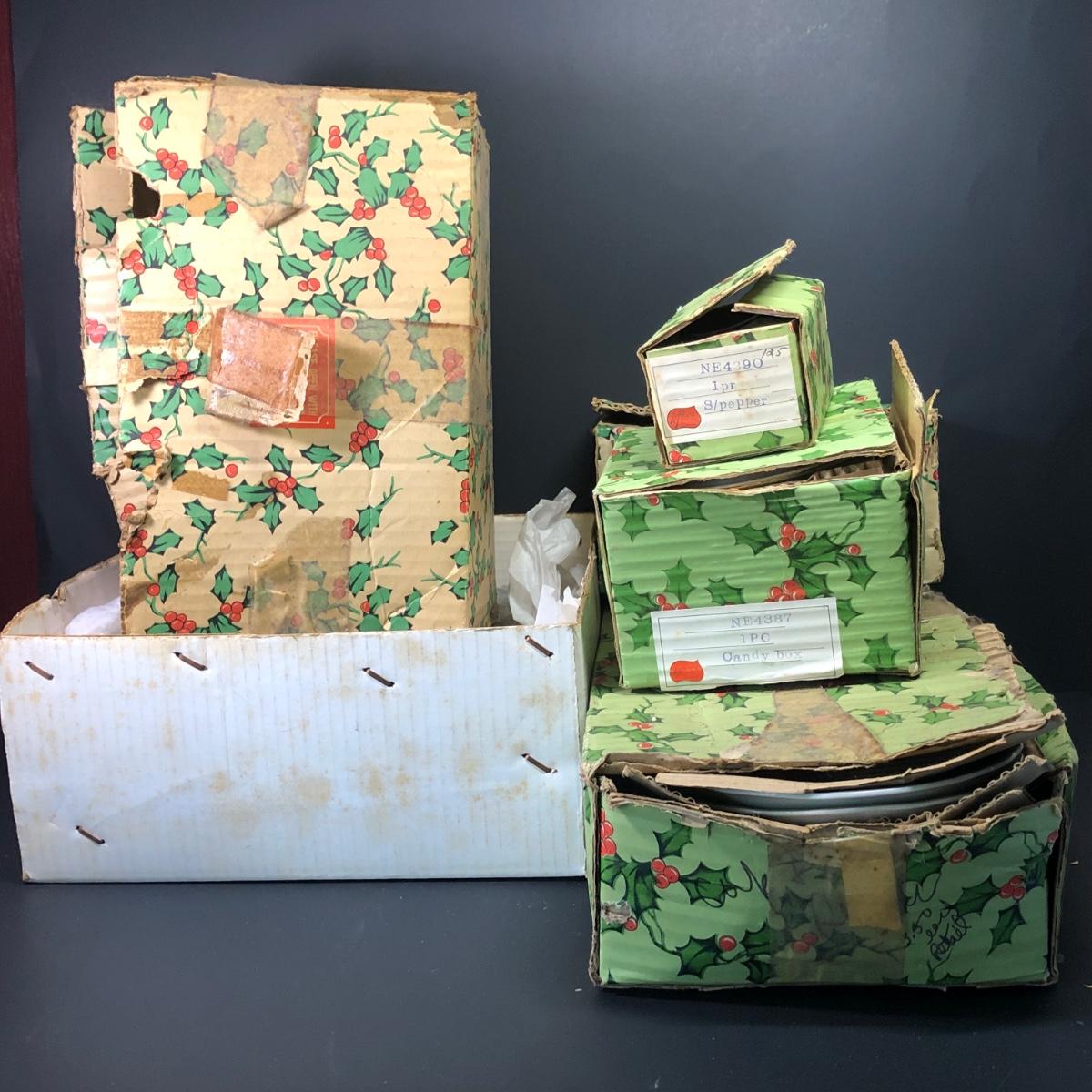 Includes dinner plates, saucers, mugs, tea pot, sugar bowl, creamer, banana shaped dish (4398), candy dish (4387), salt & pepper shakers. Includes some original boxes with condition issues.