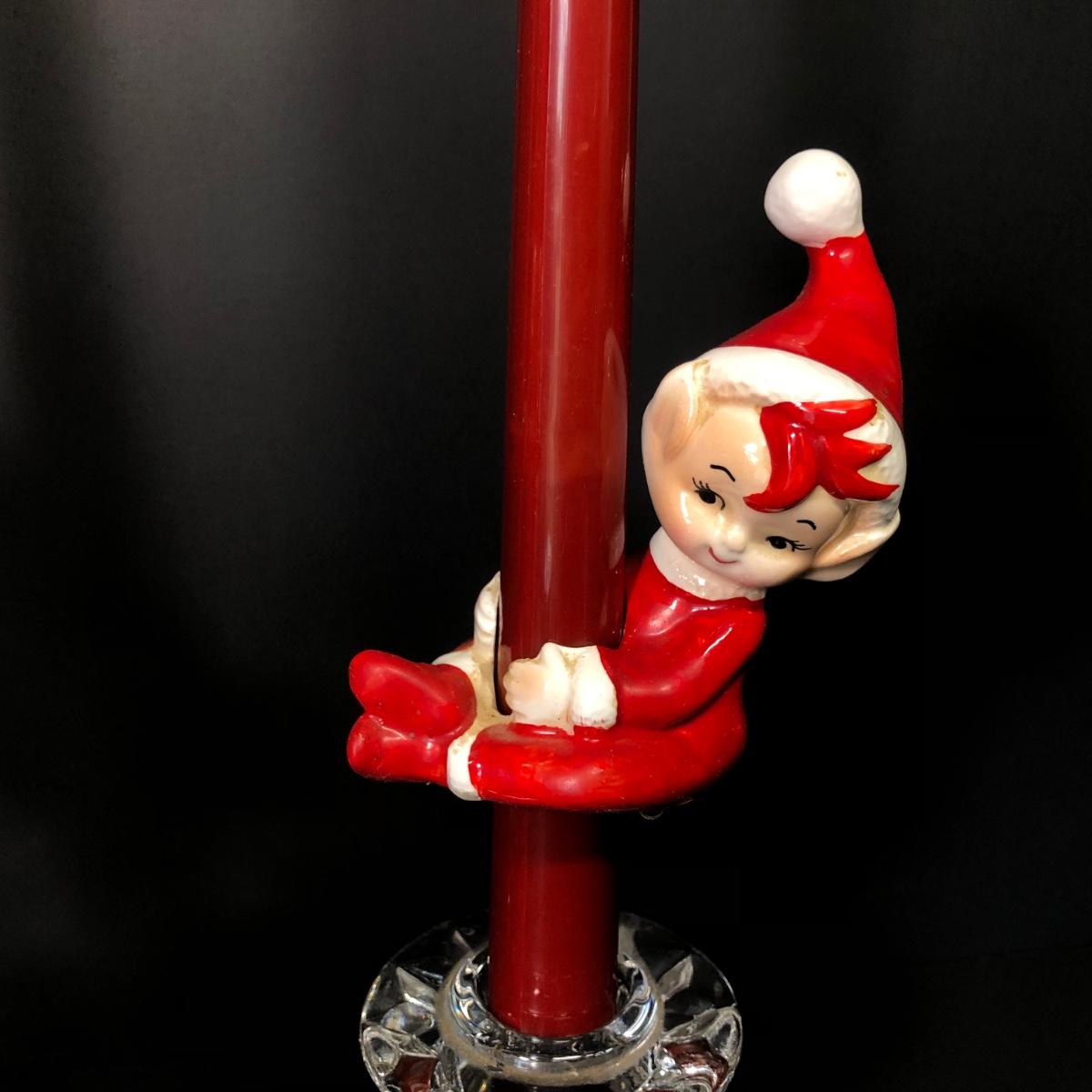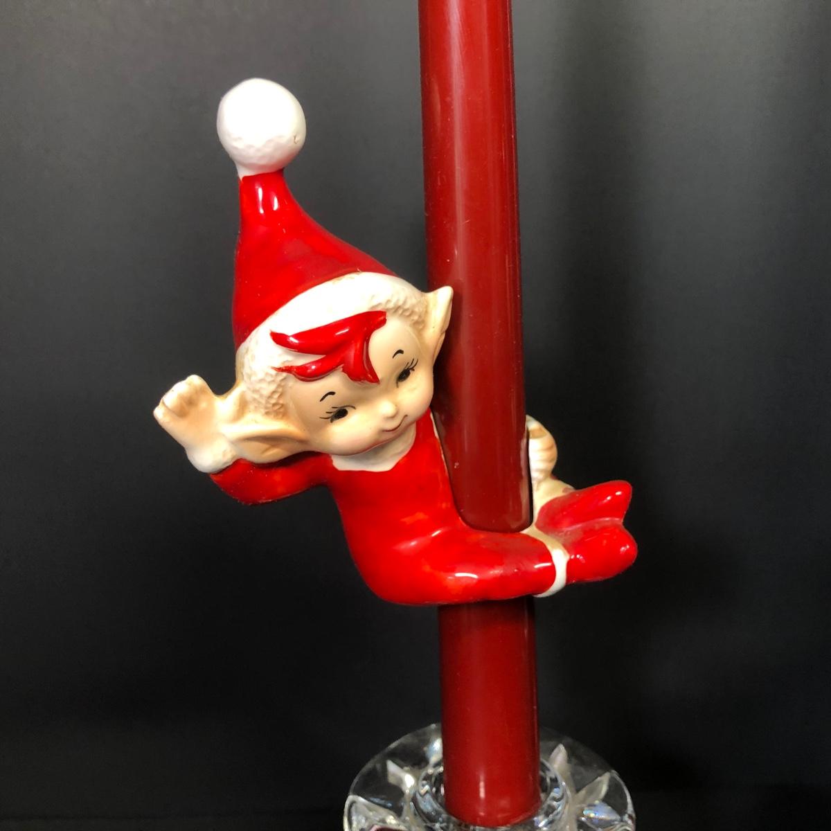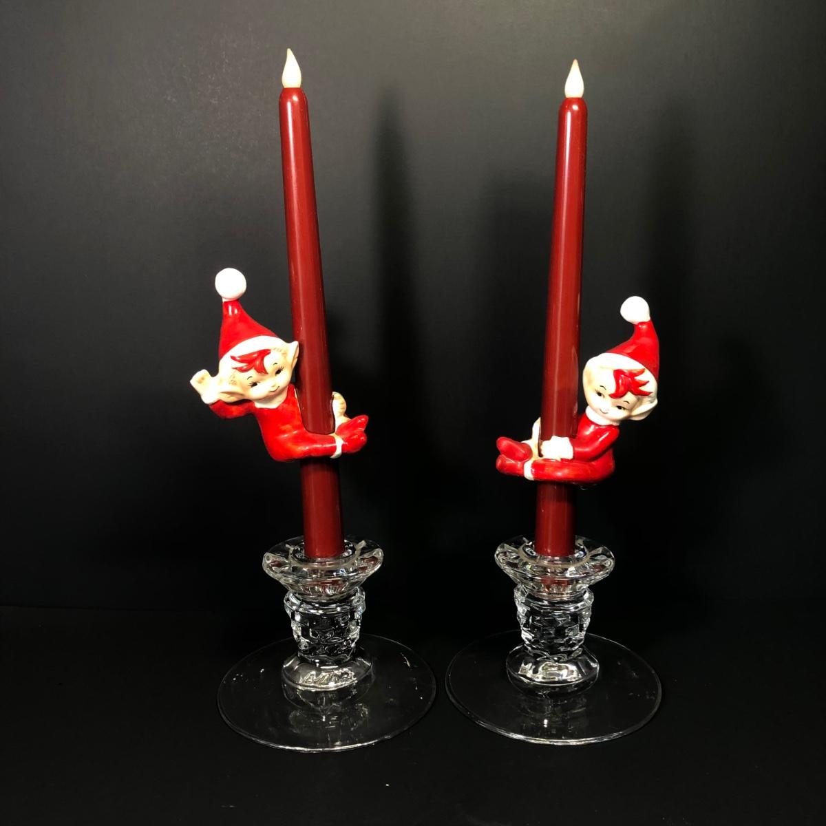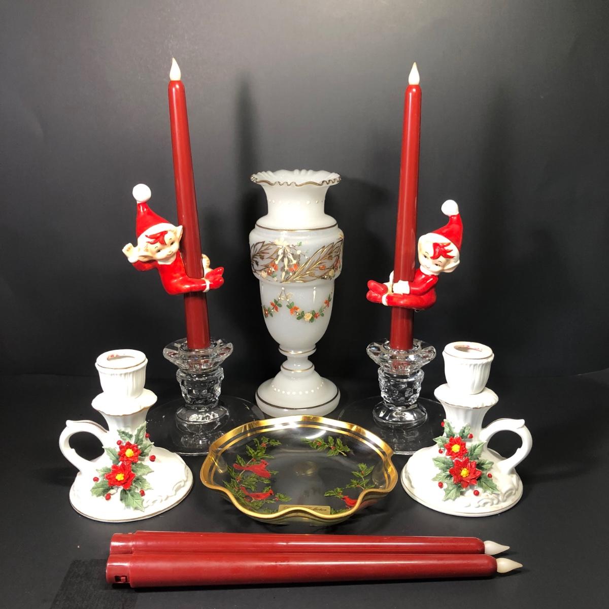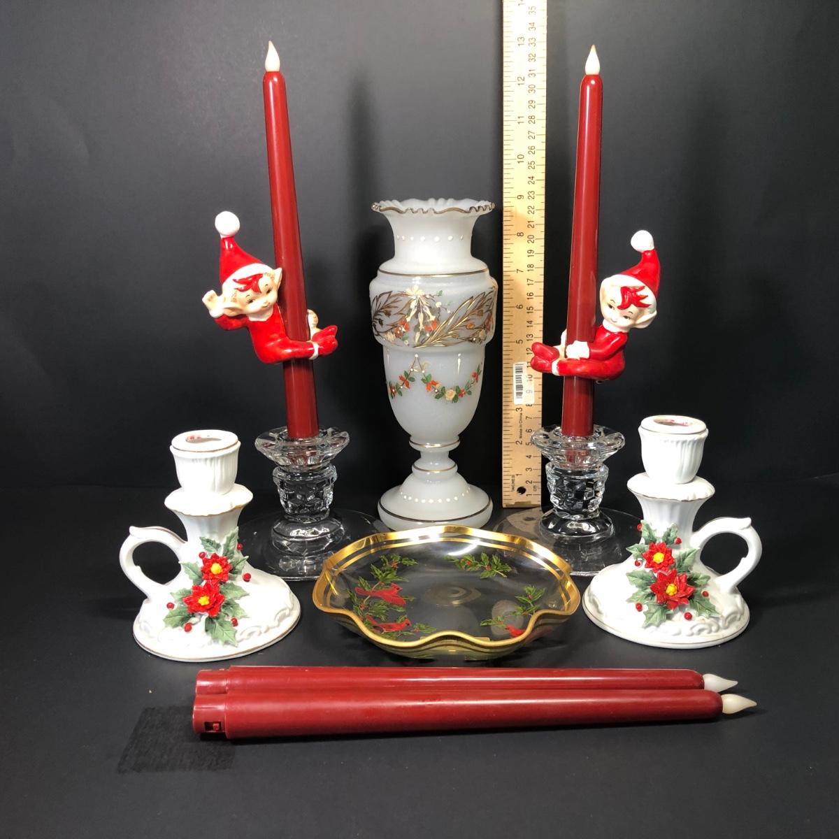 LOT 11M: Christmas Collection - Lefton Candlestick Holders (KW8024), Lefton Glass Cardinal & Holly Dish, Ceramic Elf Candle Huggers, Battery Operated Candlesticks & More