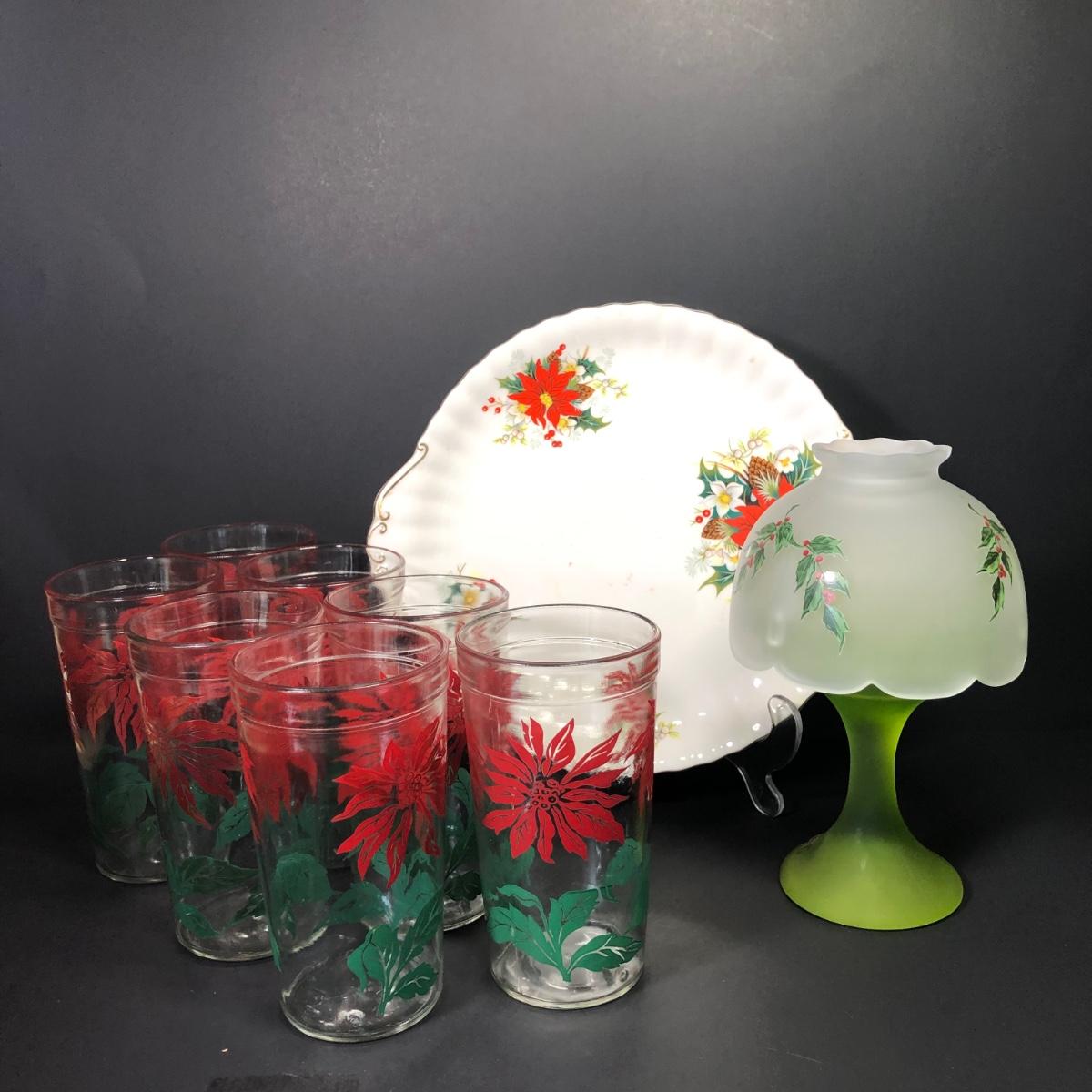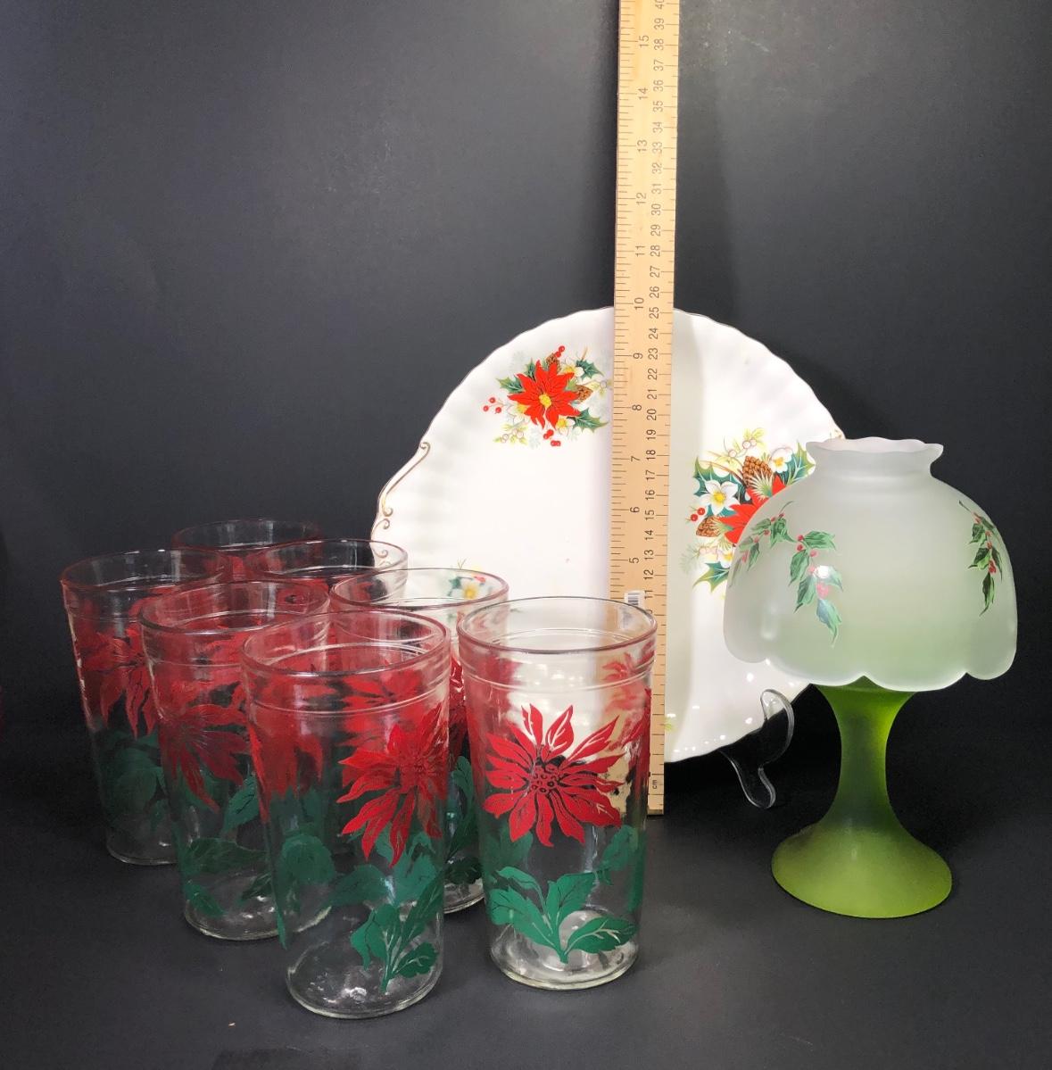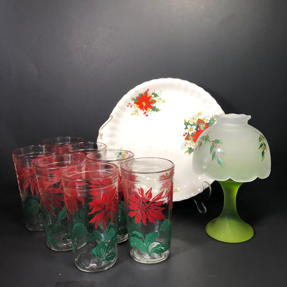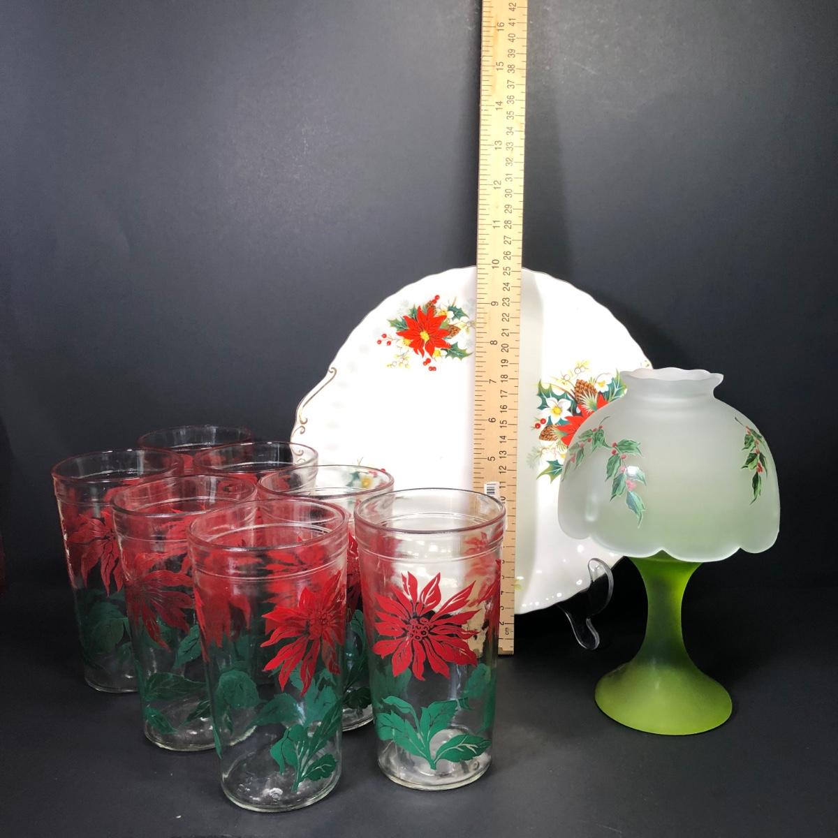 LOT 12M: Westmoreland Glass Holly Lamp, Royal Albert "Yuletide" Plate & 7 Poinsettia Glasses