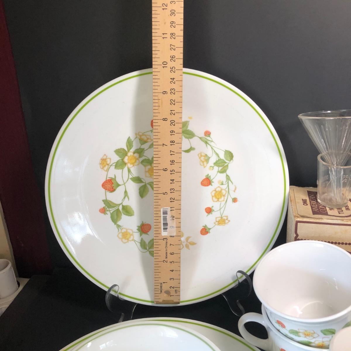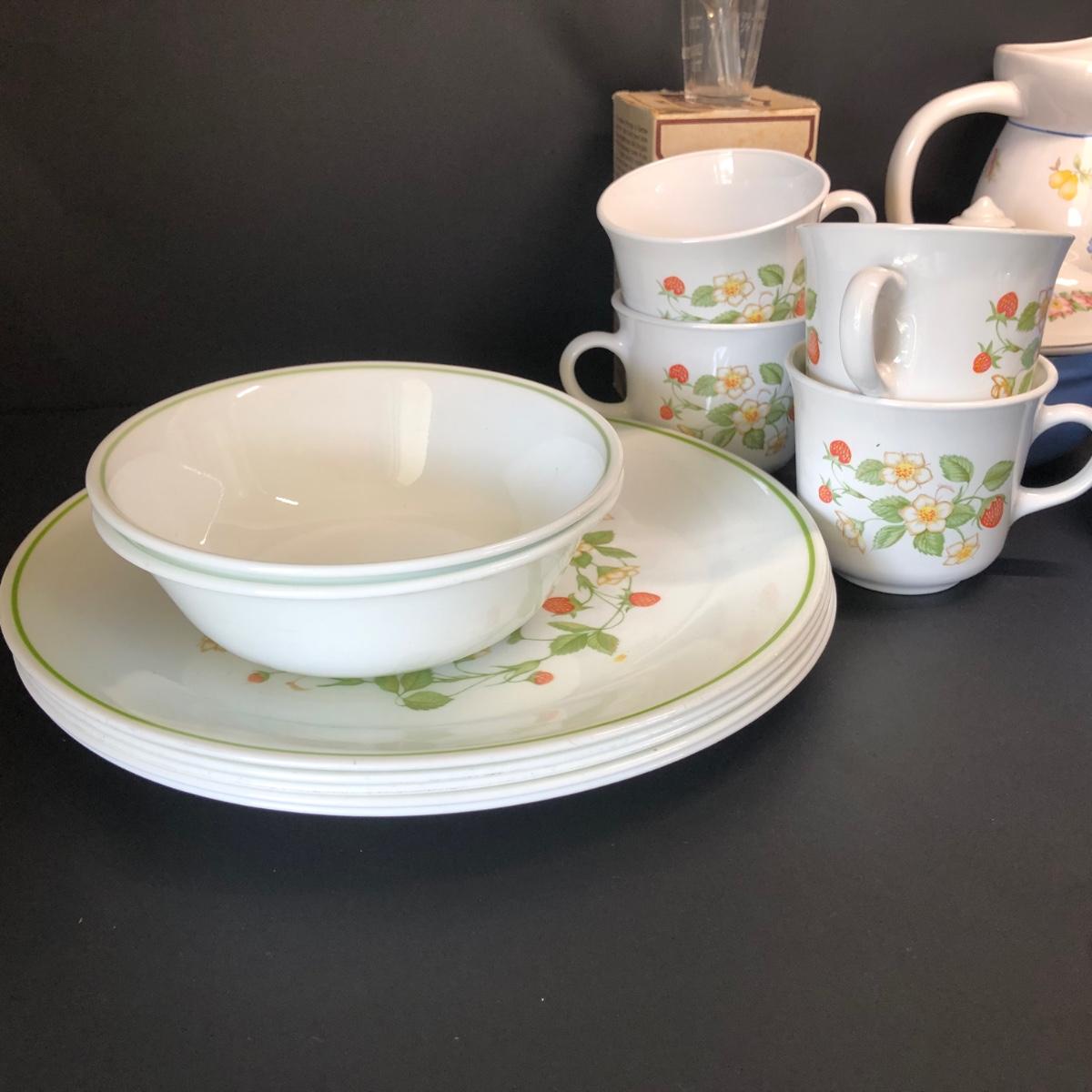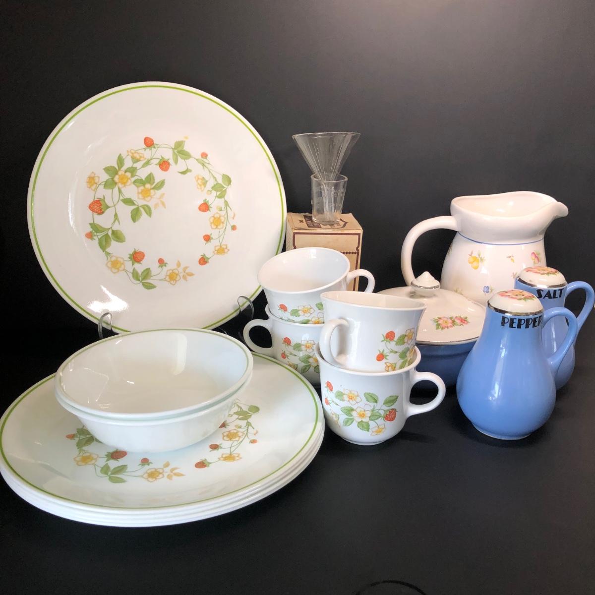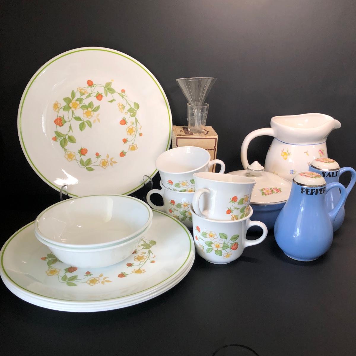 LOT 19M: Corelle Strawberry Sundae Plates, Bowls & Tea Cups, American Concord Tumblr NIB, Hall's Sugar Bowls, S&P & More