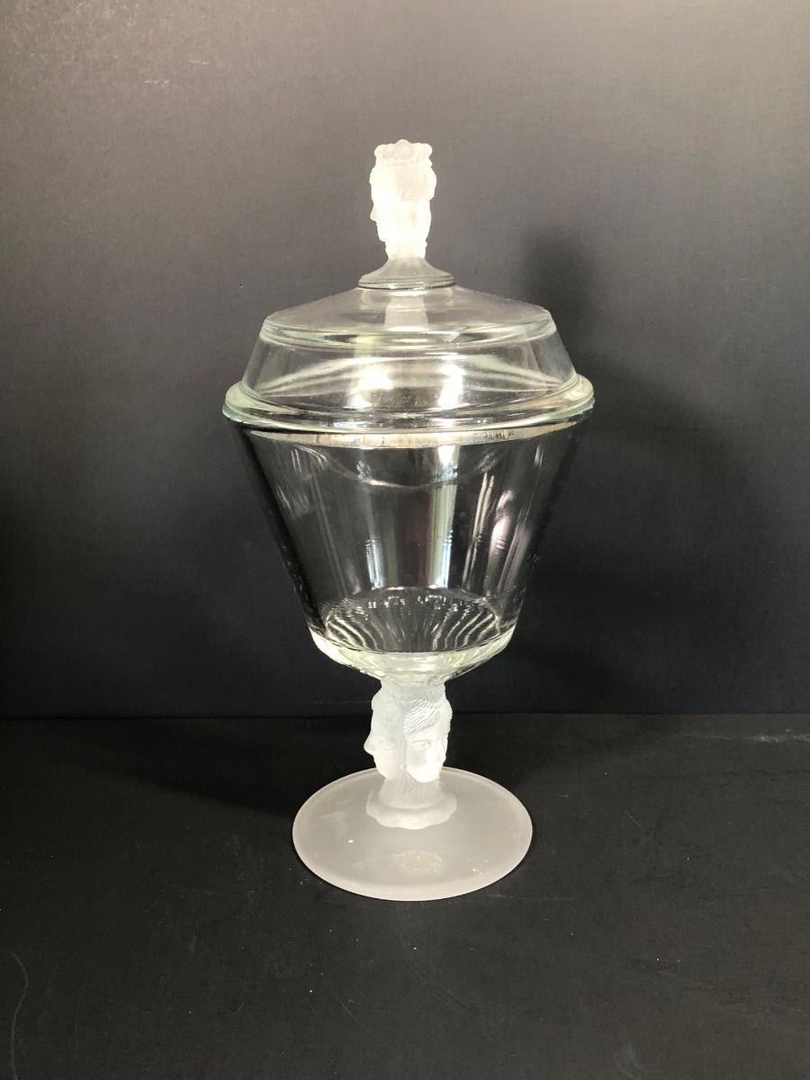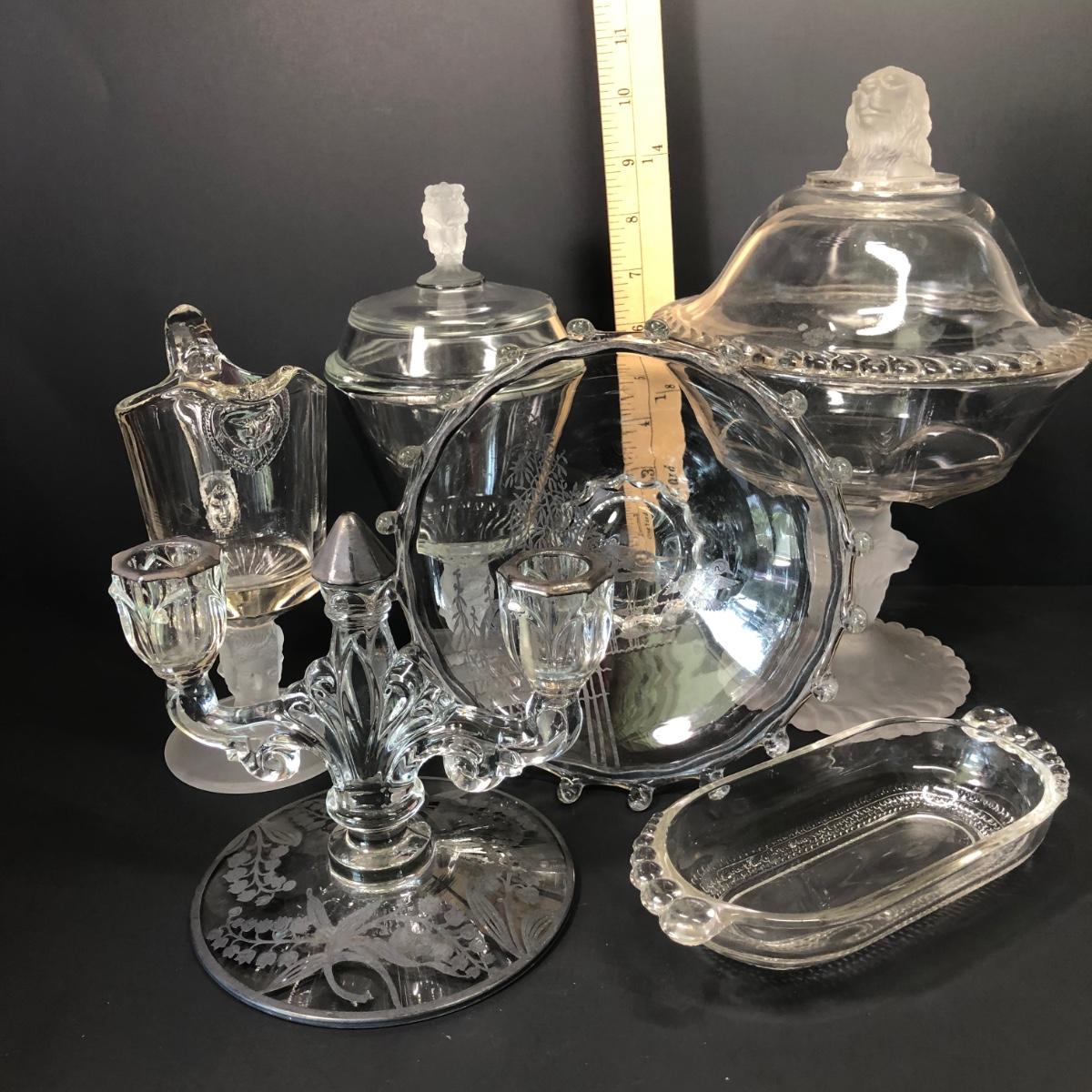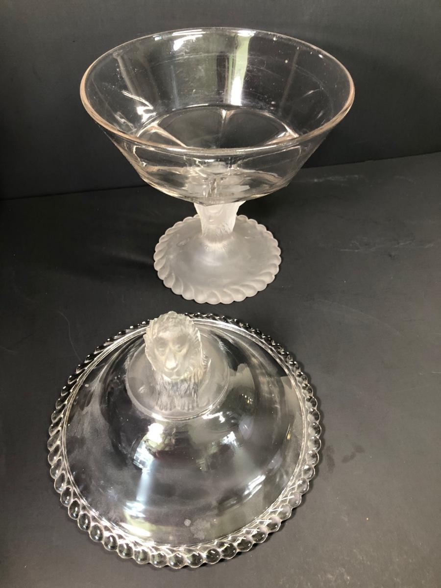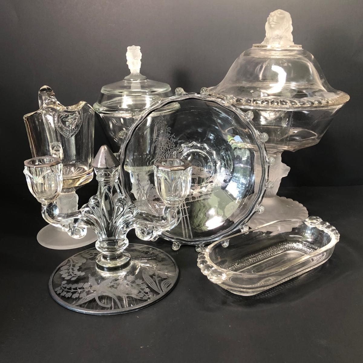 LOT 21M: Unique Glass Collection - Sterling Accented Candle Holder, Lion Head Candy Dish, Duncan 3 Faces Lidded Dish & More