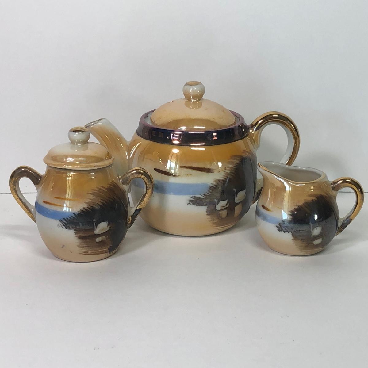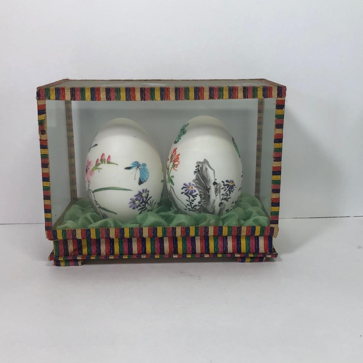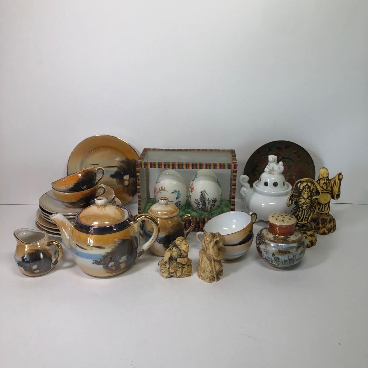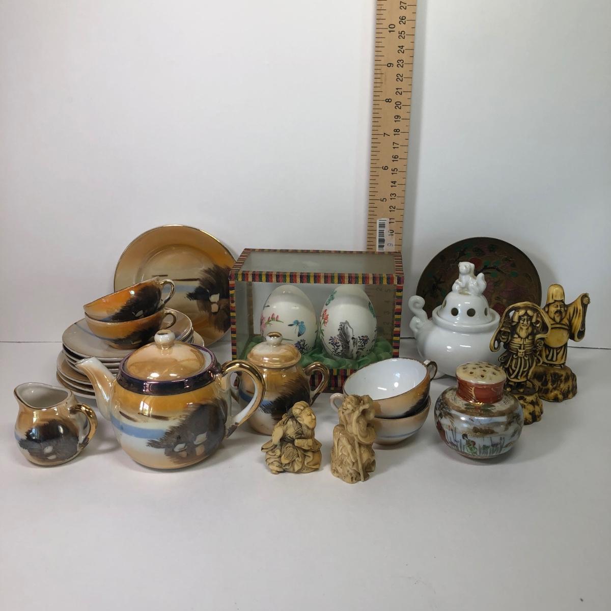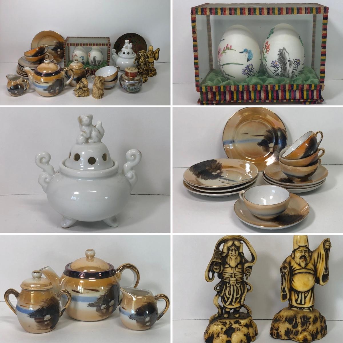 LOT 27M: Painted China Eggs in Display Case, Resin Figures, Tea Set Made in Japan & More