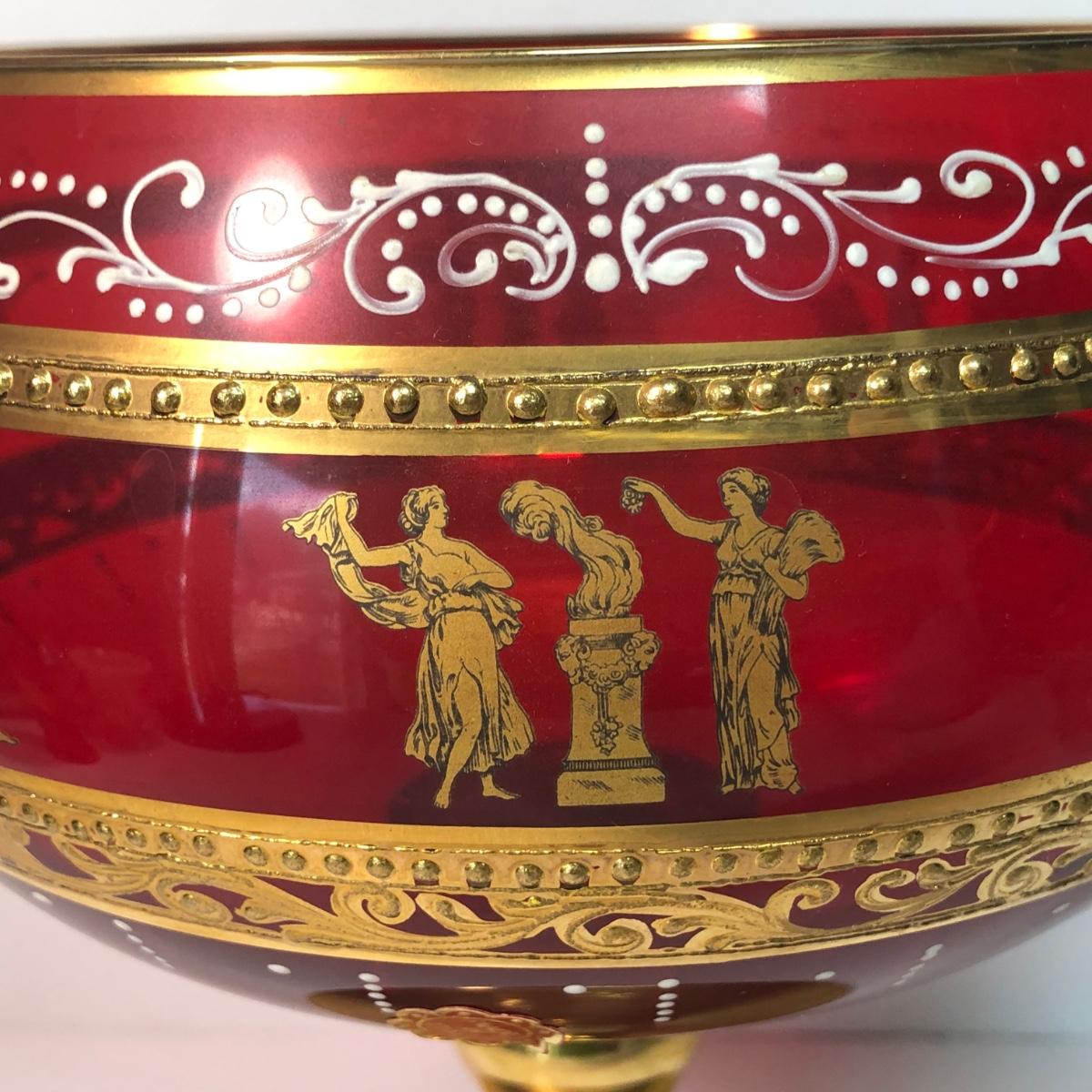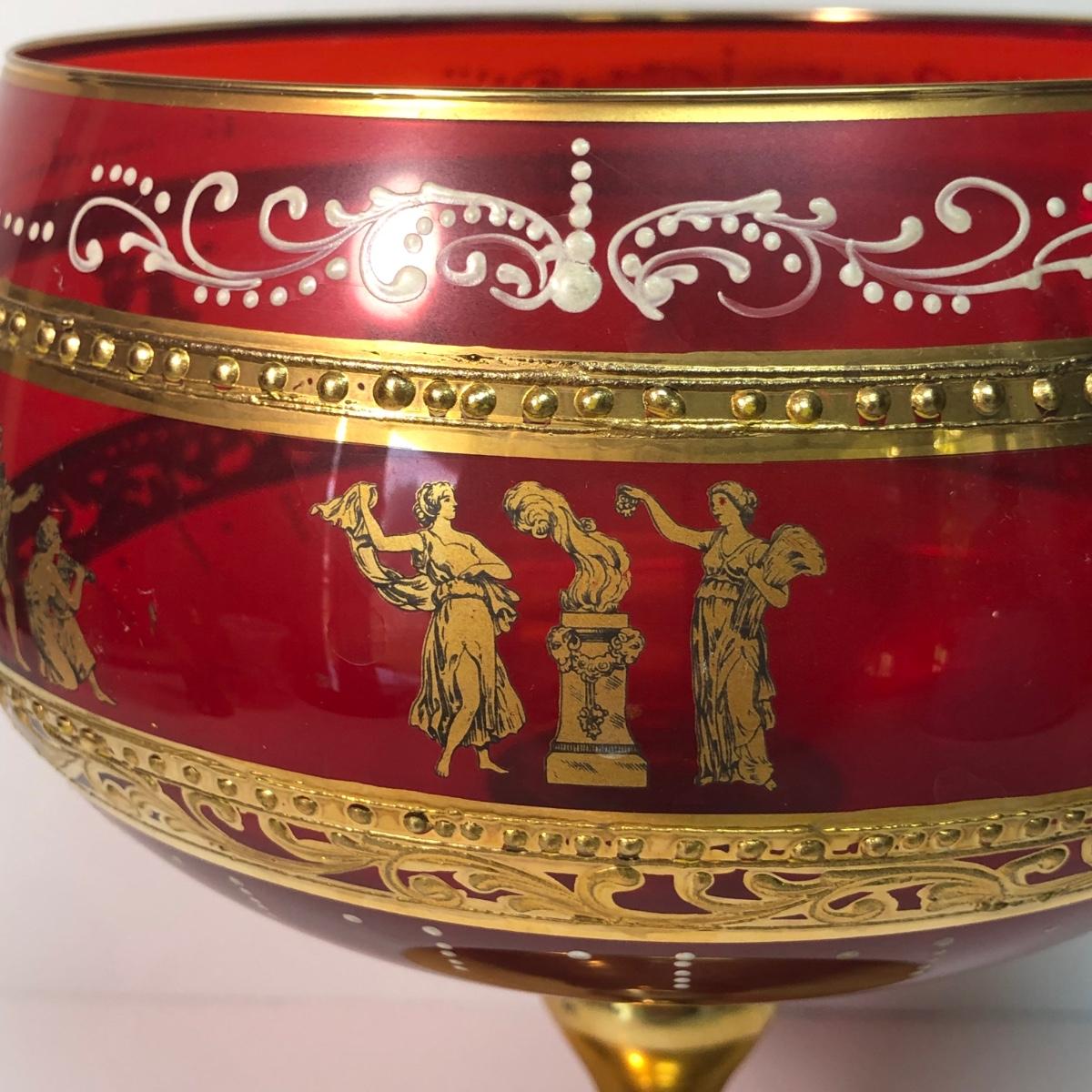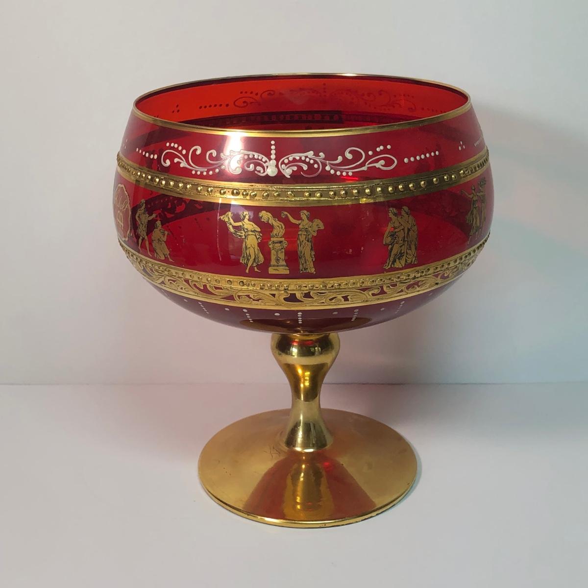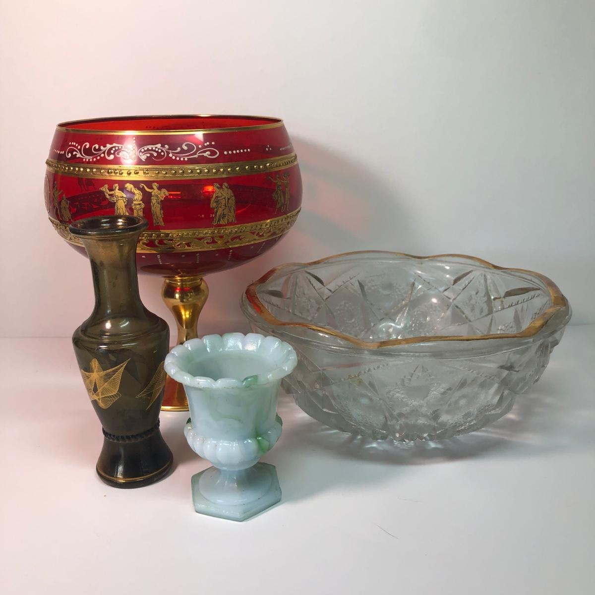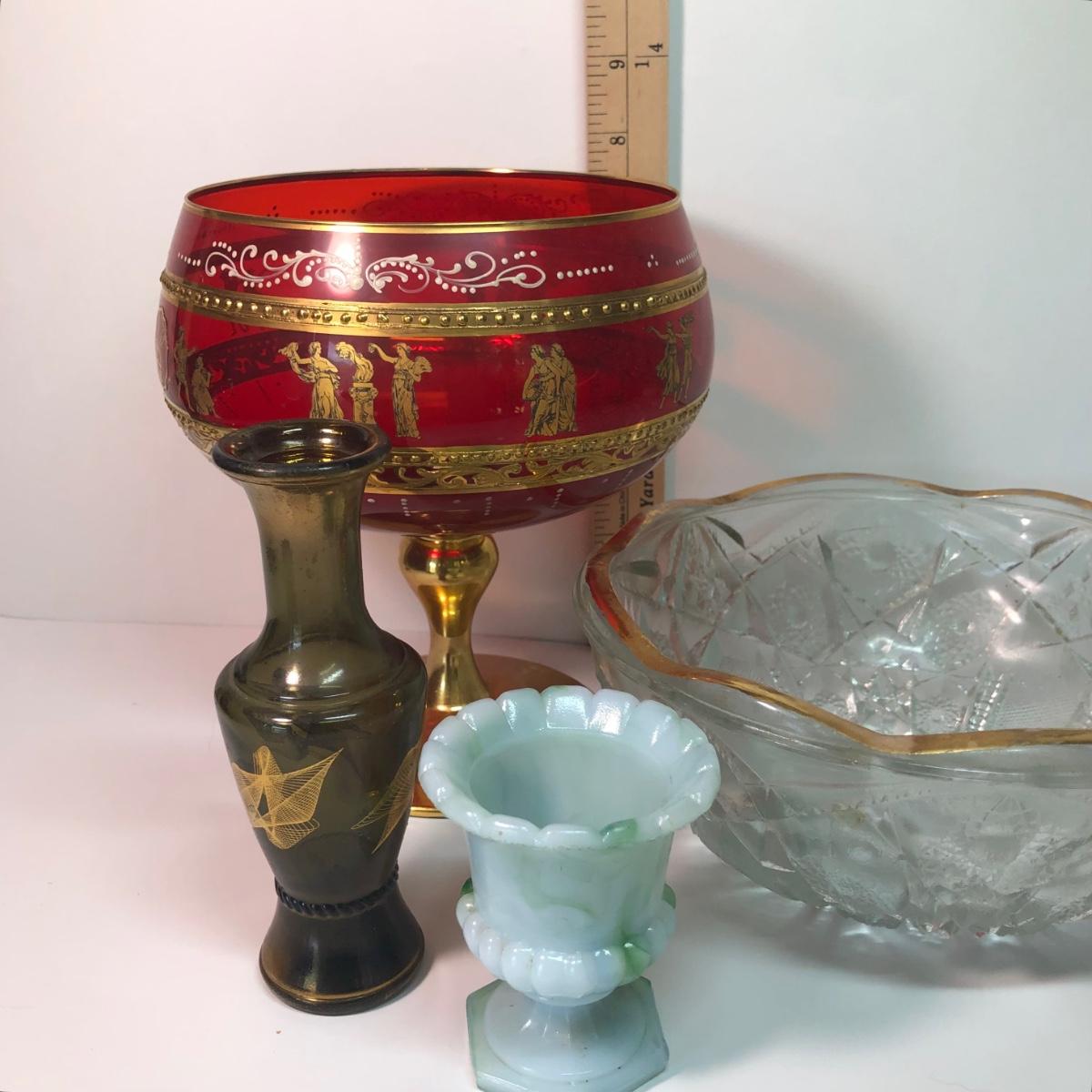 LOT 37M: Large Ruby Glass Roman Goblet, Crystal Bowl w/ Gold Color Rim & More