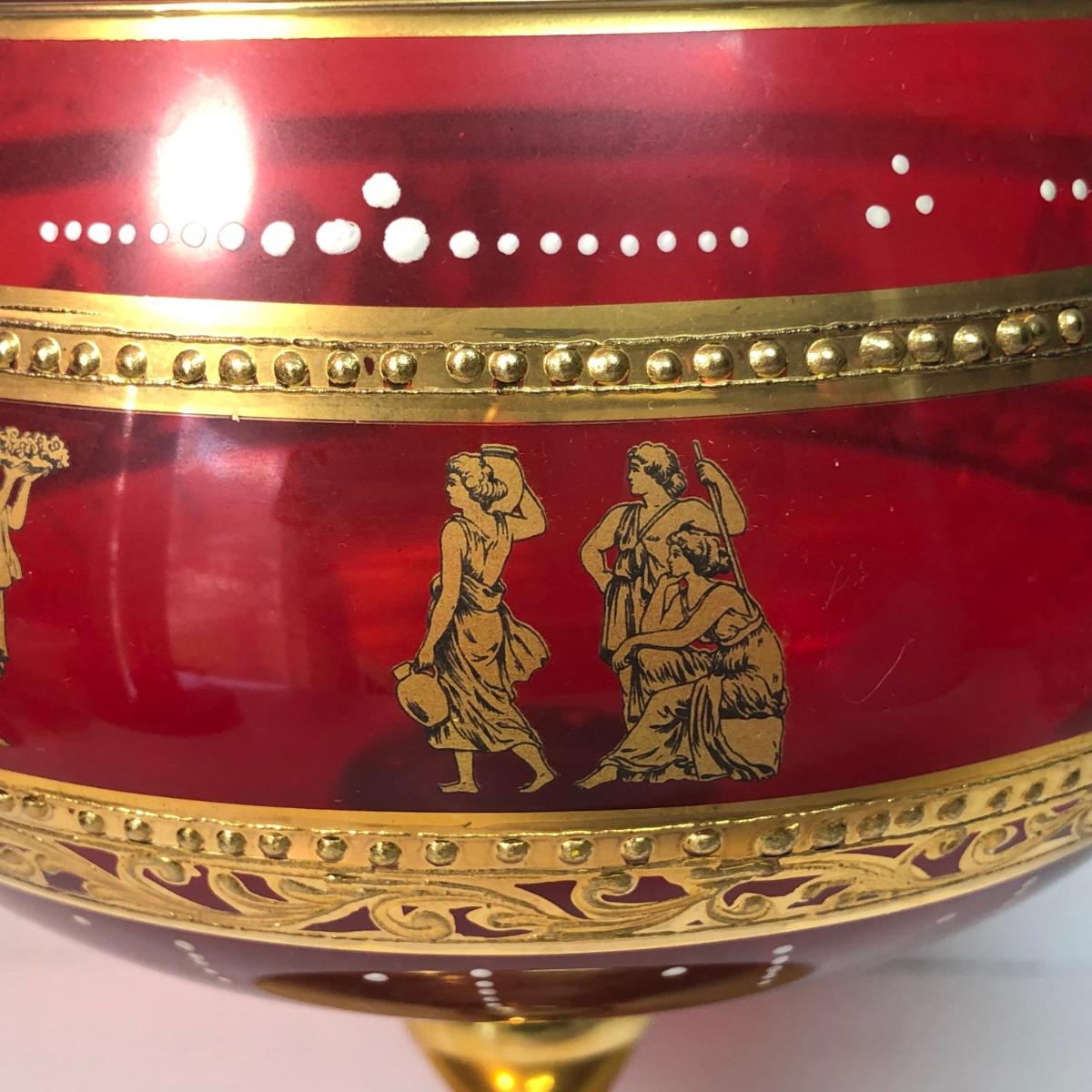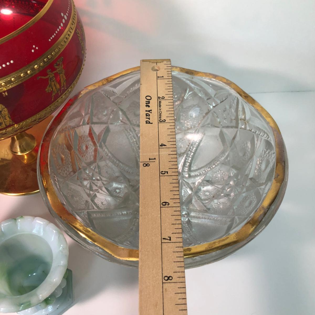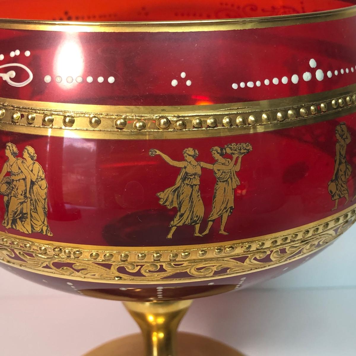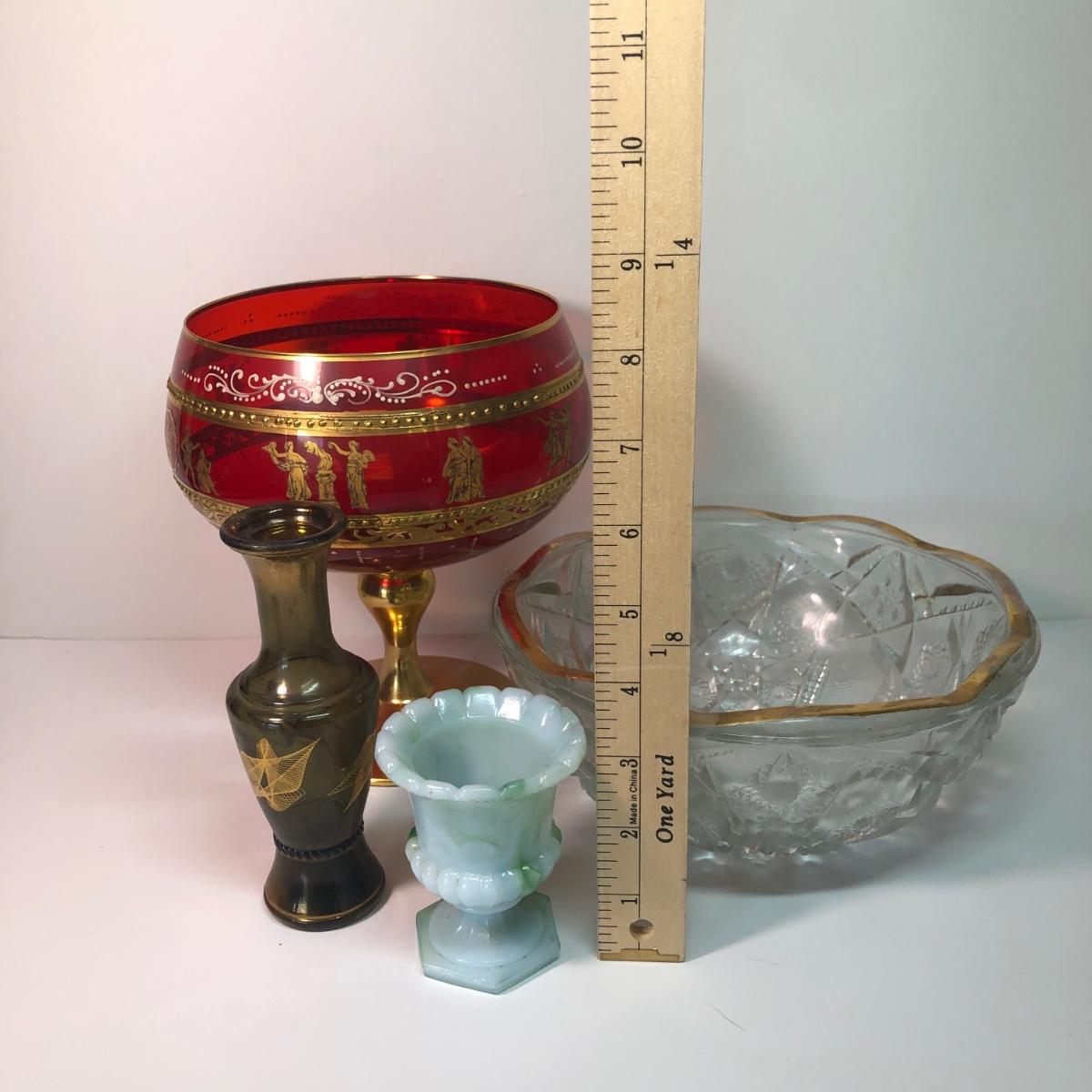 LOT 37M: Large Ruby Glass Roman Goblet, Crystal Bowl w/ Gold Color Rim & More