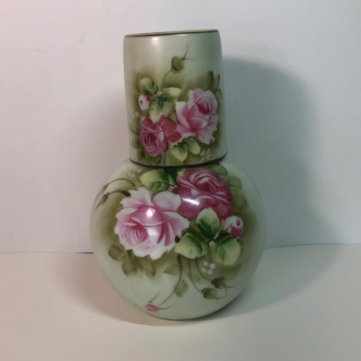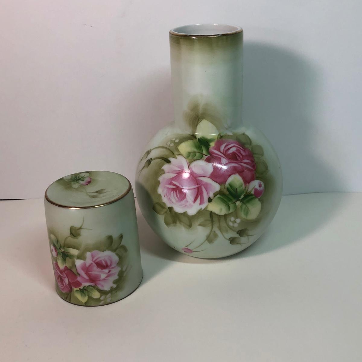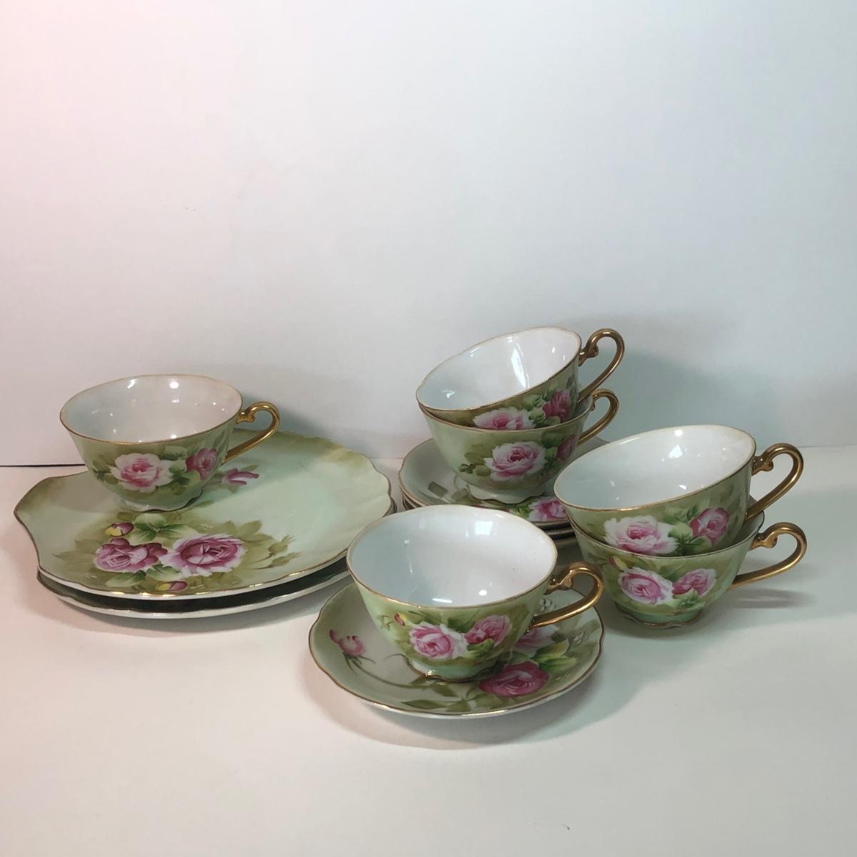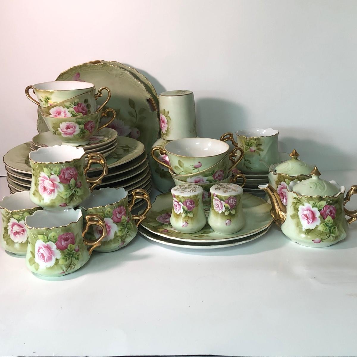 Set includes sugar & creamer (6710), 9 dinner plates (3609), 2 plates (719), a carafe (1266), S&P, 2 plates w/ cup well (3071), 4 small saucers (5680, 6 tea cups, 5 saucers (3067) & 5 mugs.